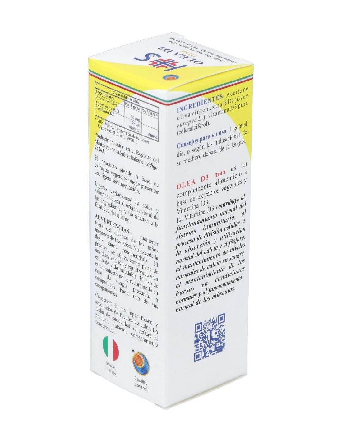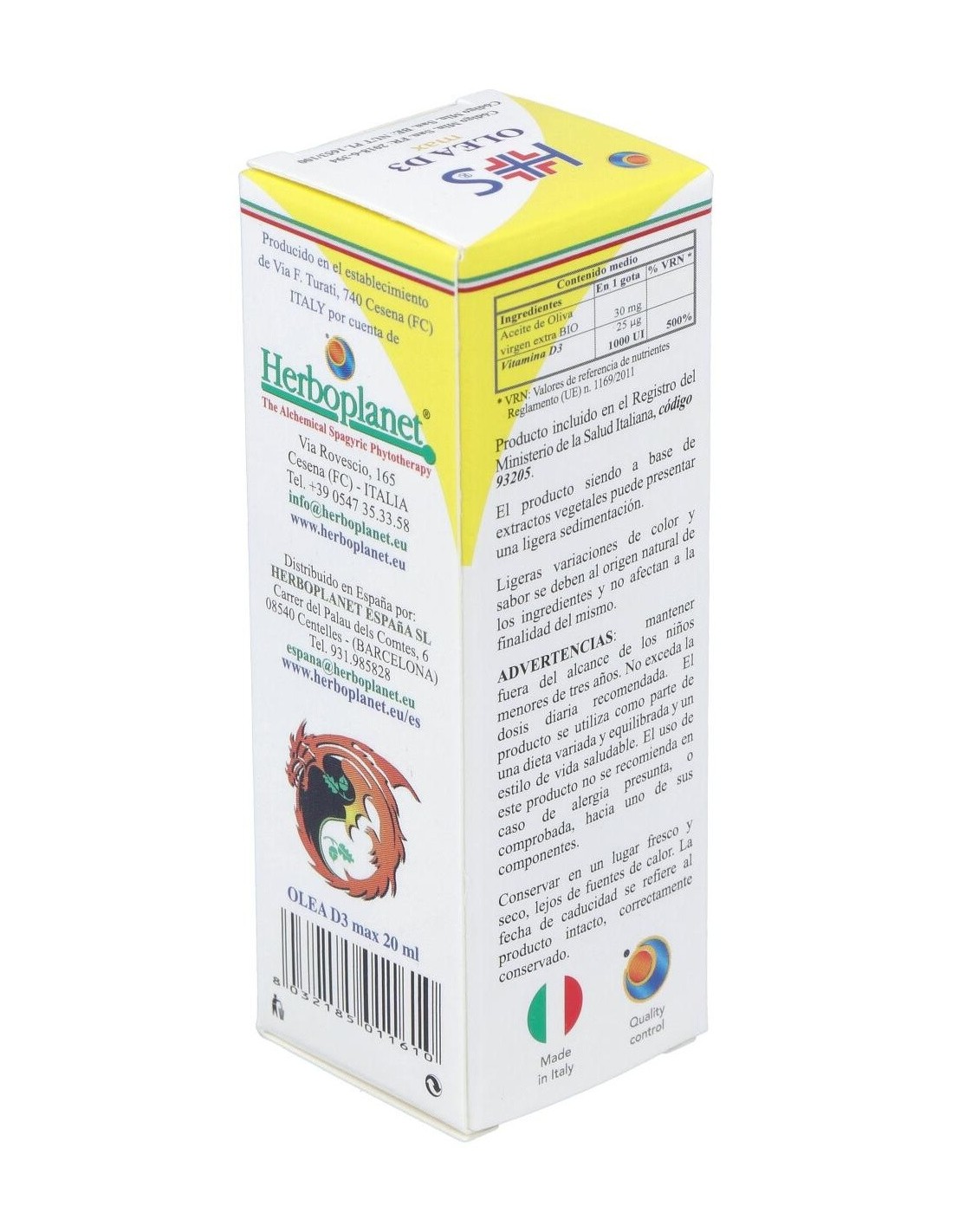Olea D3 Max de Herboplanet es un complemento alimenticio a base de extractos vegetales y Vitamina D3. La Vitamina D3 contribuye al funcionamiento normal del sistema inmunitario, al proceso de división celular, a la absorción y utilización normal del calcio y el fósforo, al mantenimiento de niveles normales de calcio en sangre, al mantenimiento de los huesos en condiciones normales y al funcionamiento normal de los músculos.Altamente liposoluble, se absorbe a nivel del duodeno y del yeyuno. La formulación de Olea D3, con el utilizo del aceite extra virgen de oliva, permite el nivel máximo de absorción. Con una dosis de 10.000 UI por día, lo que corresponde a 10 gotas, administradas durante la comida.Indicado en casos de carencia de vitamina D y calcio, Osteoporosis, Osteomalacia, Retraso en el crecimiento, Raquitismo. Dificultad para consolidar las fracturas. Regulador del sistema inmunológico.Ingredientes:Aceite de Oliva BIO (Olea europea L.) 30 mg, vitamina D3 pura (colecalciferol) 25 µg (1000 UI - 500% VNR).Modo de empleo:Tomar 1 gota directamente en la lengua una vez al día.Presentación:Envase de 20 ml.
