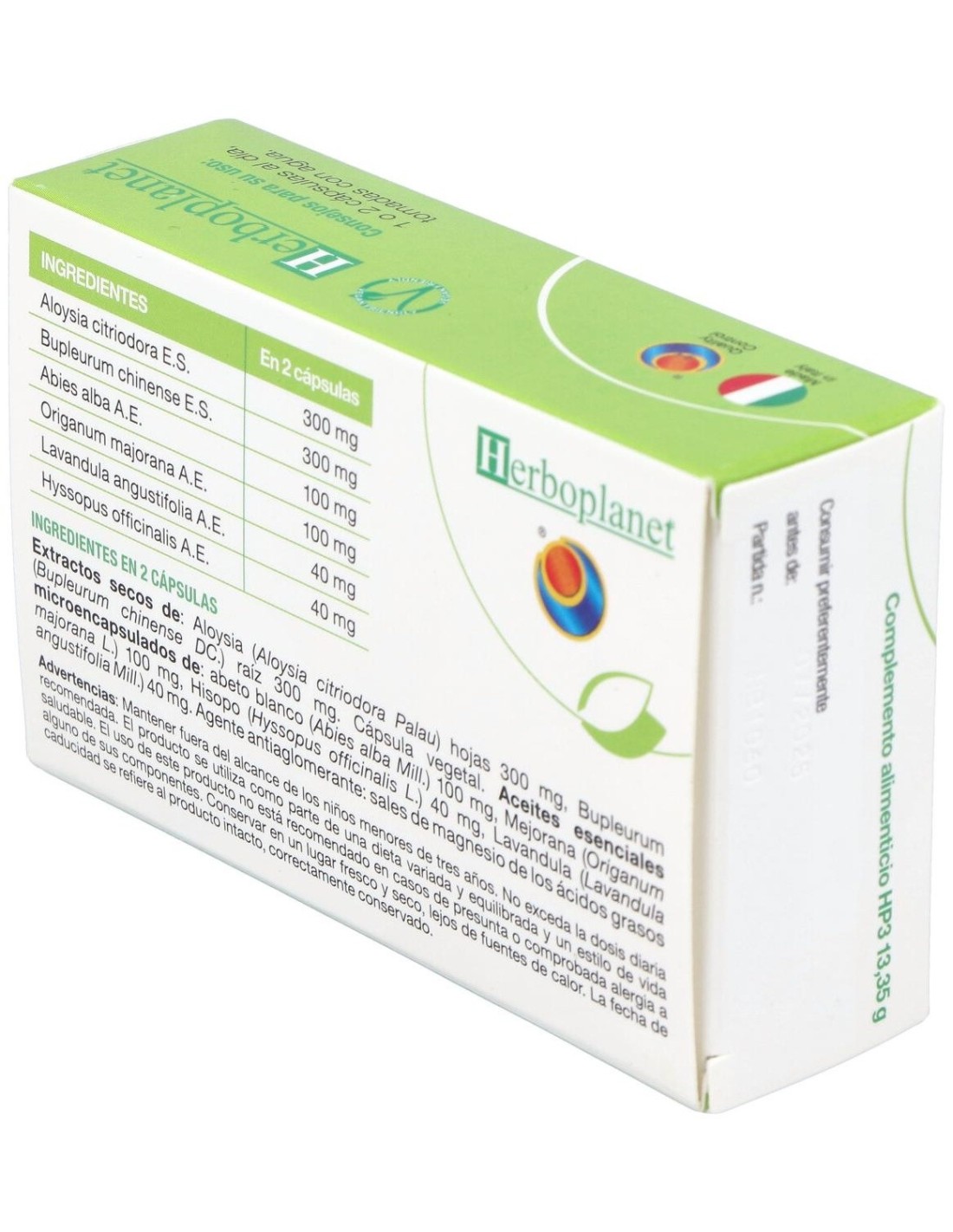 Ingredientes:Extractos secos de: Aloysia (Aloysia citriodora Palau) hojas 300 mg, Bupleurum (Bupleurum chinense DC.) raíz 300 mg. Cápsula vegetal. Aceites esenciales microencapsulados de: Abeto blanco (Abies alba Mill.) 100 mg, Mejorana (Origanum majorana L.) 100 mg, Hisopo (Hyssopus officinalis L.) 40 mg, Lavandula (Lavandula angustifolia Mill.) 40 mg. Agente antiaglomerante: sales de magnesio de los ácidos grasos.Modo de empleo:Tomar 1 o 2 cápsulas al día con abundante agua.Presentación:Envase de 30 cápsulas.