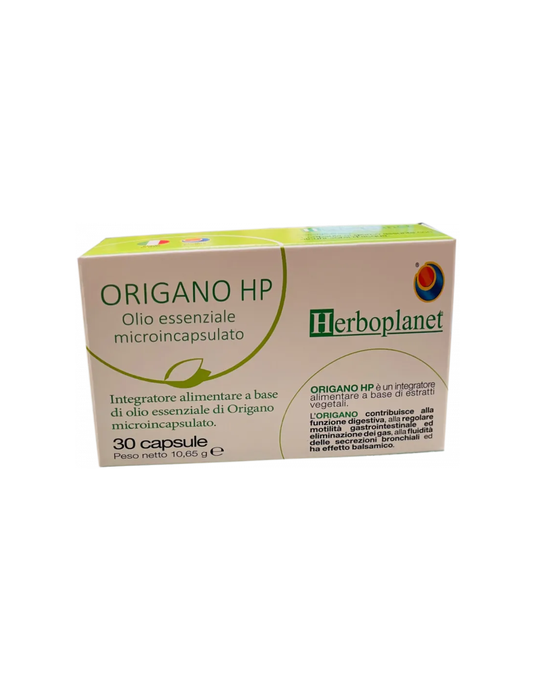Composición activa por cápsula:127,5 mg de aceite esencial de orégano (Origanum vulgare L.).Ingredientes:Agente de carga: celulosa microcristalina. Aceite esencial de orégano (Origanum vulgare L.) 127,5 mg. Hidroxipropilmetilcelulosa. Antiaglomerante: sales magnésicas de ácidos grasos.Modo de empleo:Tomar 1 cápsula al día con agua.Presentación:Envase de 30 cápsulas.Recomendaciones y advertencias:No contiene gluten.