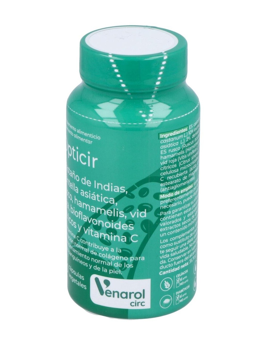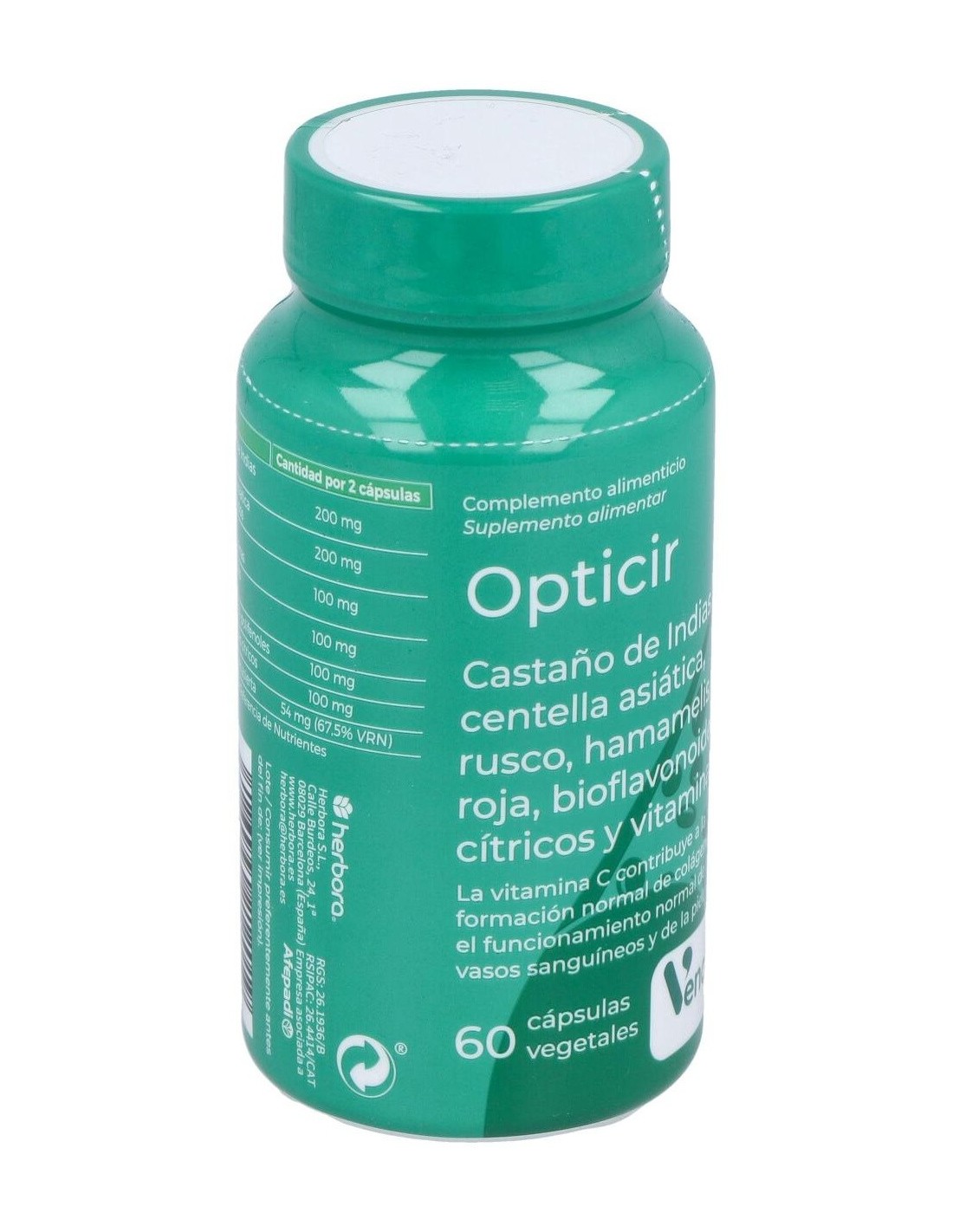 Ma´s de la mitad de la poblacio´n adulta padece insuficiencia venosa, una afeccio´n en la que las venas tienen dificultades para retornar la sangre de las piernas al corazo´n.Opticir facilita el correcto funcionamiento del sistema circulatorio, siendo un tratamiento preventivo y de mejora para problemas circulatorios. Combina en su fo´rmula castan~o de Indias, centella asia´tica, rusco, hamamelis y vid roja, junto con los bioflavonoides ci´tricos y la vitamina C.Con efecto analge´sico y antiinflamatorio, actu´a sobre los vasos sangui´neos, evitando la mala circulacio´n de la sangre y el efecto de piernas cansadas y pesadas.Indicaciones: