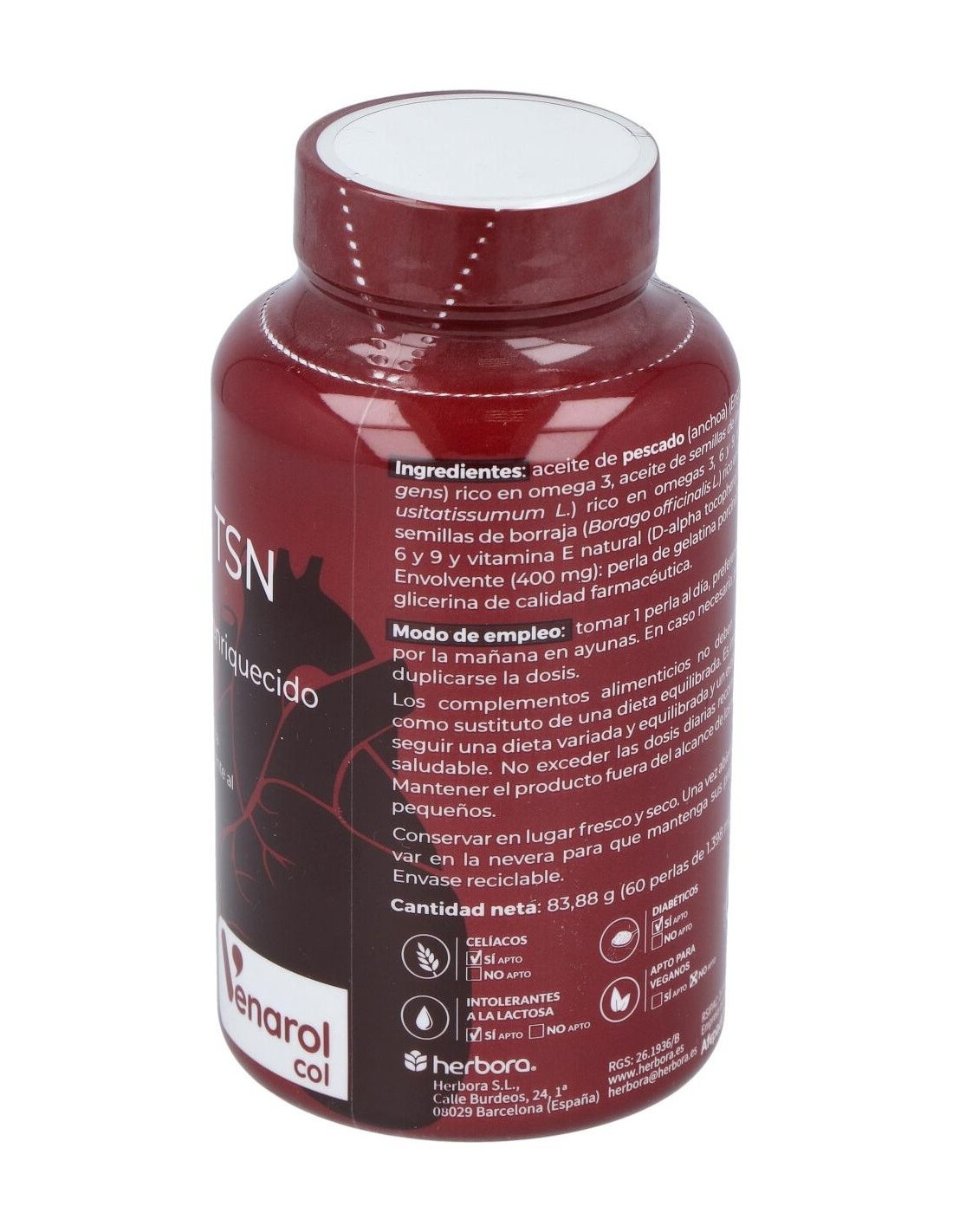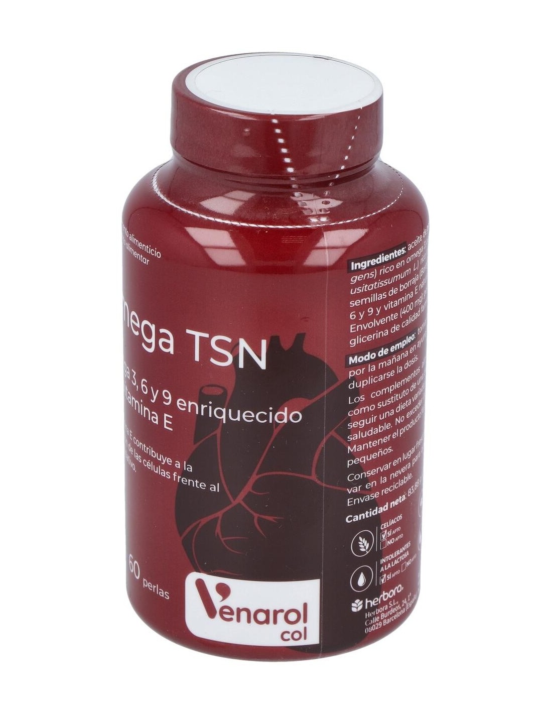 El colesterol es una sustancia grasa natural presente en todas las ce´- lulas del cuerpo humano necesaria para el normal funcionamiento del organismo. Sin embargo, cuando sus niveles en sangre se elevan pueden producir problemas cardiovasculares.Omega TSN aporta a´cidos grasos poliinsaturados omega, obtenidos de fuentes naturales, que forman parte de los elementos ma´s indis- pensables para el correcto funcionamiento del corazo´n y optimiza- cio´n en los niveles de colesterol. Dentro de estos a´cidos grasos esta´n los omega-3 y los omega-6, considerados esenciales, ya que nuestro organismo no los puede sintetizar. Otro grupo son los omega-9 (grupo del a´cido oleico), que completan una excelente fo´rmula para combatir las patologi´as cardiovasculares.Los aceites grasos de omega 3 utilizados en Omega TSN, provienen del pescado azul, concretamente de las anchoas. Gracias a la ma´xi- ma filtracio´n y taman~o del pescado utilizado, estos aceites tienen certificada su baja proporcio´n de metales pesados y contaminantes.La vitamina E liposoluble en esta fo´rmula actu´a como antioxidante, incrementando en sangre la tasa de omegas 3-6-9. Indicaciones:Mantiene un corazón sano y libre de exceso de colesterol. Composición activa por perla: