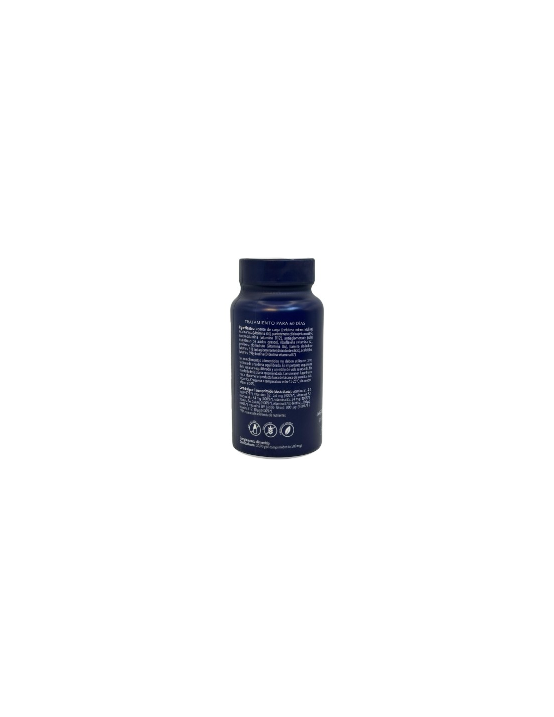- Complejo B completo: Contiene todas las vitaminas del grupo B (B1, B2, B3, B5, B6, B7, B9, B12) en una sola toma diaria.