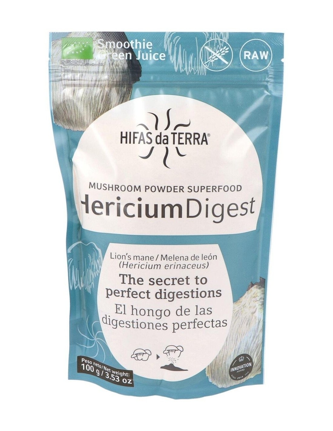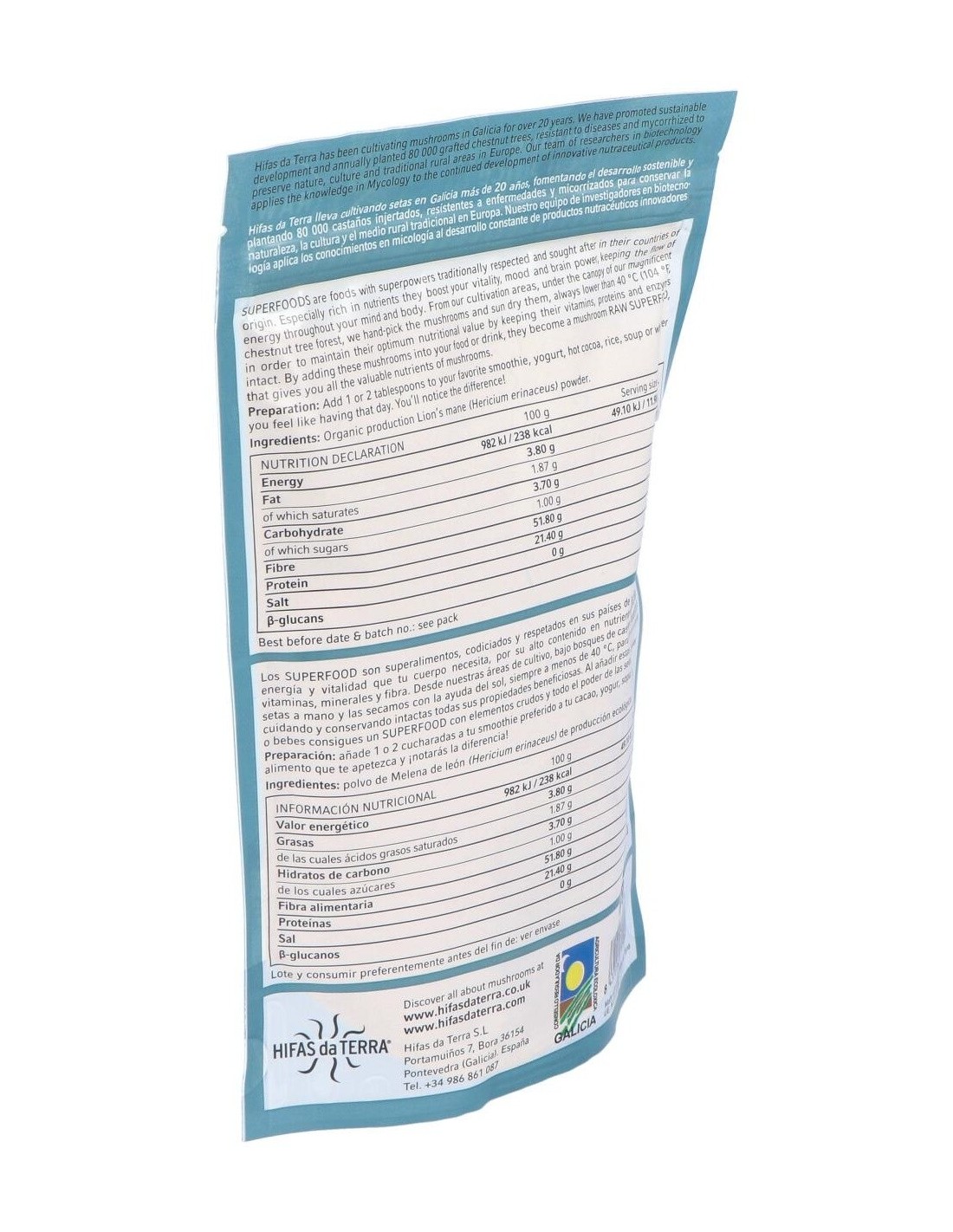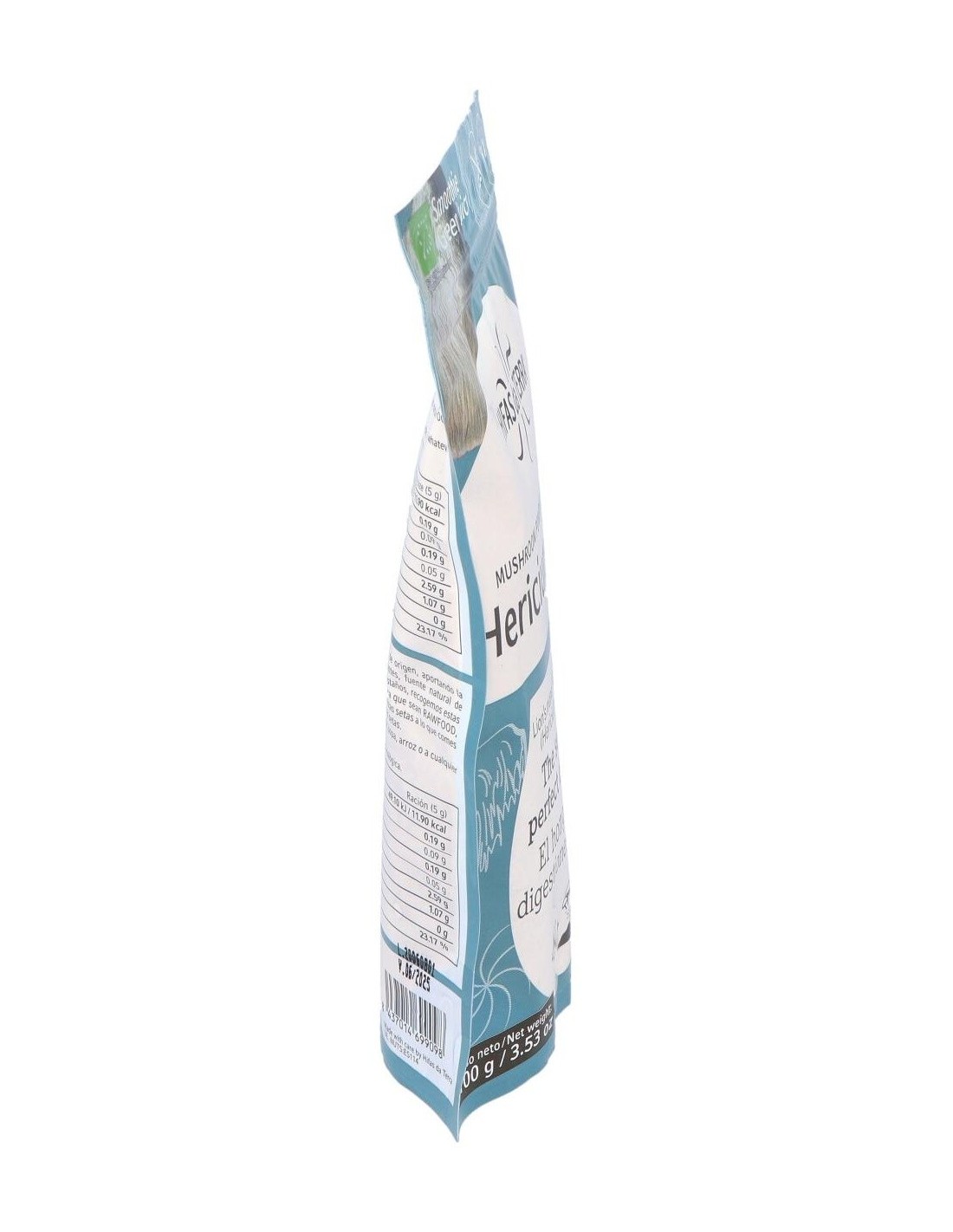 Alimento ecológico elaborado con polvo de hongo melena de león. La melena de león o hericium erinaceus, es un hongo con propiedades medicinales, ayuda a la recuperación de las heridas provocadas en el sistema nervioso estimulando el crecimiento y la reparación de las neuronas. Es una fuente natural de proteínas, fibras y polisacáridos. Producto ecológico certificado por la Unión Europea. Además es apto para celiacos, intolerantes a la lactosa, veganos y vegetarianos.