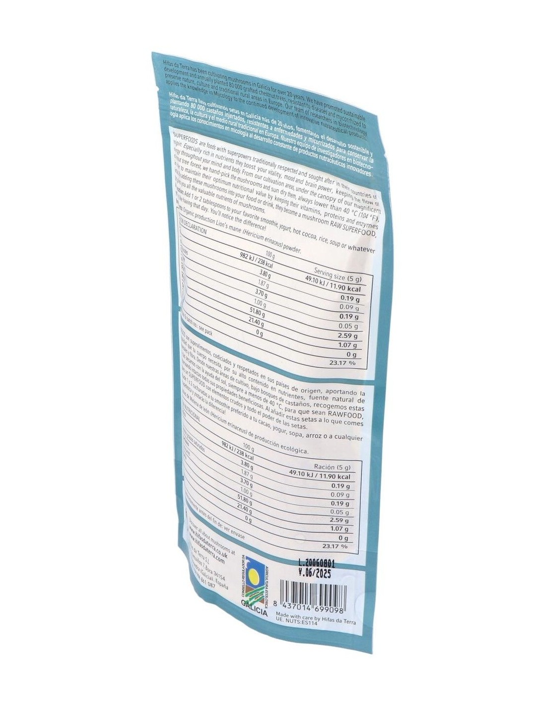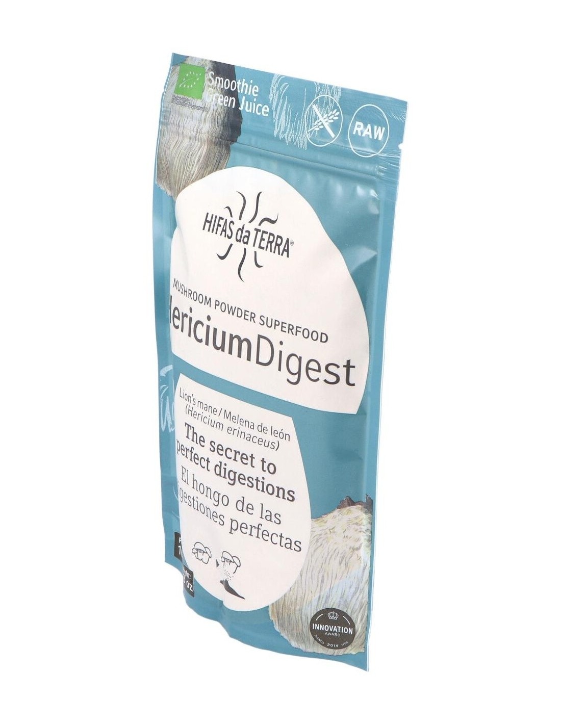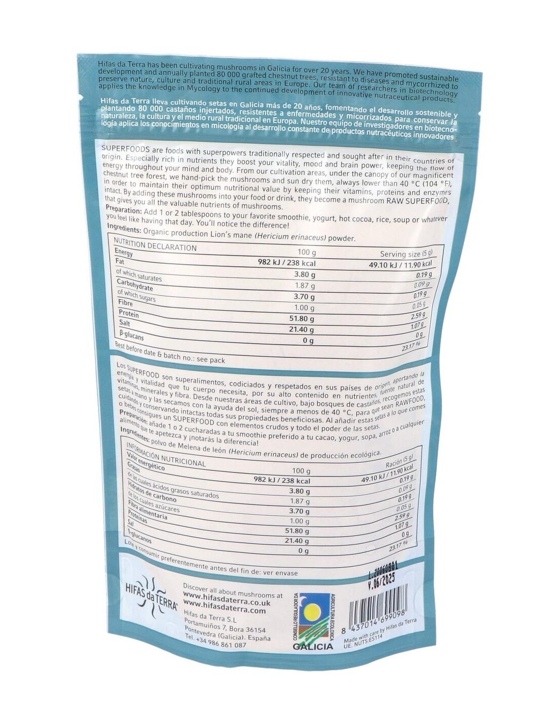Alimento ecológico elaborado con polvo de hongo melena de león. La melena de león o hericium erinaceus, es un hongo con propiedades medicinales, ayuda a la recuperación de las heridas provocadas en el sistema nervioso estimulando el crecimiento y la reparación de las neuronas. Es una fuente natural de proteínas, fibras y polisacáridos. Producto ecológico certificado por la Unión Europea. Además es apto para celiacos, intolerantes a la lactosa, veganos y vegetarianos.
