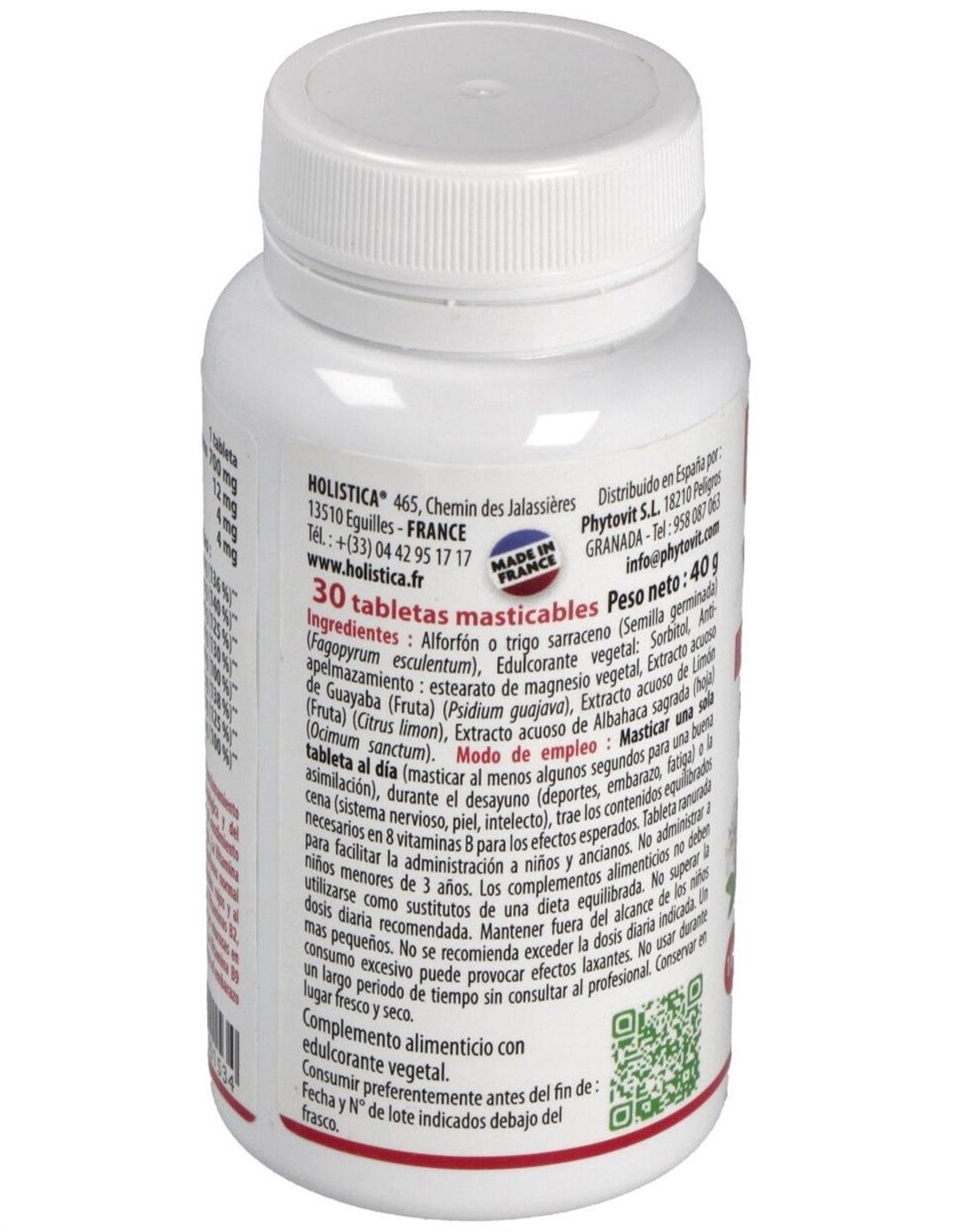 Elaborado con granos germinados de Trigo Sarraceno, de la Guayaba, del Limón y de la Albahaca Sagrada, esta fórmula innovadora, concentrada en una sola toma al día, ha sido especial y únicamente concebida con extractos de plantas, sin añadir de forma suplementaria vitaminas B sintéticas ni aditivos artificiales. Las 4 plantas seleccionadas conforme al muy riguroso proceso de calidad Holística se extraen sin otro disolvente que el agua para concentrar sus 8 vitaminas B y cubrir de manera equilibrada al 100% las necesidades en 1 solo comprimido al día. Para una buena asimilación, se recomienda Ultra Vegan B en forma masticable para: v Los deportistas con el fin de responder a sus necesidades respecto a esas vitaminas que contribuyen al metabolismo energético normal (B1), en vitamina B6 implicada en el metabolismo normal de proteínas, en B9 para la síntesis de los aminoácidos, en B2, B6 y B12 para el mantenimiento y la formación de los glóbulos rojos (que transportan el oxígeno).v Los vegetarianos y veganos en los que la alimentación pobre en vitamina B12 debe ser completada.v Los mayores porque la vitamina B5 ayuda al comportamiento intelectual normal y a reducir la fatiga.v Las mujeres en cinta o que deseen estarlo, en las que las necesidades de B9 se han incrementado.v La belleza de la piel y del cabello..v Los estudiantes y todos aquellos que quieren completar su régimen alimentario de vitaminas B. Granos Germinados de Trigo SarracenoEl Trigo Sarraceno se cultiva en Francia desde el siglo XV. Sus granos germinados, desprovistos de gluten, no forman parte de la familia de los cereales gramíneos sino de las poligonáceas. Son muy apreciados por sus propiedades nutricionales superiores a las semillas vírgenes: su nivel de vitaminas B ha aumentado en gran manera a raíz de la germinación. No obstante, no es siempre fácil asegurar su propia cultura de semillas vírgenes en su cocina del día a día. El concentrado de esas semillas germinadas utilizado en la fabricación de comprimidos Uultra Vegan B suministra en un solo comprimido, las vitaminas B3, B8 y B12 que el organismo necesita cada día. Con 9 g de proteínas por 100 g, la semilla germinada de trigo sarraceno es también una fuente bastante más noble que la simple harina de sarraceno. Además, su vitamina B12 se presenta bajo su forma natural de Methylcobalamin directamente utilizable por el organismo y no bajo la forma de cianocobalamina proveniente de la química sintética, comercialmente la Vit. B12 es la más habitual. Respecto a la vitamina B9 del trigo sarraceno germinado, se presenta bajo forma de folatos naturales de forma que la biodisponibilidad es superior a los monoglutamilfolatos de síntesis. Albahaca SagradaEs una especie de planta herbácea de la familia de las Lamiaceae. La albahaca sagrada no tiene nada que ver por lo tanto con nuestra albahaca común. Ese pequeño arbusto, con hojas finas y delicadas, ocupa un lugar destacado en cada hogar indio y la mayoría la pone para tomarla bajo la forma de infusión como alternativa al te. La tradición ayurvédica le reconoce numerosas virtudes. La albahaca sagrada es rica en vitamina B3 particularmente útil en el sistema nervioso. Sinergia entre la Guayaba, la Albahaca Sagrada y el LimónLa guayaba es un fruto comestible tropical originario de América, y de África. La guayaba es rica en particular en Vit. B1, B2, B5 y B6). Asociada a la albahaca sagrada y al pericarpio de limón por su concentración en Vit. B3 y B9, esa mezcla de extractos suministra de este modo el conjunto de vitaminas B en proporciones equilibradas entre ellas y las cuales Holística ha sabido manifestar, con el propósito de cubrir en una toma al día, el 100% de las necesidades de cada una de esas vitaminas B. La vitamina B9 (folatos) se presenta de forma natural en el pericarpio del limón con sus cofactores. Las vitaminas del grupo B mejoran al asociarse de manera equilibrada y de los recursos naturales, más que de aquellos que están aislados y que son sintéticos. Ingredientes activos por comprimidos: