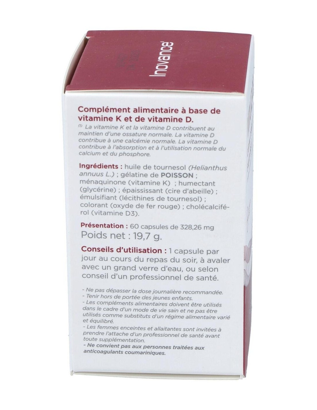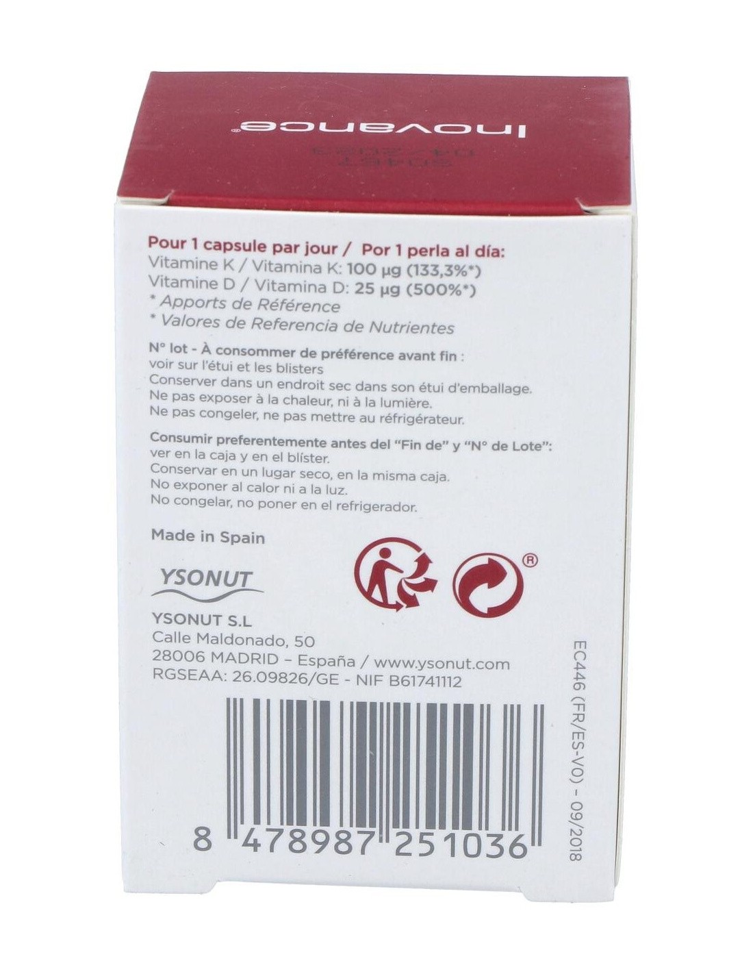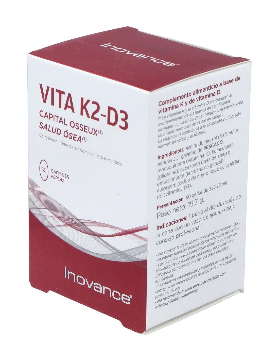 Inovance Vita K2 D3 Salud Ósea 60caps es un complemento alimenticio que contribuye a la salud normal de los huesos, gracias a su fórmula rica en vitaminas K y D.