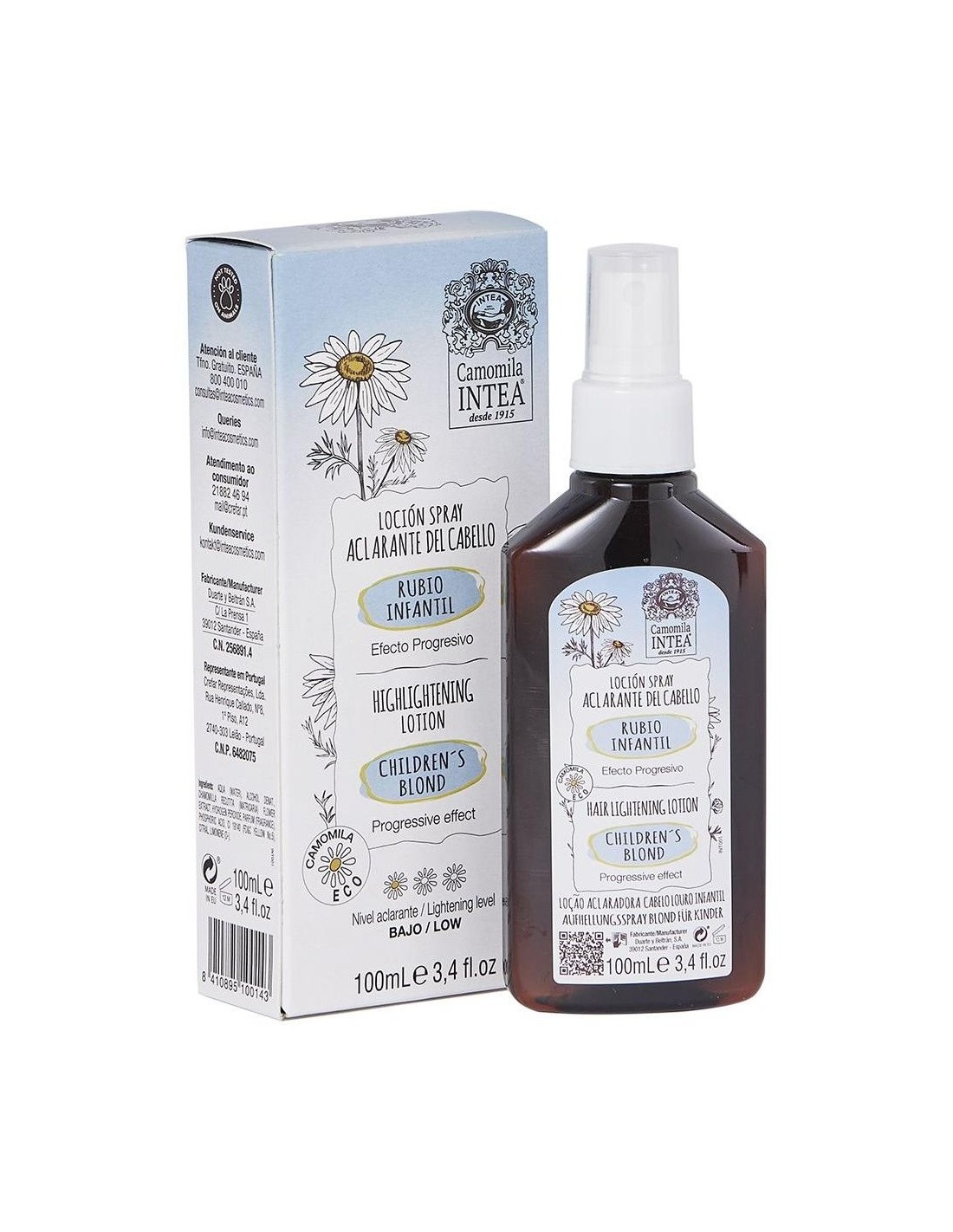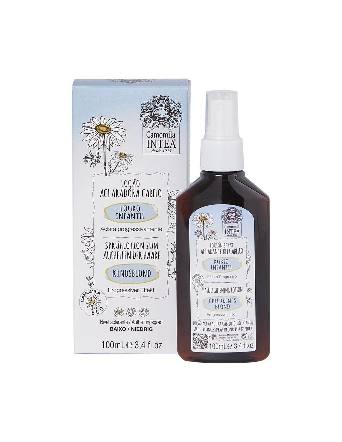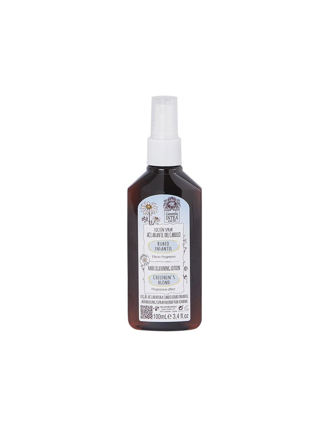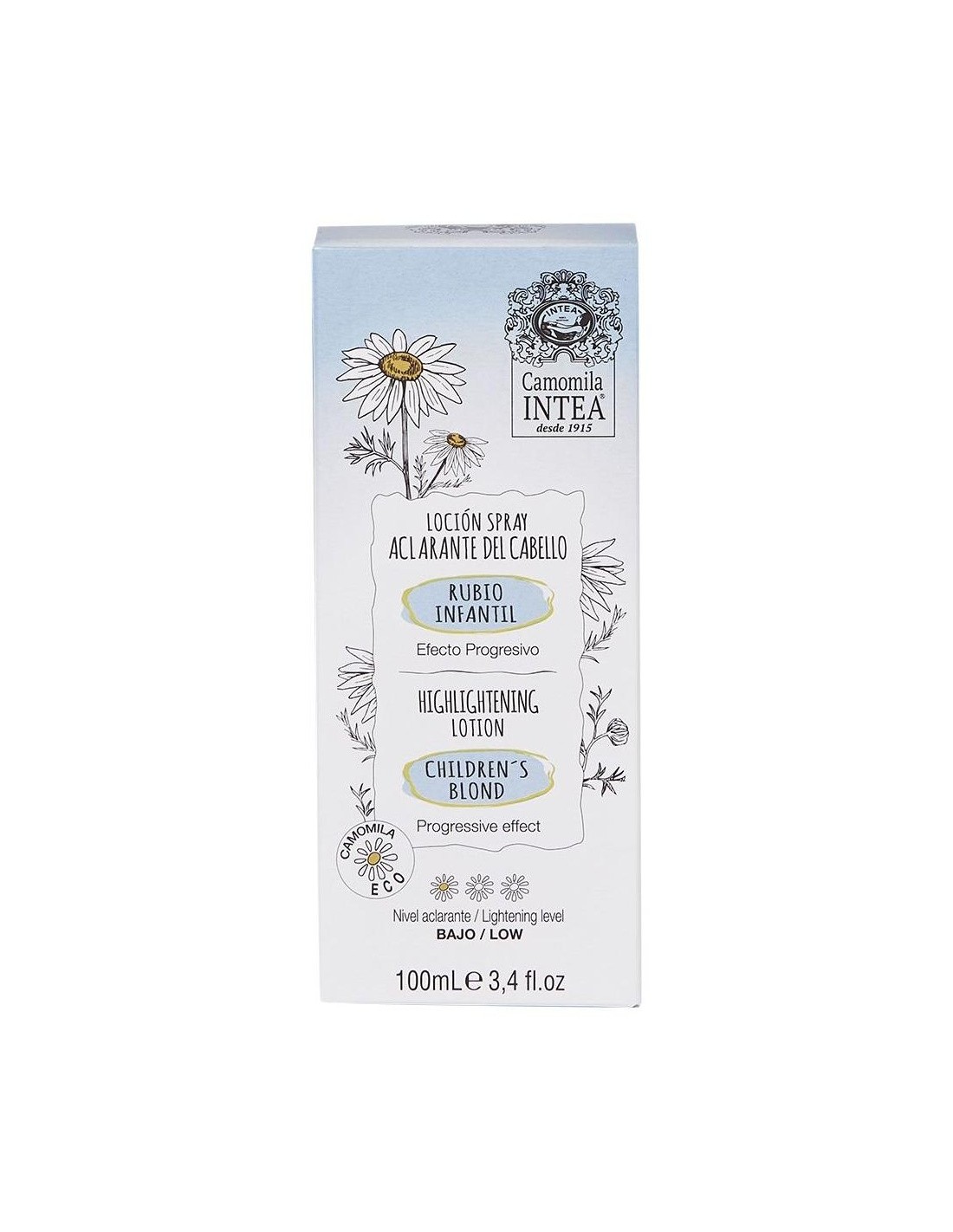 Intea Camomila Loción Aclarante Rubio Infantil 100ml es un spray con extracto natural ECO de flores de camomila, que ayuda a aclarar el delicado cabello castaño o rubio oscuro de los más pequeños.