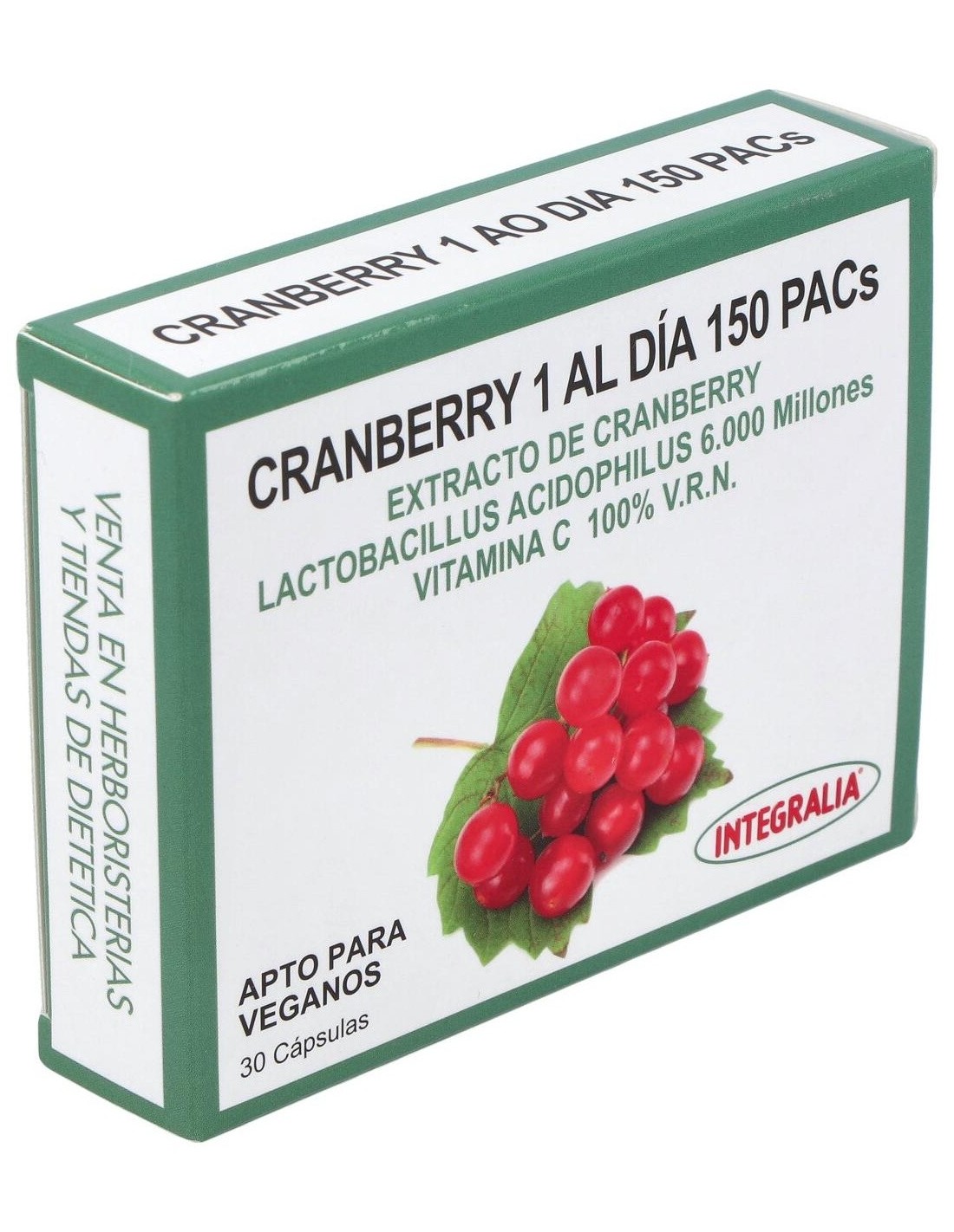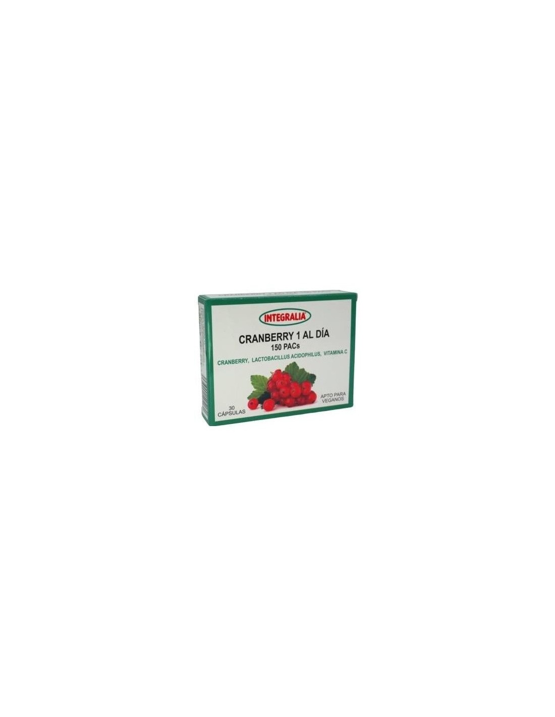 Cranberry 1 Al Dia 150Pacs 30Cap. de Integralia es un suplemento para adultos que contribuye al bienestar urinario diario, formulado con extracto de arándano para apoyar la salud del tracto urinario.