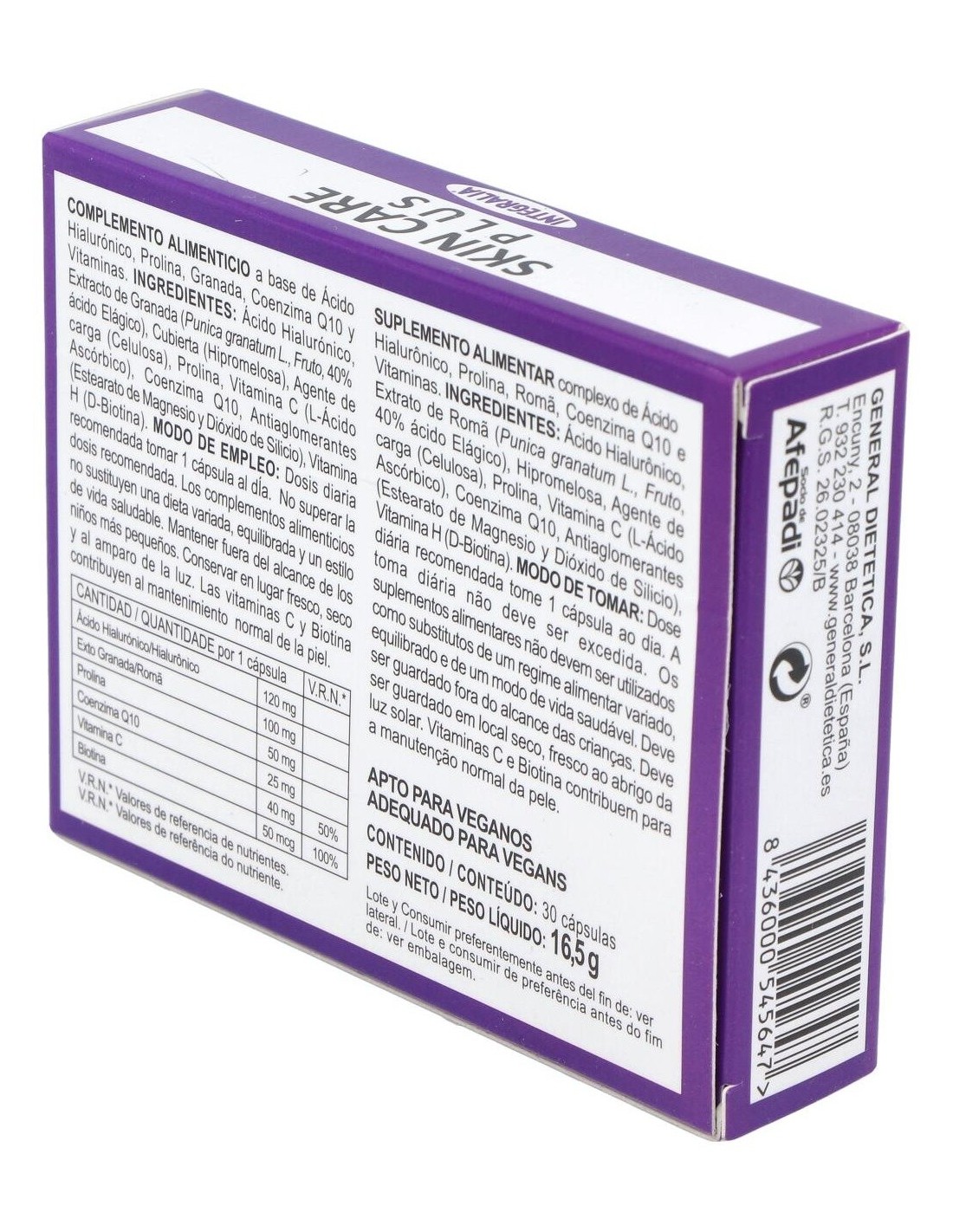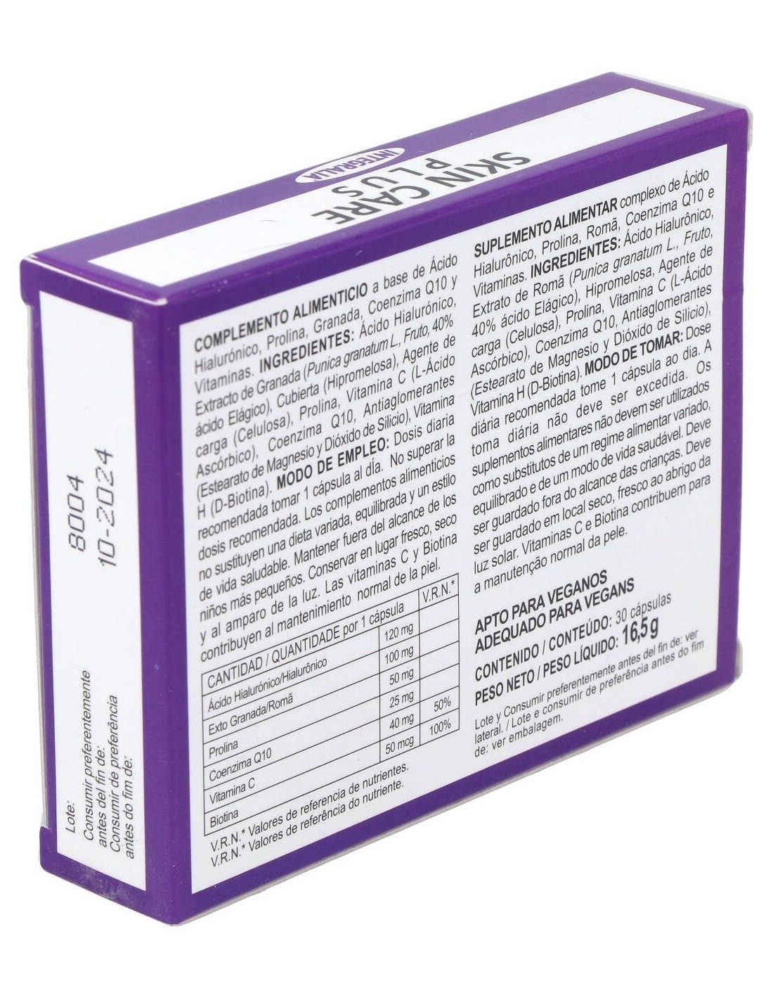Ácido Hialurónico 120 mg, Exto Granada (Punica Granatum L, Fruto , 40% ácido Elágico) 100 mg, Prolina 50 mg, Coenzima Q10 25 mg, Vitamina C (L-Ácido Ascórbico) 40 mg (50% V.R.N*), Biotina (Vitamina H) 50 mcg (100% V.R.N*).