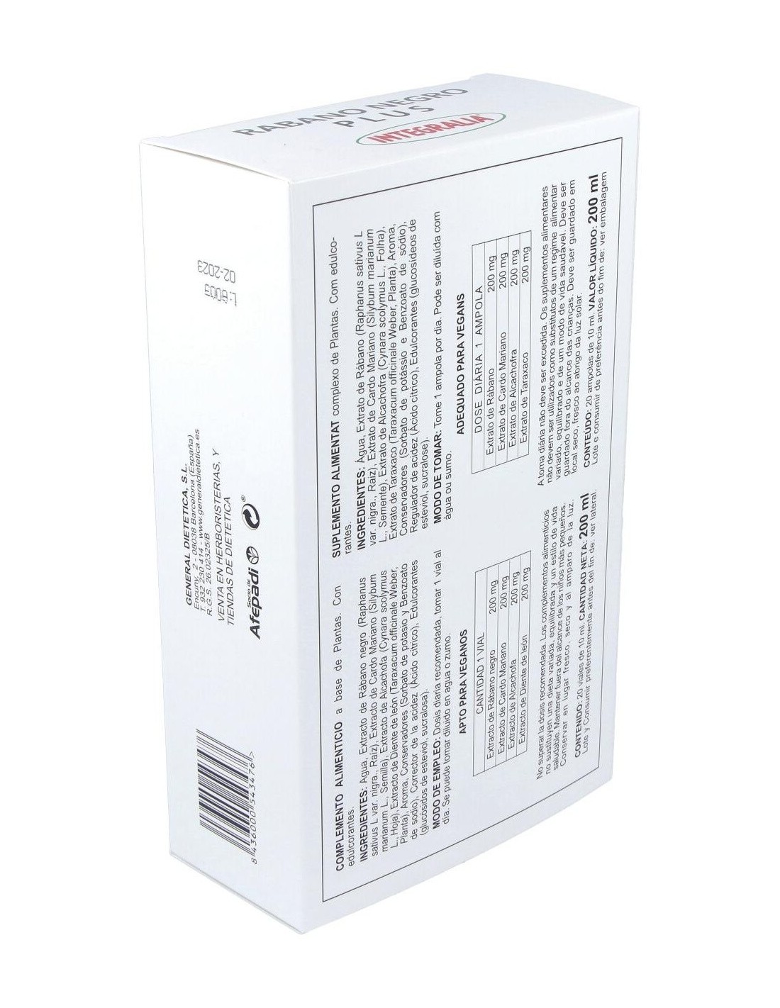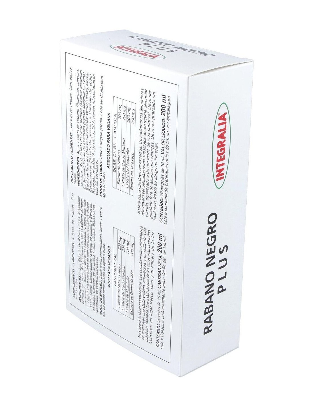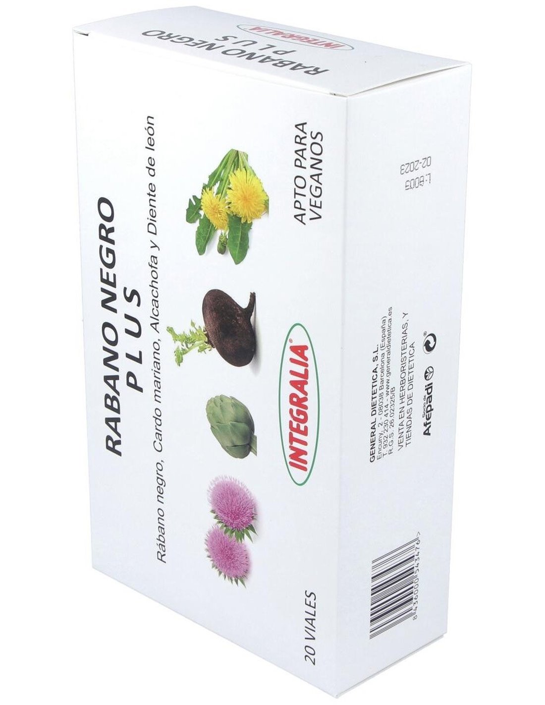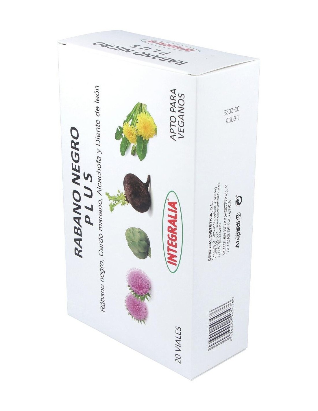 El Rabano Negro Plus 20 Viales de Integralia es un complemento natural para personas que buscan apoyar la función hepática, formulado con extracto concentrado de rábano negro para favorecer la digestión y el bienestar general.