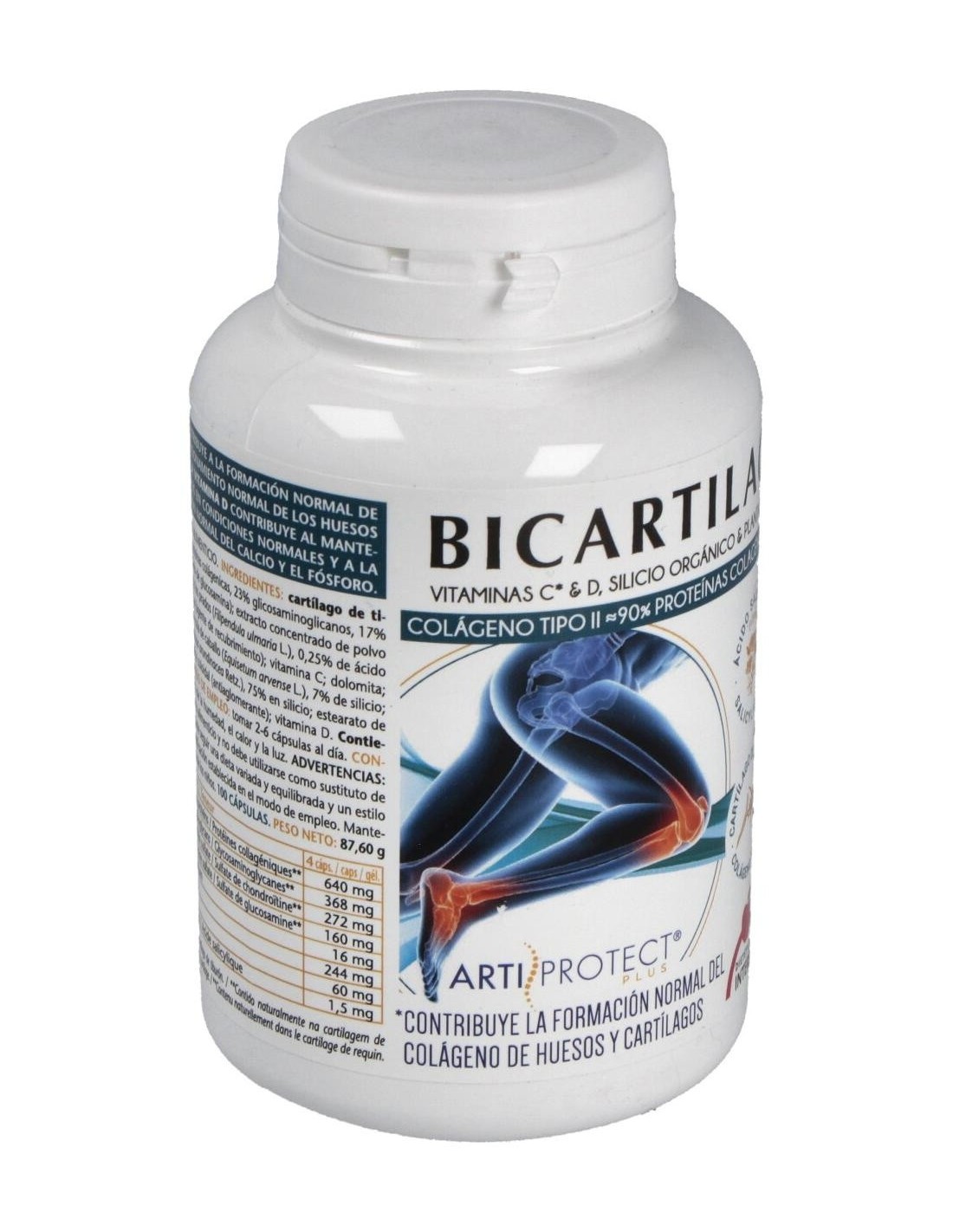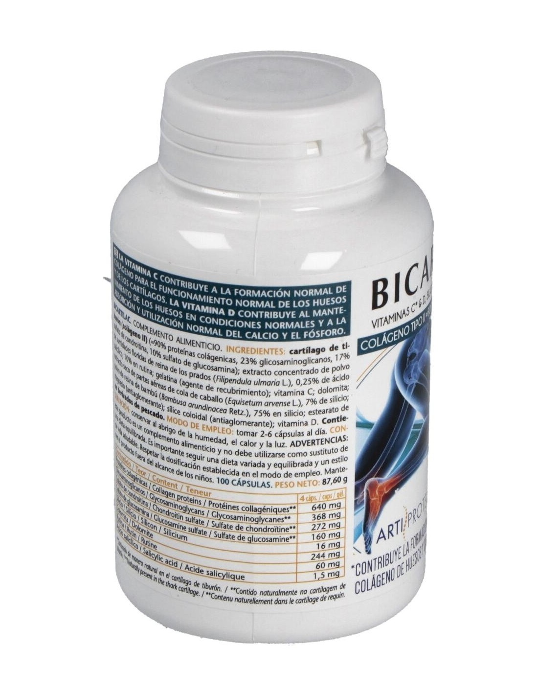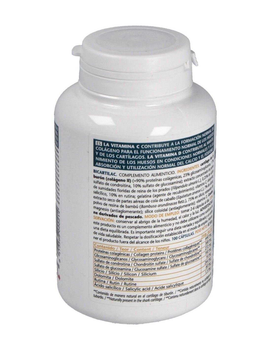 Ingredientes:Cartílago de tiburón (colágeno II) (40% proteínas colagénicas, 23% glicosaminoglicanos, 17% sulfato de condroitina, 10% sulfato de glucosamina); extracto concentrado de polvo de sumidades floridas de reina de los prados (Filipendula ulmaria L.), 0,25% ácido salicílico, 10% rutina; gelatina E428 (agente de recubrimiento); vitamina C; extracto seco de parte aérea de cola de caballo (Equisetum arvense L.), 7% silicio; óxido de magnesio de origen marino; estearato de magnesio E572 y sílice coloidal E551 (antiaglomerantes); polvo de resina de bambú (Poaceae bambusa arundinacea Retz), 75% silicio; vitamina D3.Modo de empleo:Tomar de 2 a 6 cápsulas al día.Presentación:Envase de 100 cápsulas.Recomendaciones y advertencias:No contiene gluten ni azúcares añadidos. Contiene derivados de pescado. No recomendado en menores de 12 años.