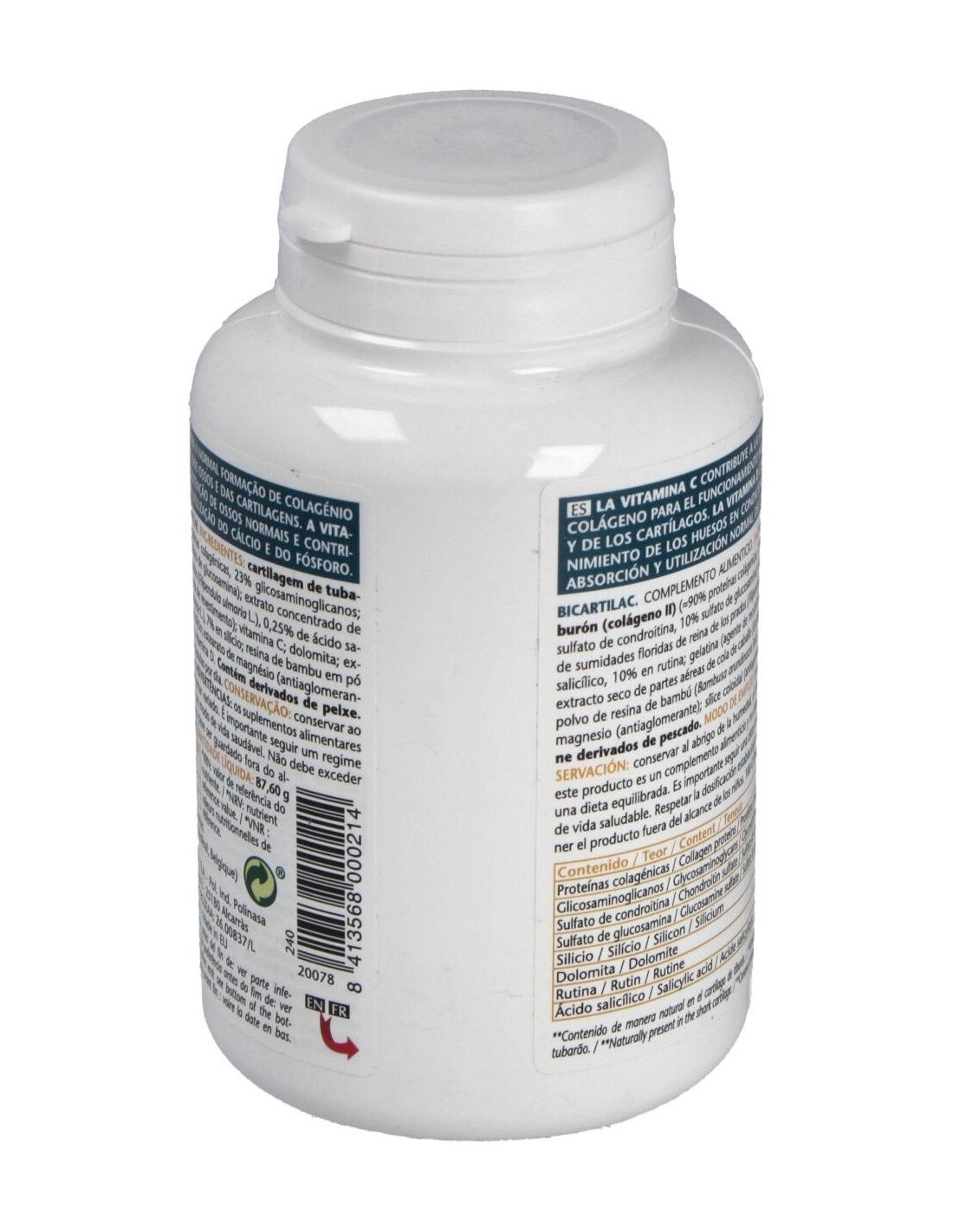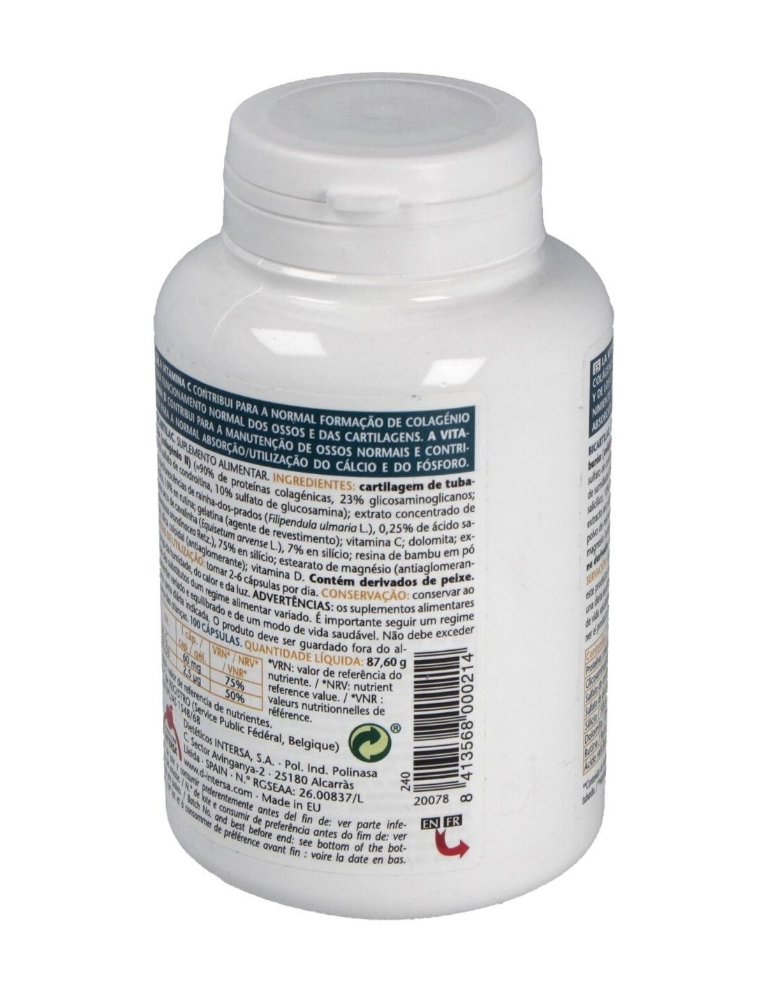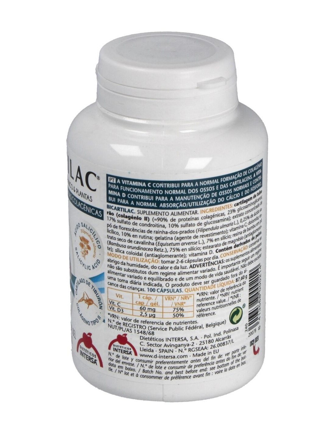 Ingredientes:Cartílago de tiburón (colágeno II) (40% proteínas colagénicas, 23% glicosaminoglicanos, 17% sulfato de condroitina, 10% sulfato de glucosamina); extracto concentrado de polvo de sumidades floridas de reina de los prados (Filipendula ulmaria L.), 0,25% ácido salicílico, 10% rutina; gelatina E428 (agente de recubrimiento); vitamina C; extracto seco de parte aérea de cola de caballo (Equisetum arvense L.), 7% silicio; óxido de magnesio de origen marino; estearato de magnesio E572 y sílice coloidal E551 (antiaglomerantes); polvo de resina de bambú (Poaceae bambusa arundinacea Retz), 75% silicio; vitamina D3.Modo de empleo:Tomar de 2 a 6 cápsulas al día.Presentación:Envase de 100 cápsulas.Recomendaciones y advertencias:No contiene gluten ni azúcares añadidos. Contiene derivados de pescado. No recomendado en menores de 12 años.