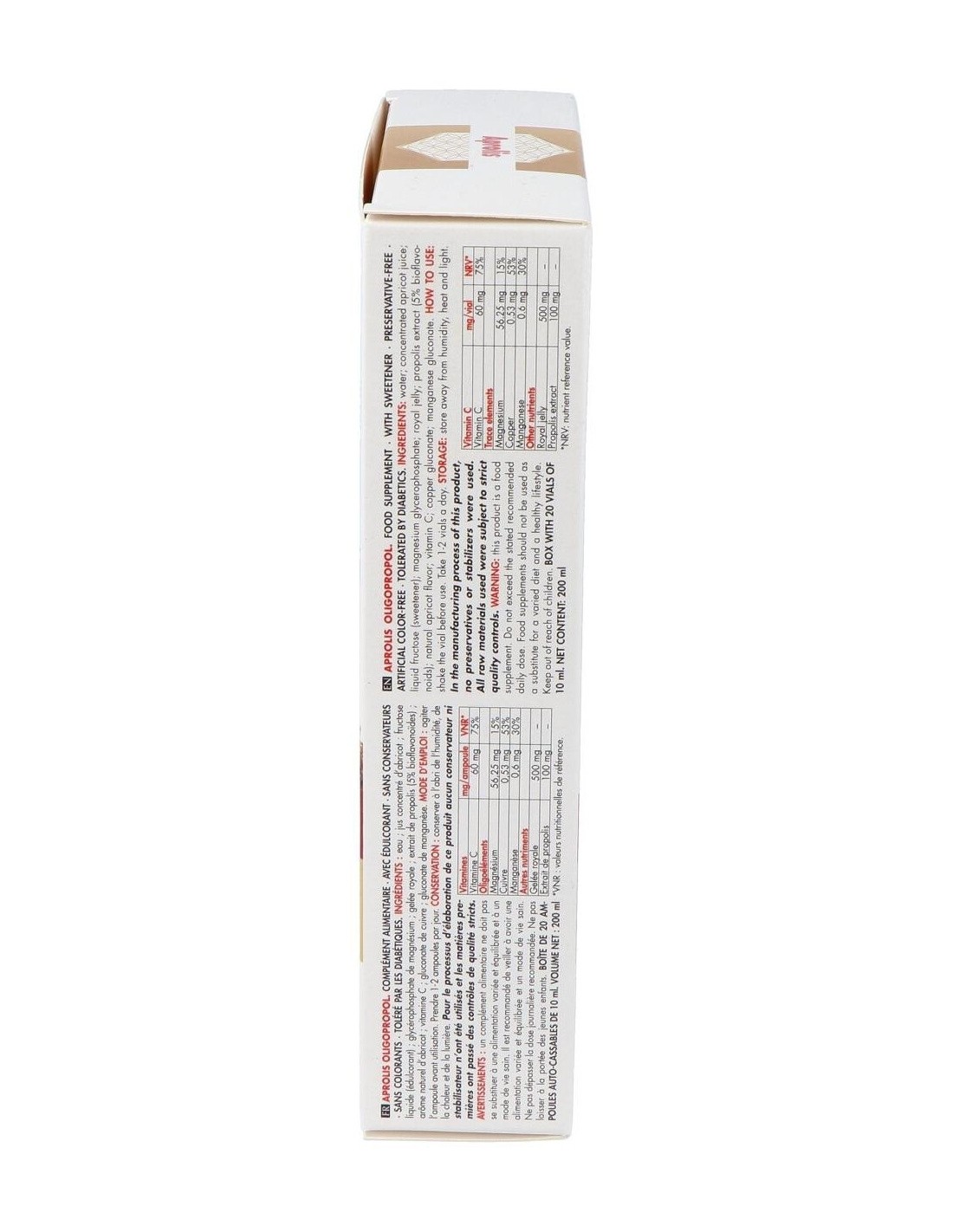 Ingredientes:Agua; jugo concentrado de albarico-que; fructosa líquida (edulcorante); glicerofosfato de magnesio; jalea real; extracto de propóleo (al 5% en bioflavonoides); aroma natural de albaricoque; vitamina C; gluconato de cobre; gluconato de manganeso.Modo de empleo:Tomar de 1 a 2 ampollas al día.Presentación:Envase de 20 ampollas.Recomendaciones y advertencias:No contiene gluten ni conservantes.