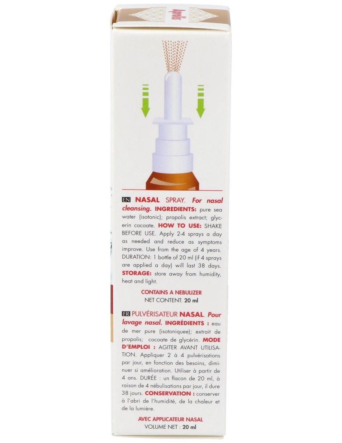 Agua de mar pura (isotónica); extracto de propóleo; cocoato de glicerina.