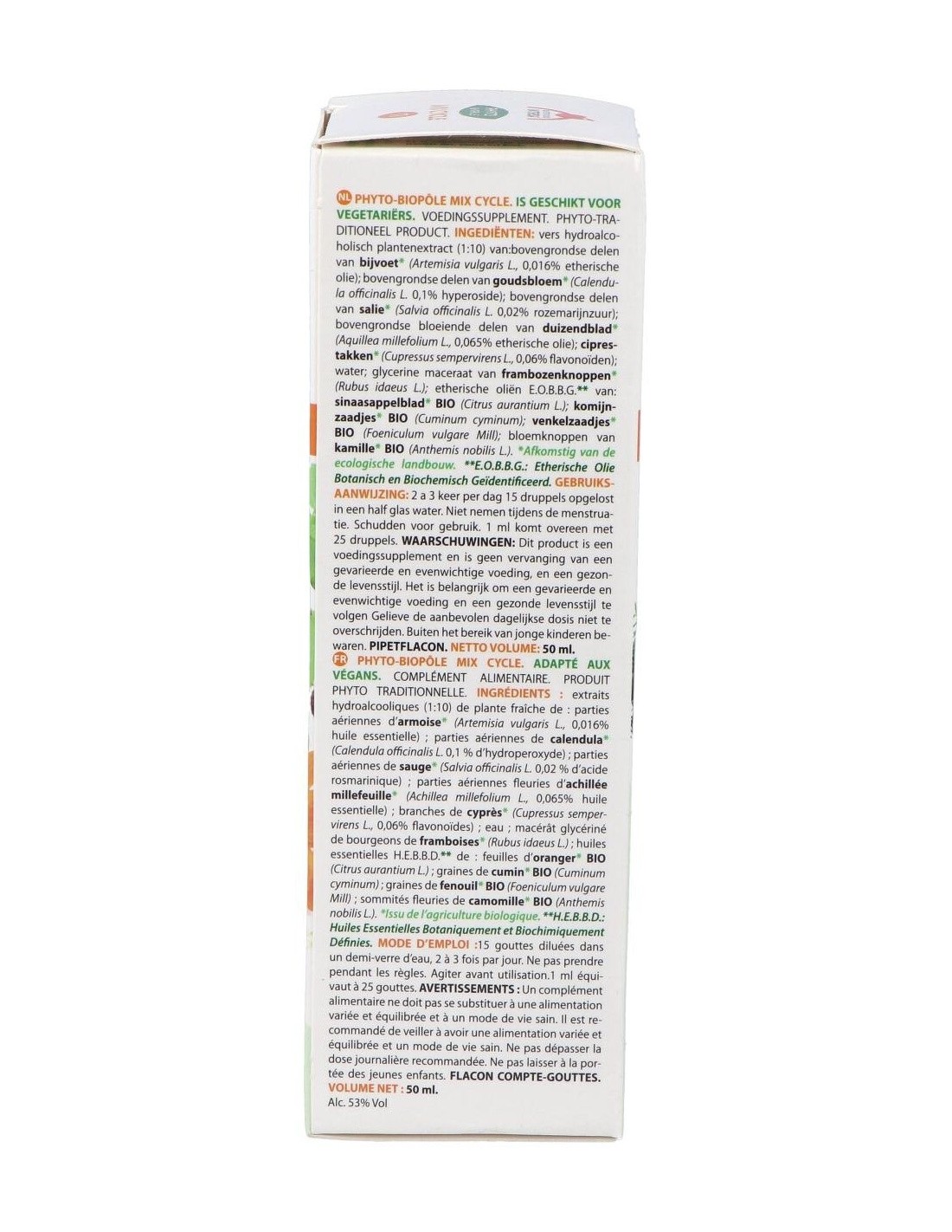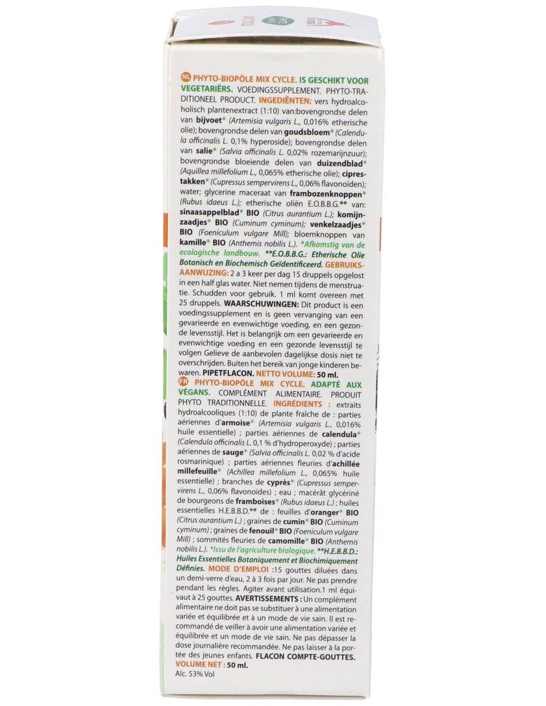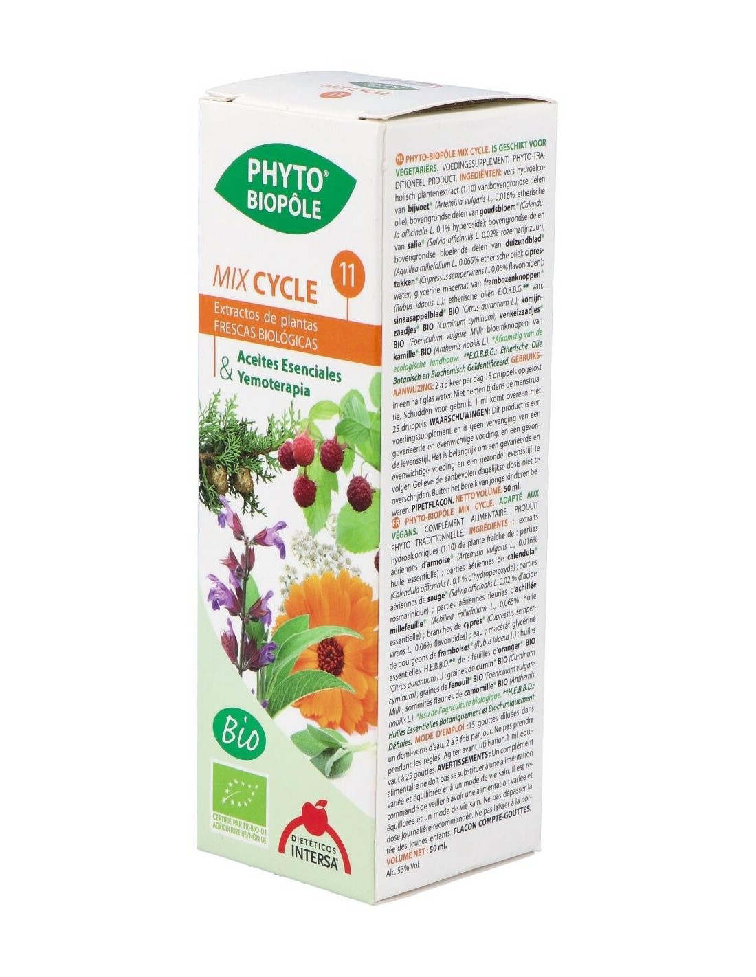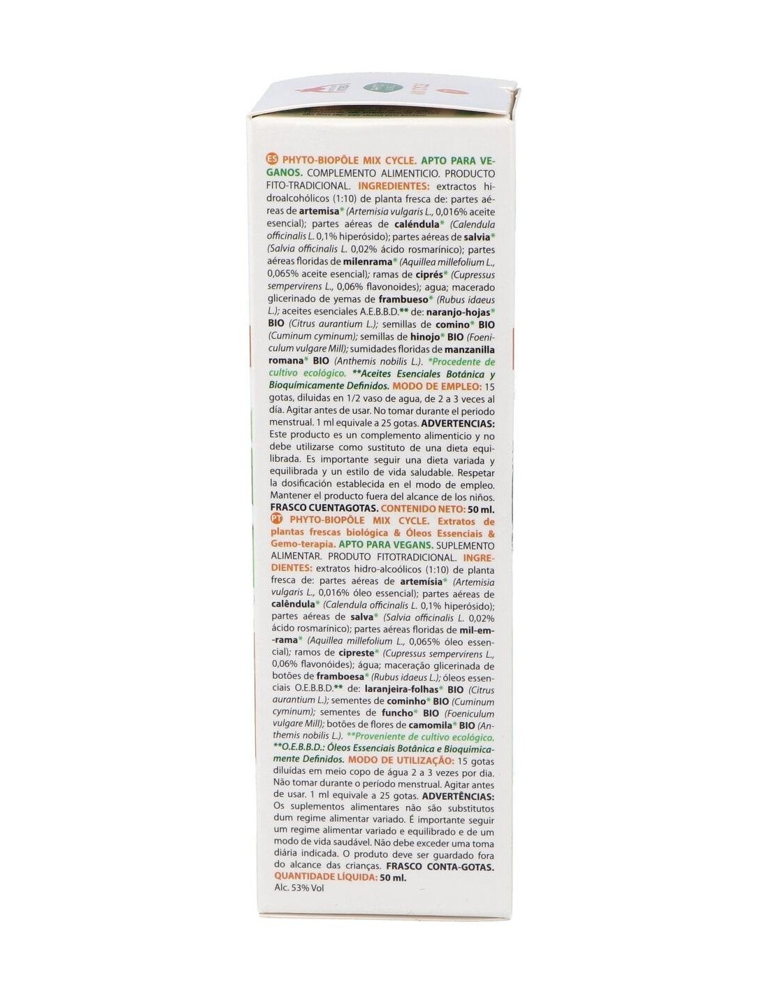 Mix Cycle es un producto natural perteneciente a la linea Phyto Biopole, que aporta una excelente combinación de extractos combinados de plantas, yemas y aceites esenciales que colaboran en los procesos de normalización y regulacion del ciclo menstrual. Ingredientes: