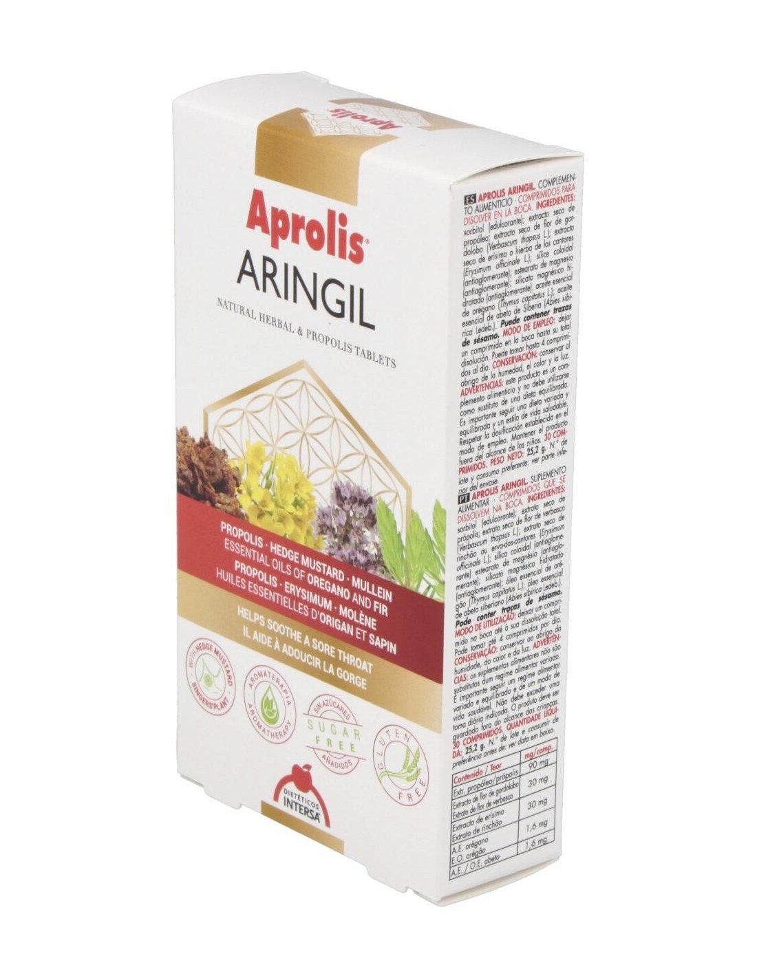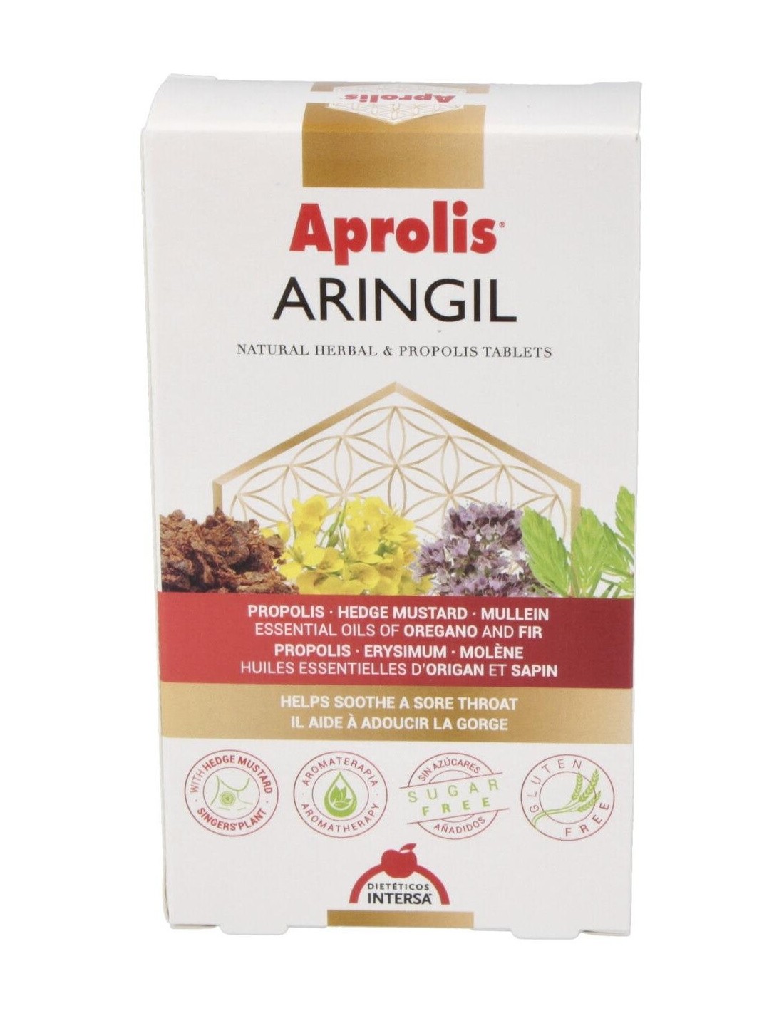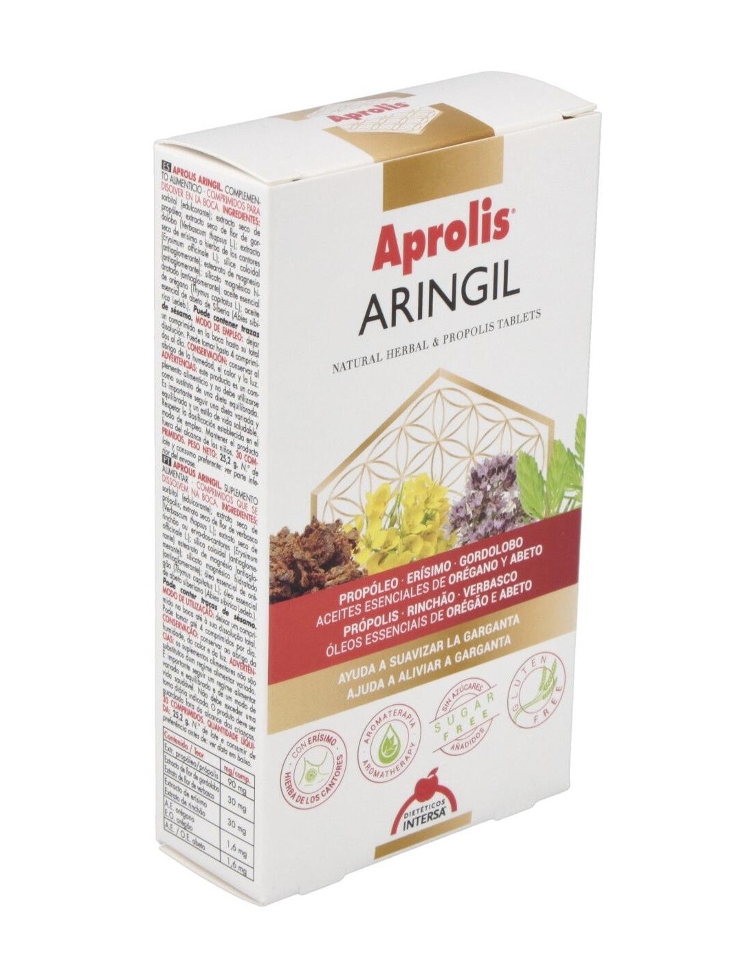 Aprolis Aringil son comprimidos de própolis de acción balsámica, antiinflamatoria, expectorante y antitusígena; erísimo y gordolobo ricos en mucílagos que ayudan a eliminar la irritación de la cavidad farígea y laríngea; aceites esenciales de orégano rico en fenoles, con una acción expectorante y antiinfecciosa de las vías respiratorias y pino albar, rico en pineno que le confiere una acción antiséptica y expectorante.