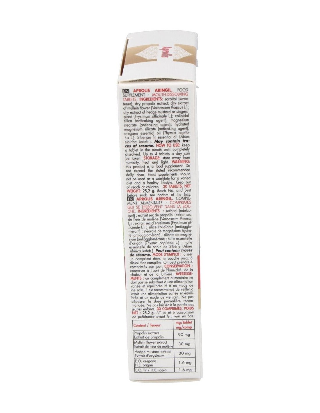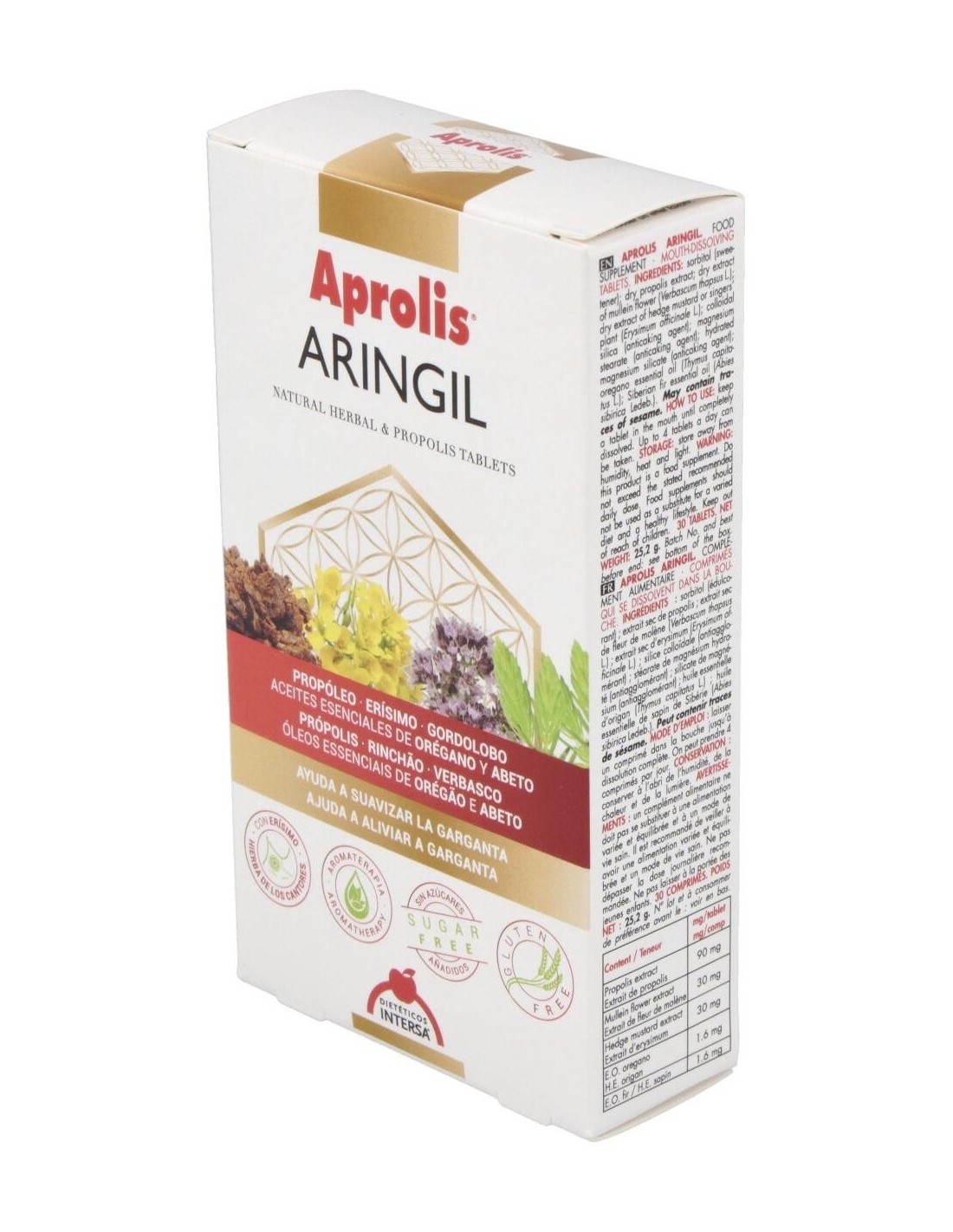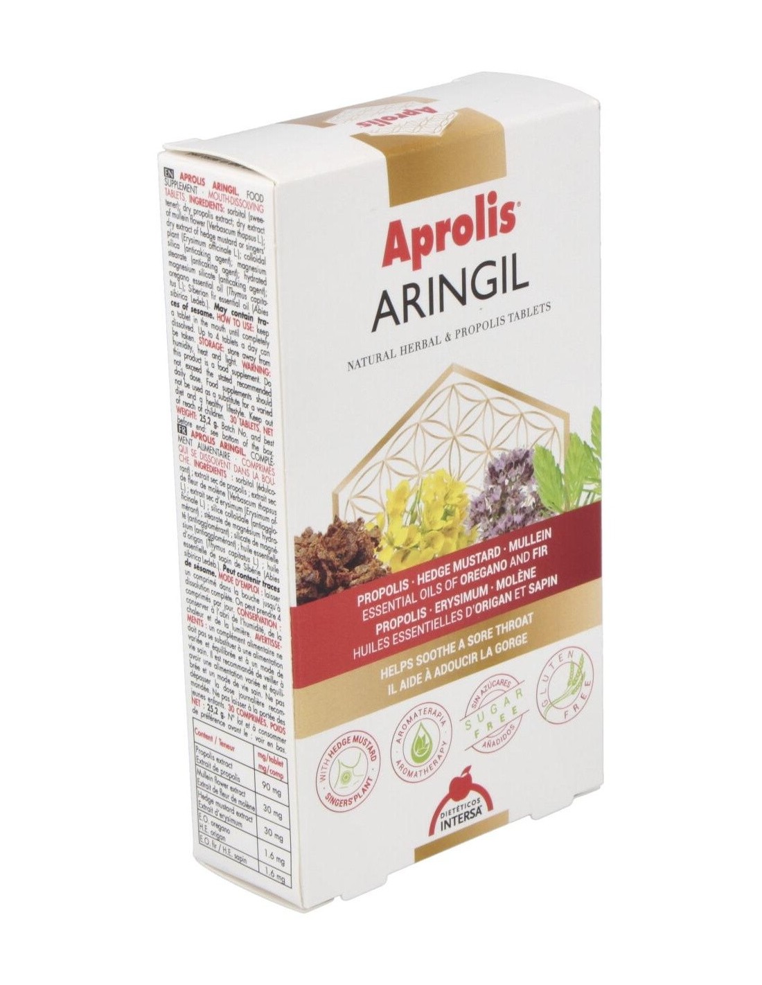Aprolis Aringil son comprimidos de própolis de acción balsámica, antiinflamatoria, expectorante y antitusígena; erísimo y gordolobo ricos en mucílagos que ayudan a eliminar la irritación de la cavidad farígea y laríngea; aceites esenciales de orégano rico en fenoles, con una acción expectorante y antiinfecciosa de las vías respiratorias y pino albar, rico en pineno que le confiere una acción antiséptica y expectorante.