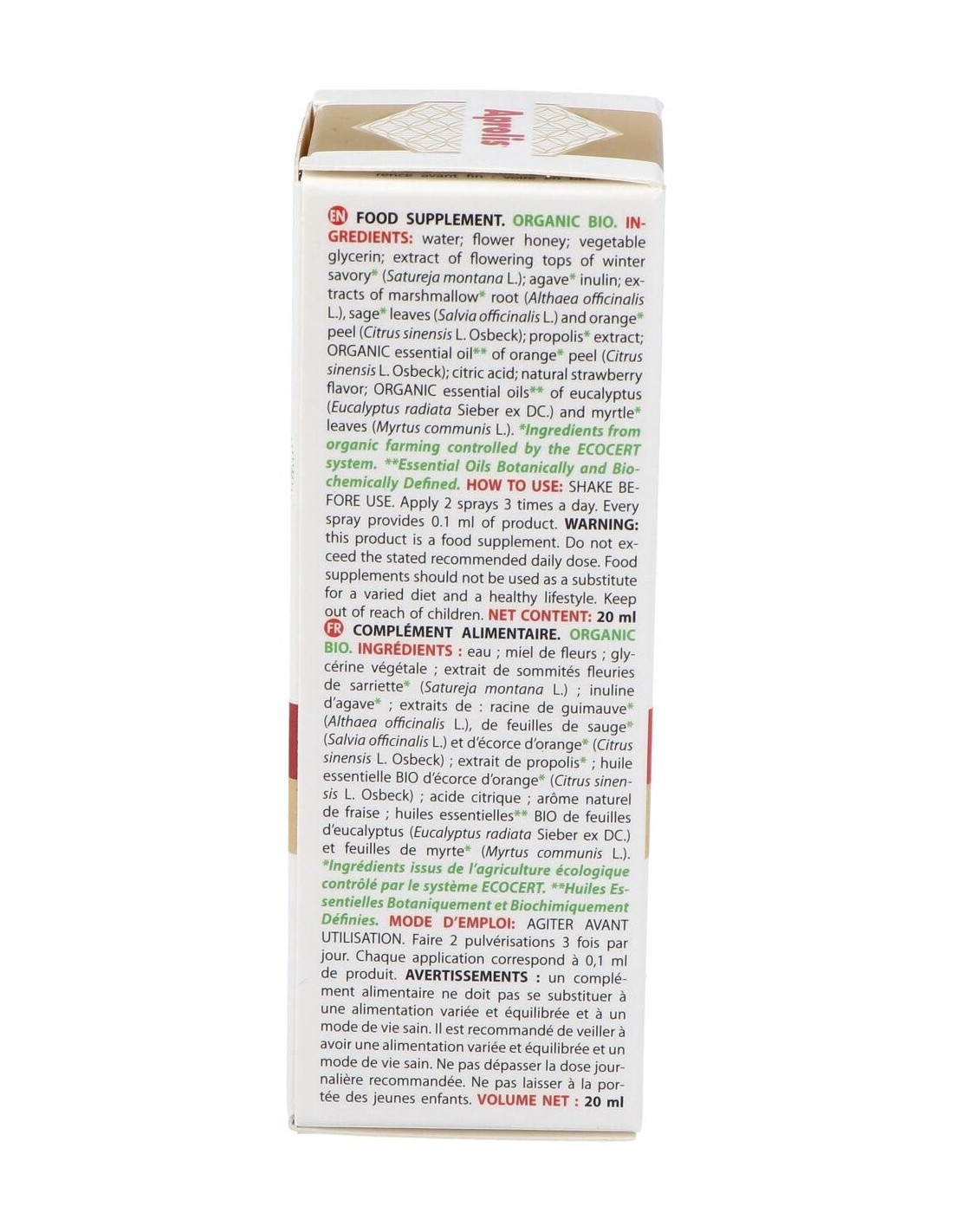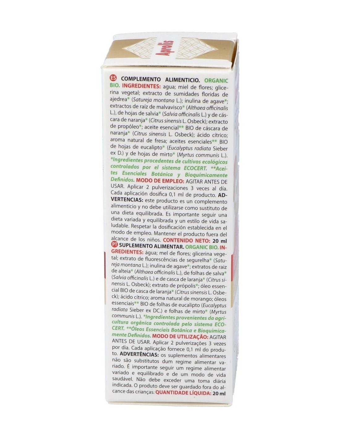 Extracto de propóleo, Extracto de ajedrea (Satureja montanas), Extracto de malvavisco - raíz (Althaea officinalis), Aceite esencial de: Eucalipto (Eucalyptus radiata L.), Naranja cáscara (Citrus sinensis L.) y Mirto (Mirtus communis L.).