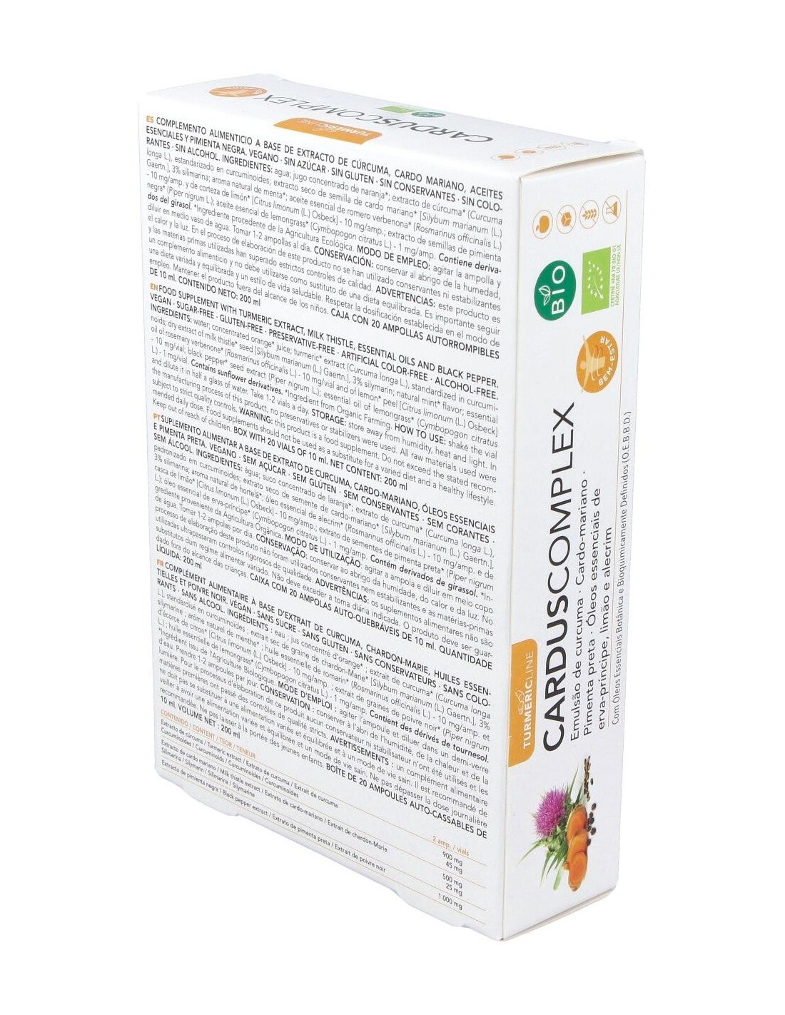 Ampollas a base de cúrcuma para mejorar el funcionamiento general del cuerpo. Elaborado con jugo natural de naranja, extracto de cúrcuma, extracto de semilla de cardo mariano, semillas de pimienta negra, aceite esencial de romero, corteza de limón y lemongrass. Con aroma delicado a menta. Con ingrediente procedente de la agricultura ecológica.
