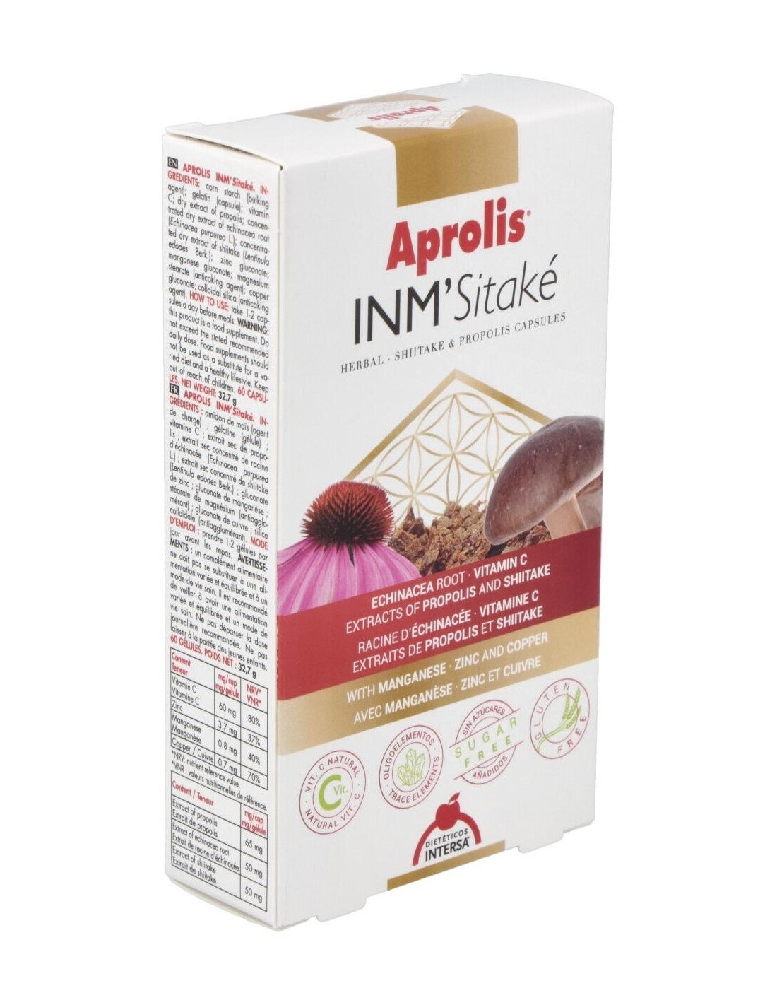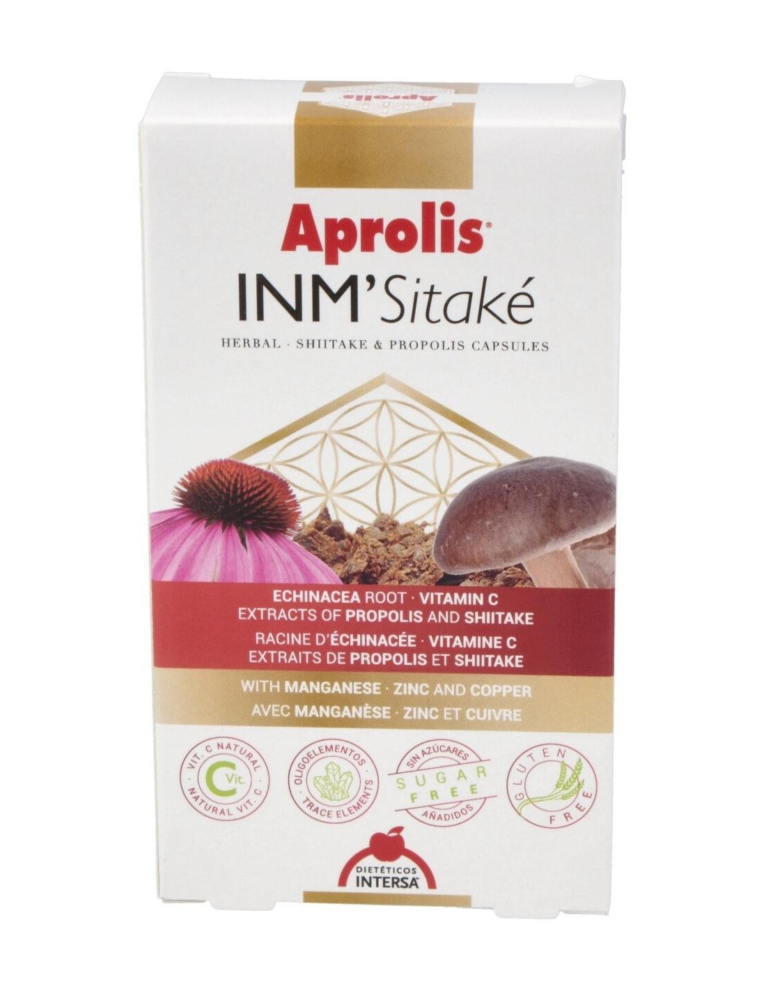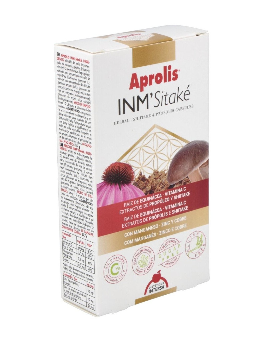 Ingredientes:Almidón de maíz (incrementador de volumen); vitamina C (ácido ascórbico); gelatina (cápsula); extracto seco de propóleo; polvo de raíz de equinácea (Echinacea purpurea L.); extracto seco de shiitake (Lentinula edodes); gluconato de zinc; gluconato de cobre; gluconato de manganeso; estearato de magnesio (antiaglomerante); vitamina D3 (colecalciferol); sílice coloidal (antiaglomerante).Modo de empleo:Tomar de 1 a 2 cápsulas al día antes de las comidas.Presentación:Envase de 60 cápsulas.Recomendaciones y advertencias:No contiene gluten ni azúcares añadidos.