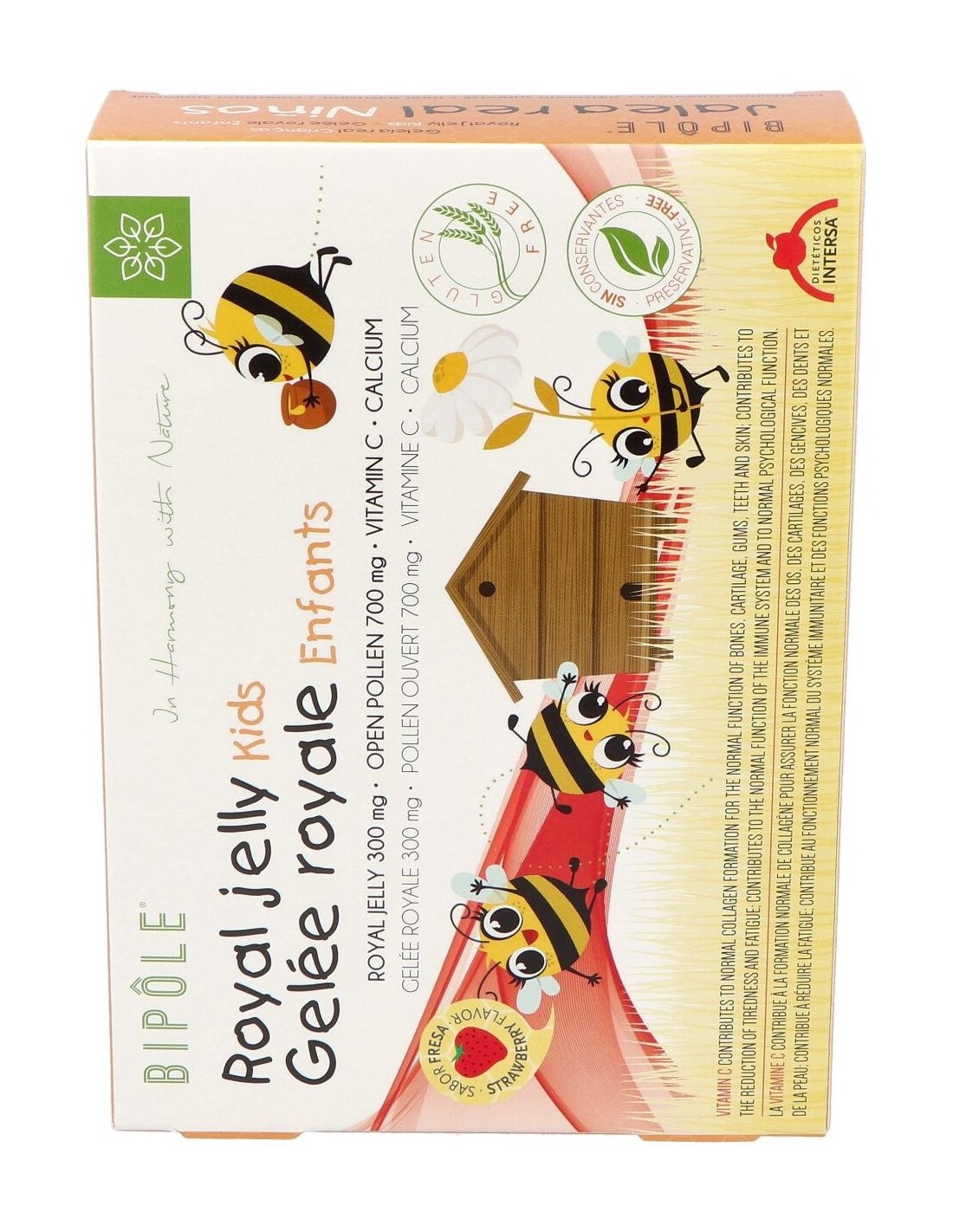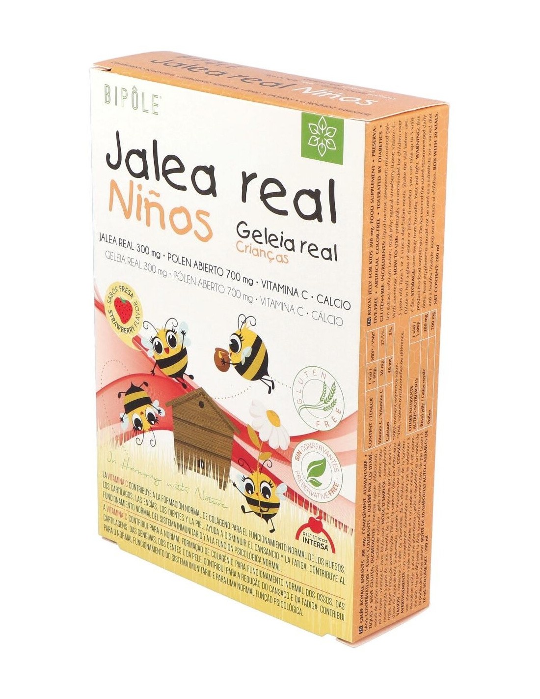 Suplemento infantil con nutrientes como jalea real y polen abierto. La vitamina C contribuye a disminuir el cansancio y la fatiga, al normal funcionamiento del sistema inmune y a la función psicológica normal. Ampollas con sabor a fresa.