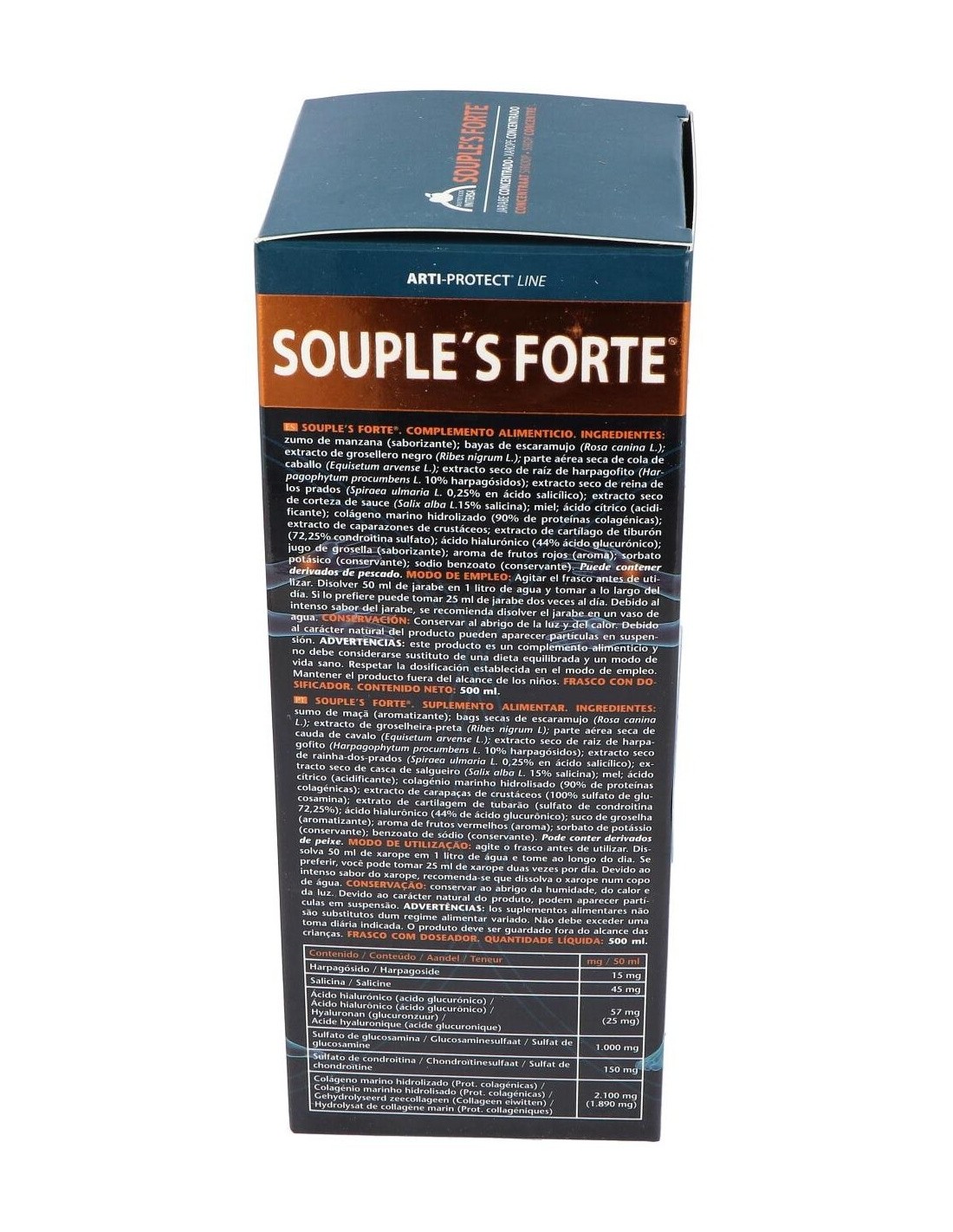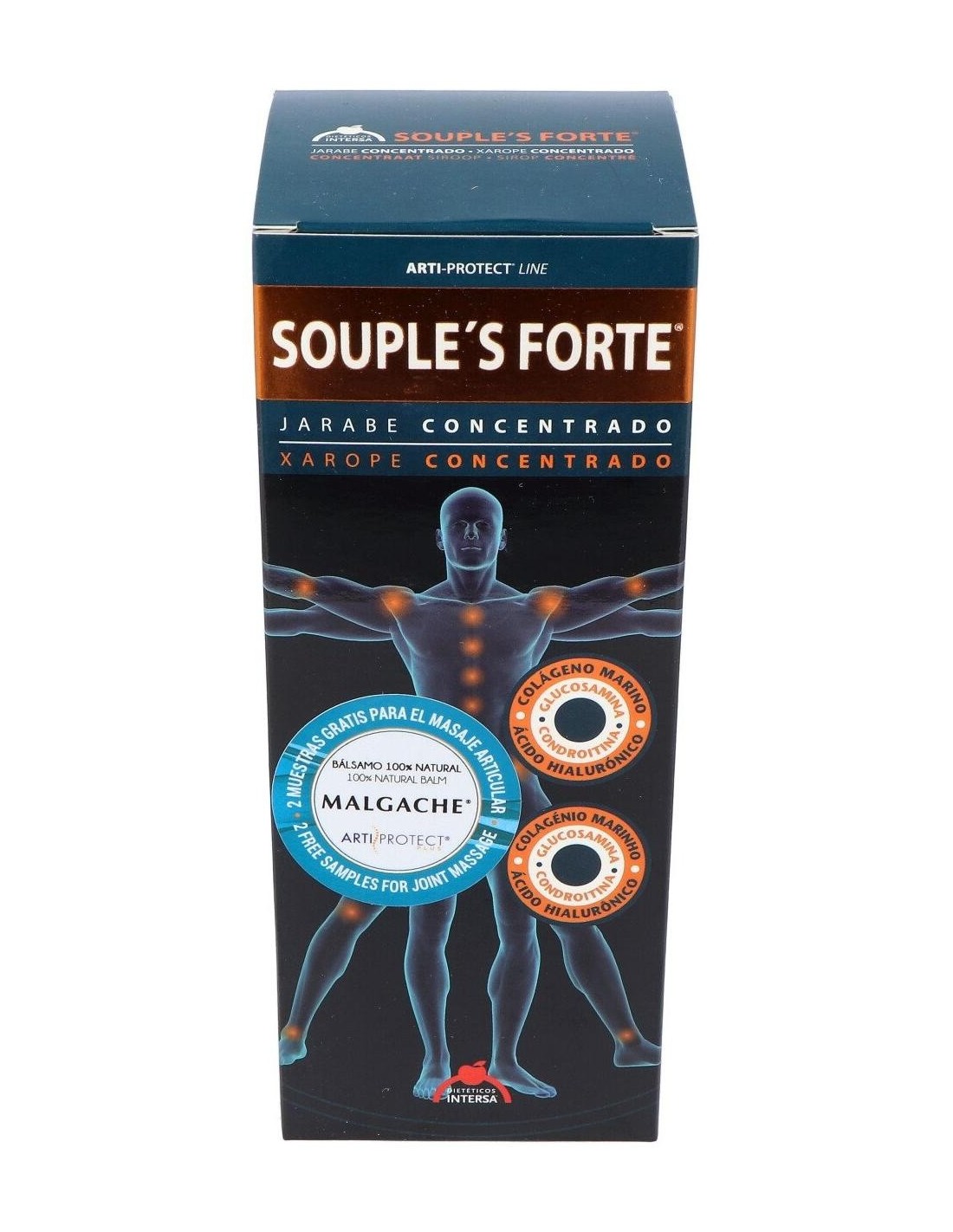 Souple's Forte es un complemento alimenticio cuyo propósito es el de aportar al organismo una sinergia completa de bio-activos para el tratamiento de la inflamación y la degeneración articular, la hiperuricemia, el ácido úrico y la gota. Posee diferentes niveles de acción, por un lado regenerador del cartílago articular y ayuda a frenar su deterioro, en segundo lugar actúa como antiinflamatorio y analgésico y por último facilita la eliminación de ácidos orgánicos. Útil en los siguientes casos: