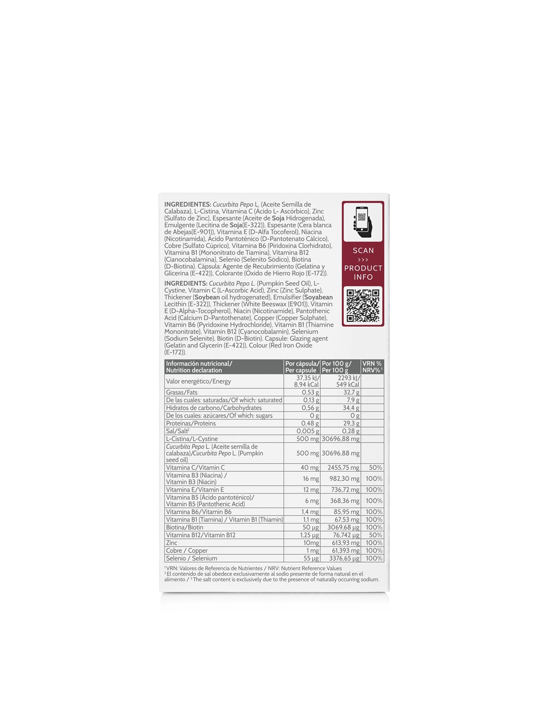(Aceite Semilla de Calabaza), L-Cistina, Vitamina C (Ácido L- Ascórbico), Zinc (Sulfato de Zinc), Espesante (Aceite de Soja Hidrogenado), Emulgente (Lecitina de Soja), Espesante (Cera Amarilla de Abejas), Vitamina E (D-Alfa Tocoferol), Niacina (Nicotinamida), Ácido Pantoténico (D-Pantotenato Cálcico), Cobre (Sulfato Cúprico), Vitamina B6 (Piridoxina Clorhidrato), Vitamina B12 (Cianocobalamina), Vitamina B1 (Mononitrato de Tiamina), Selenio (Selenito Sódico), Biotina (D-Biotina).