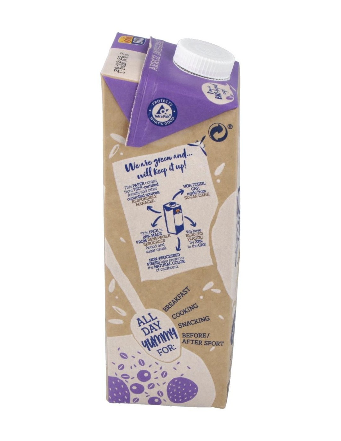 Agua, arroz integral italiano* (17%), aceite de girasol prensado en frío*, sal marina. Valor nutricional por 100 g: Energía 216 kJ/51 kcal Grasas 1 g de las cuales saturadas 0,2 g monoinsaturadas 0,3 g poliinsaturadas 0,5 g Hidratos de carbono 10 g de los cuales azúcar 5,5 g Fibra alimentaria < 0,5 g Proteínas 0,5 g Sal 0,08 g (*)=de cultivo ecológico.