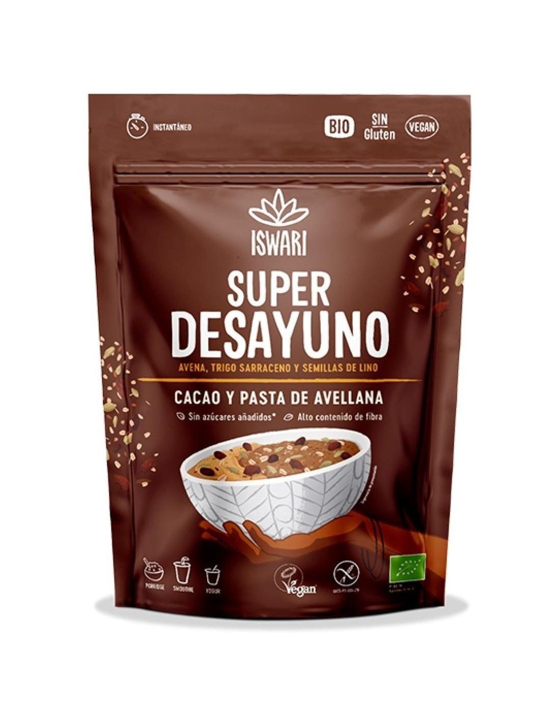 Súper Desayuno Cacao y Pasta de Avellanas es un producto ideal para preparar copos de avena de forma instantánea y rápida sin necesidad de cocerlos, y su versatilidad también permite añadir la mezcla al yogur, hacer deliciosas tortitas entre otras opciones. Además de copos de avena sin gluten, esta mezcla también está enriquecida con trigo sarraceno molido y semillas que, en combinación con la pasta de almendras, contribuyen a obtener unas gachas más cremosas, nutritivas y saciantes. Alto contenido en fibra. Producto vegano.