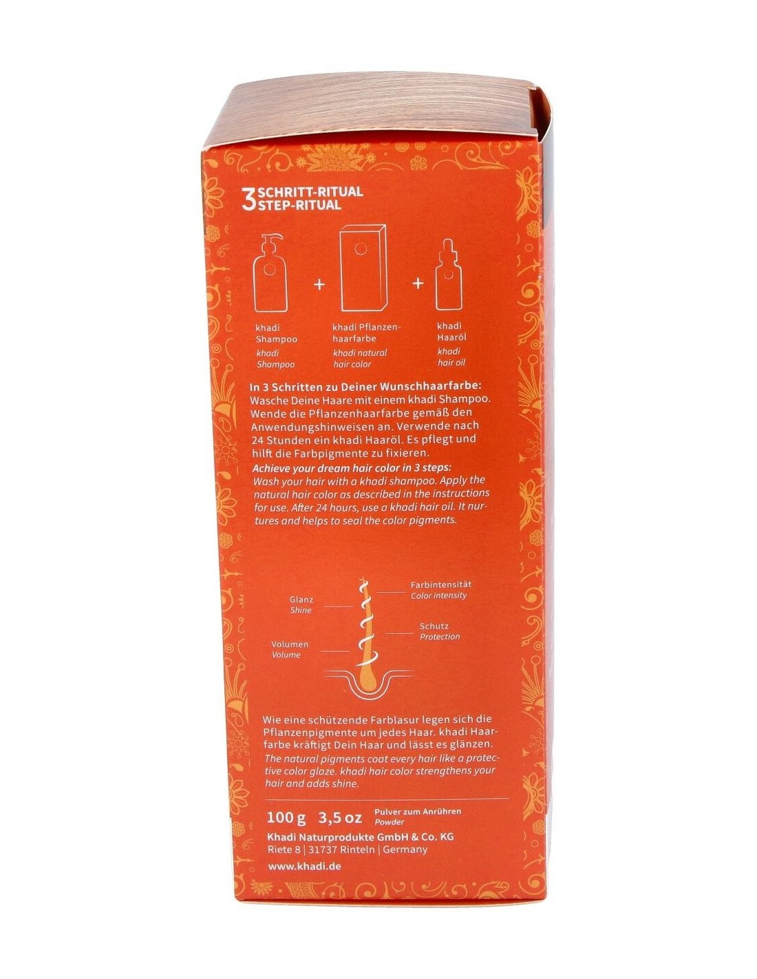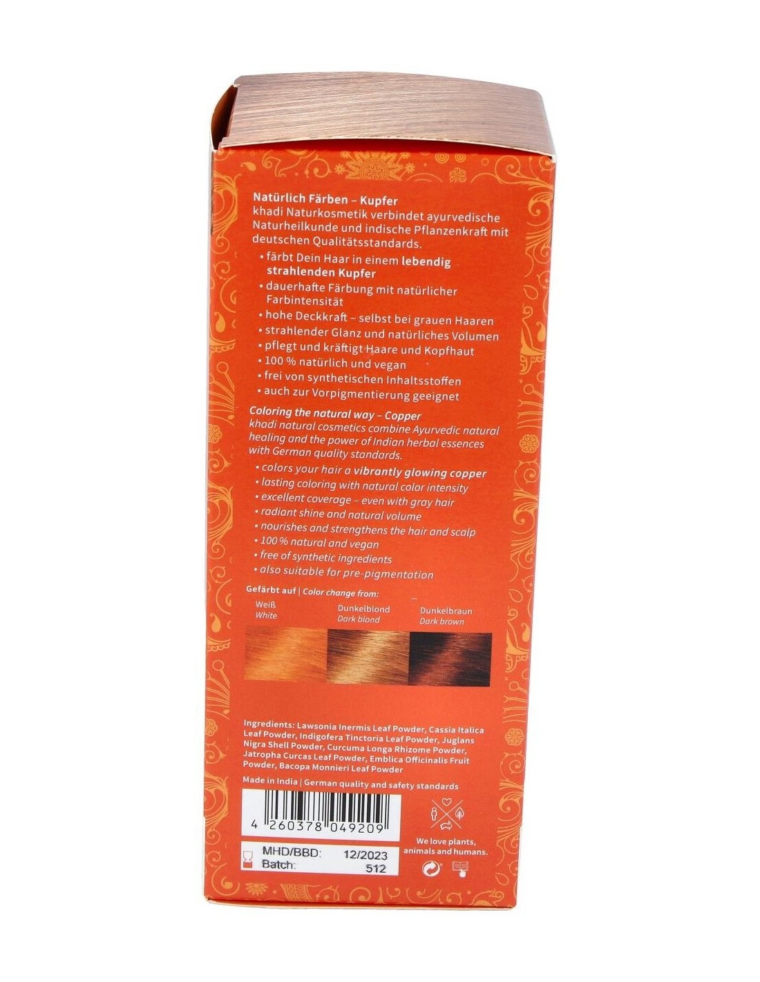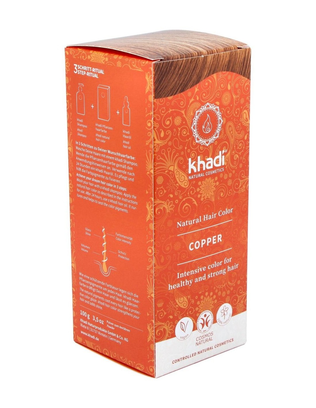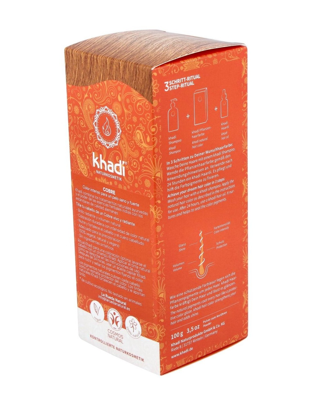 Aporta un brillante tono cobrizo dorado, puente entre el rubio y el rojizo. Sin PPD, parabenes ni perfumes sintéticos 100% vegetal. Apto para veganos.