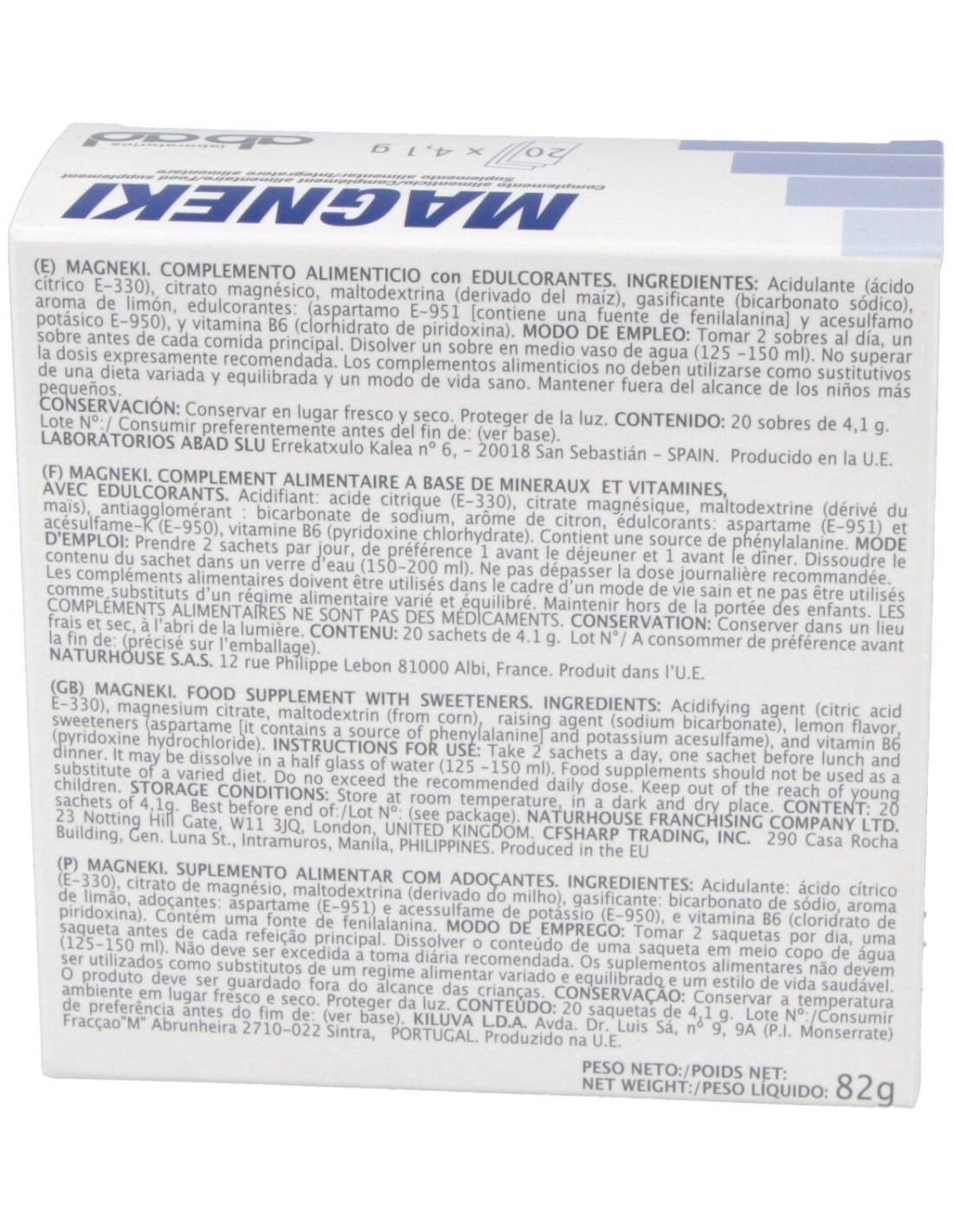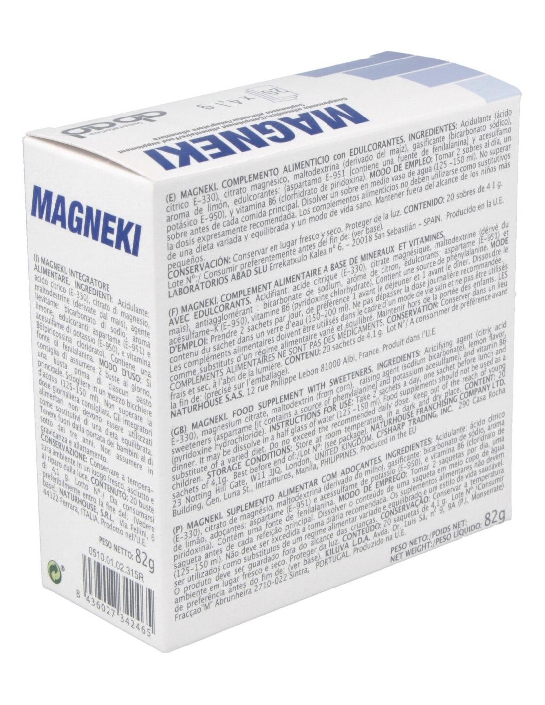 Magneki Eferves Musculos/Huesos (Magneva) 20Sbrs. de Kiluva - Abad es un suplemento diseñado para personas que buscan apoyar el bienestar de sus músculos y huesos mediante una fórmula efervescente de fácil consumo. Está indicado para quienes desean complementar su dieta con nutrientes específicos que contribuyen al mantenimiento de la salud musculoesquelética.