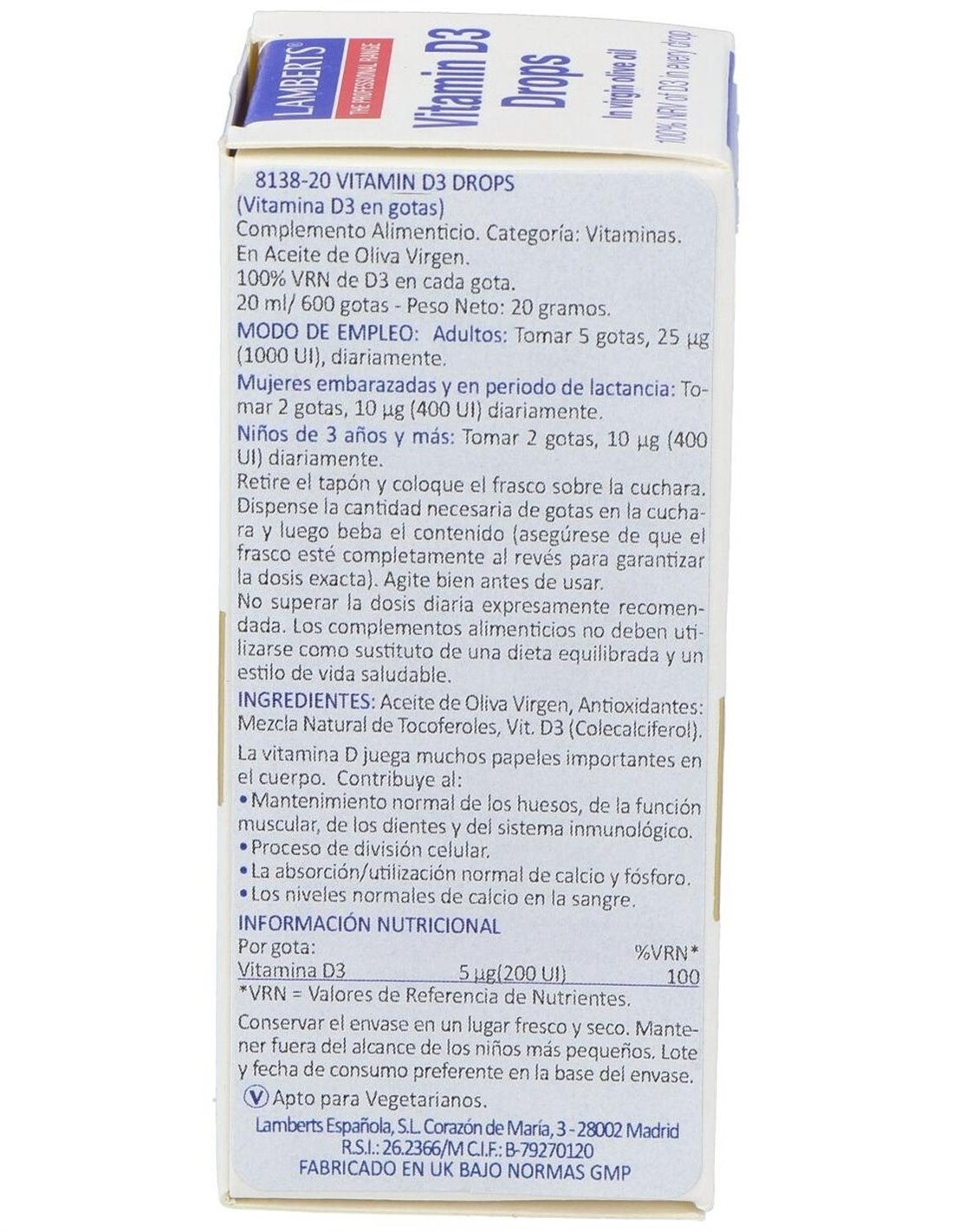 Vitamina D3 líquida 20 ml / 600 gotas 20 ml de Lamberts