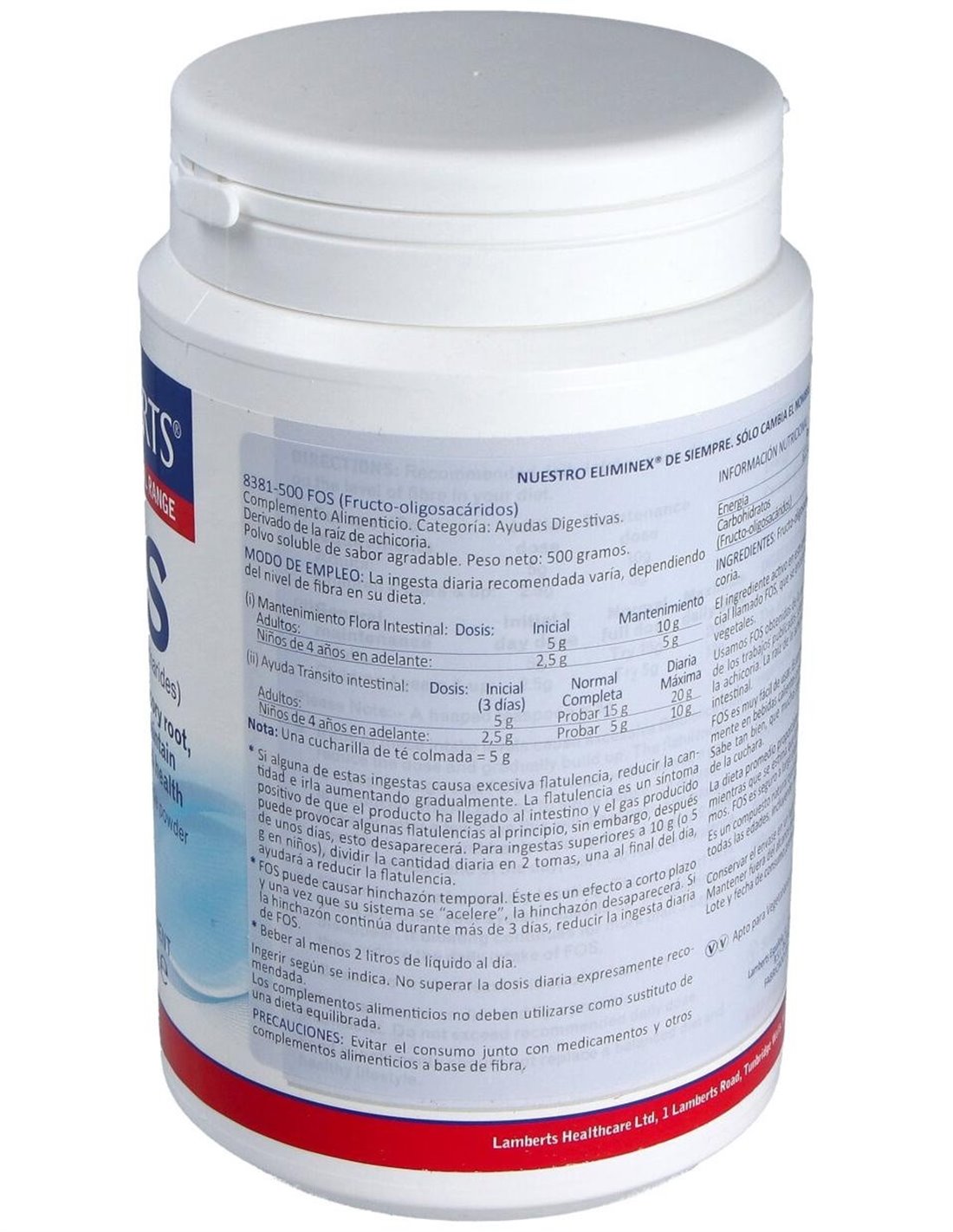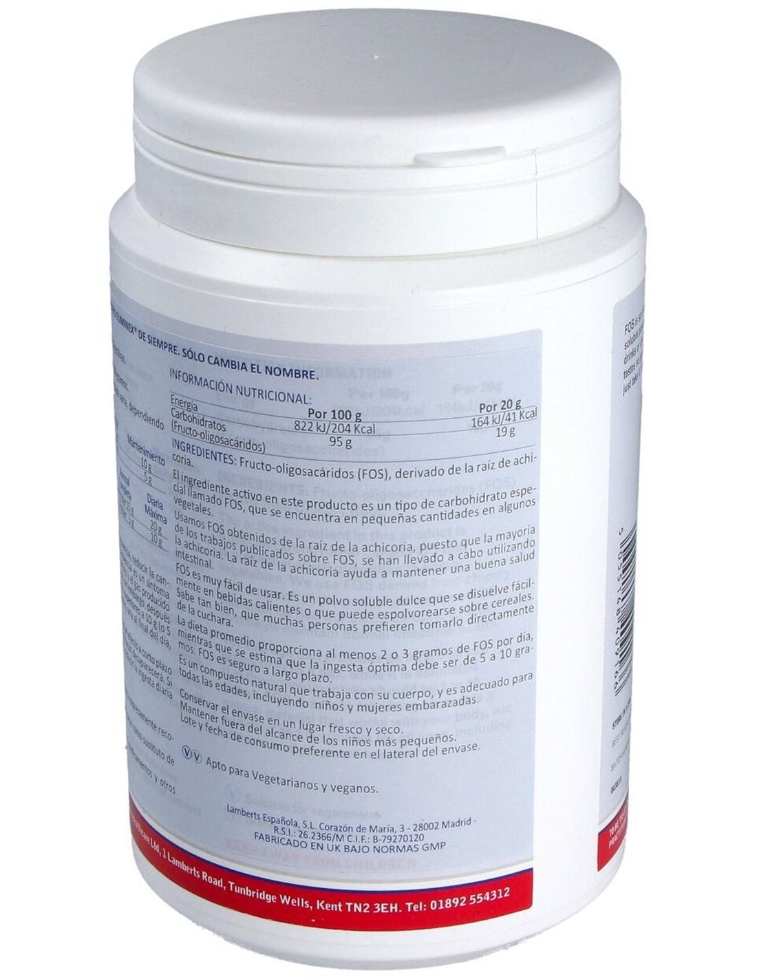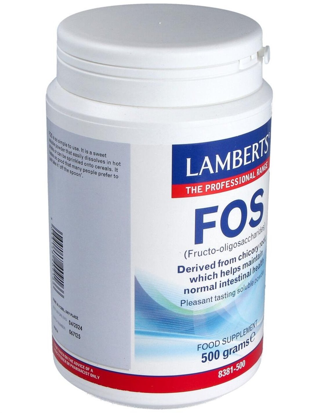 FOS de LAMBERTS®, es un prebiótico natural que se extrae de las raíces de achicoria. Es un polvo soluble dulce, que puede ser mezclado en las bebidas frías o calientes, espolvorearse en los cereales, en sopas o en guisos. Es apto para todas las edades, incluyendo niños y mujeres embarazadas, también es para personas que sigan dietas libres de levaduras y las que tomen medicamentos. No es irritante y puede usarse como mantenimiento.