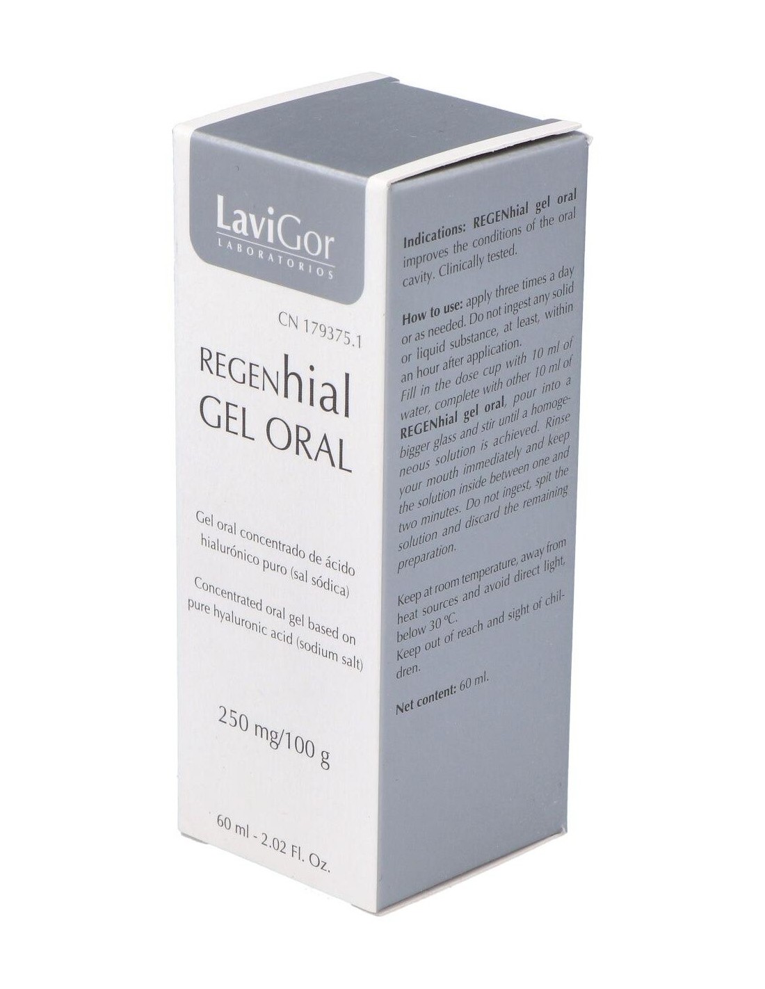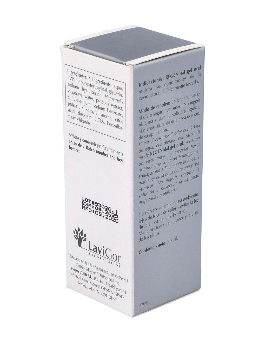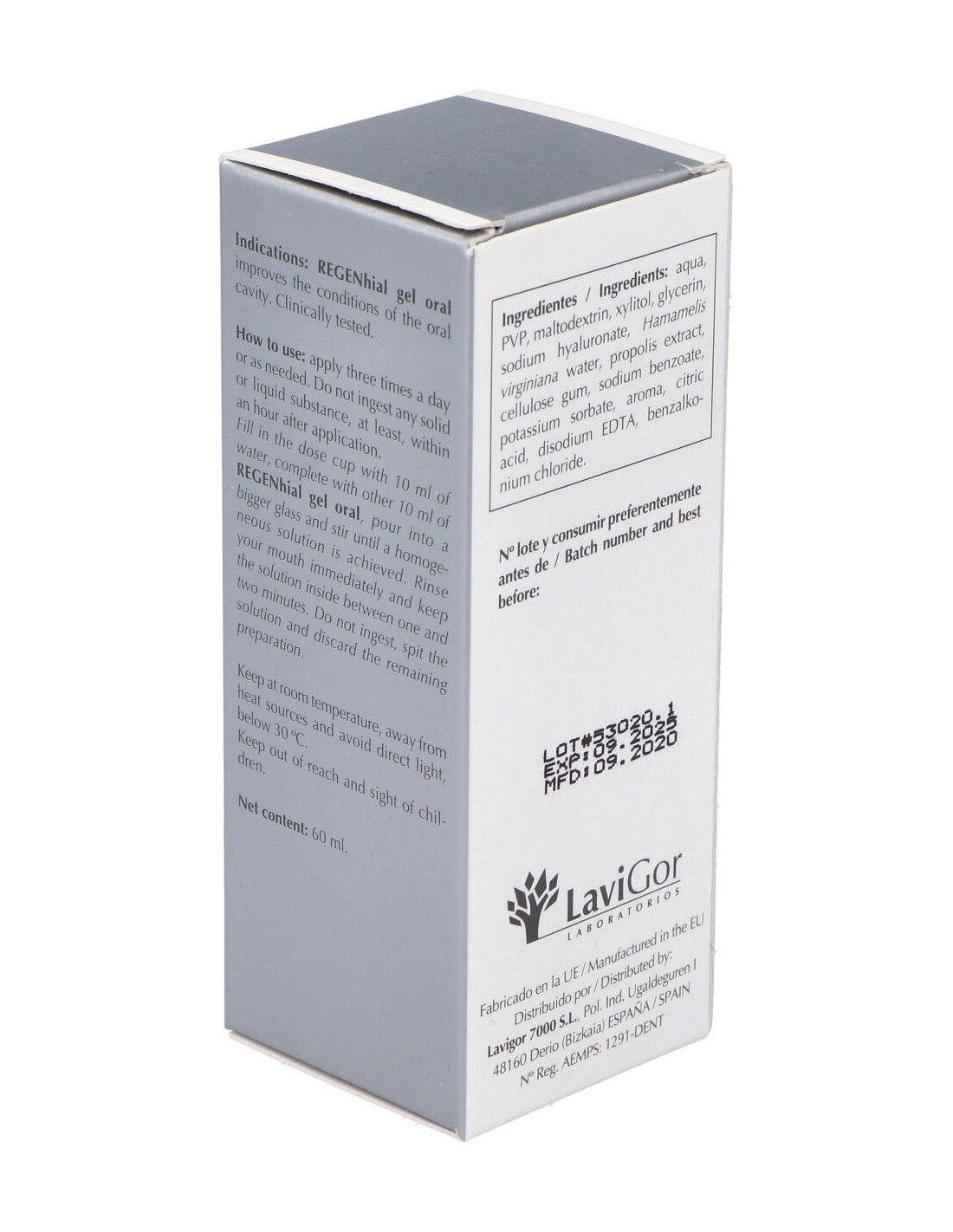 Aplicar tres veces al día o según necesidad. No ingerir ninguna sustancia sólida o líquida, al menos, durante una hora después de su aplicación. Llenar el vaso dosificador con 10 ml de agua, completarlo con otros 10 ml de REGENhial Gel Oral, verter en un vaso mayor y mezclar hasta obtener una solución homogénea. Enjuagar inmediatamente la boca, hacer gárgaras y mantener en la boca entre uno y dos minutos, asegurando un recubrimiento completo. No ingerir, escupir la solución y desechar la cantidad preparada no utilizada.