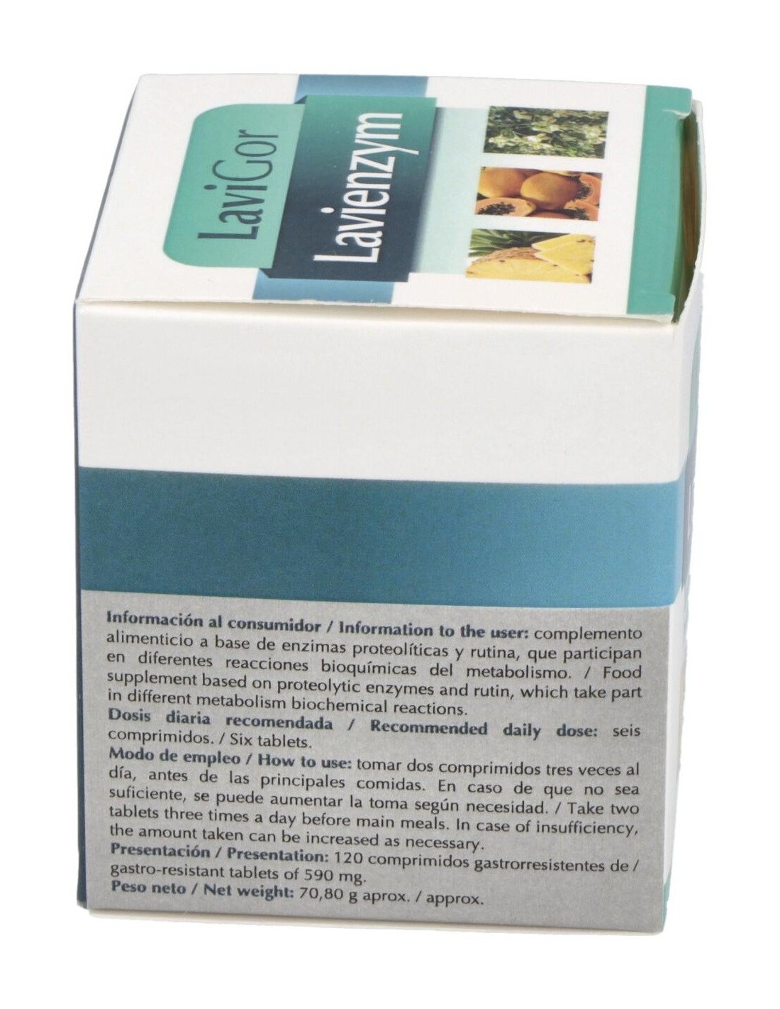 Pancreatina, 100 mg: papaína, 60 mg: rutina, 50 mg: bromelina, 45 mg: tripsina, 24 mg: lipasa, 10 mg: amilasa, 10 mg: quimiotripsina, 1 mg.
