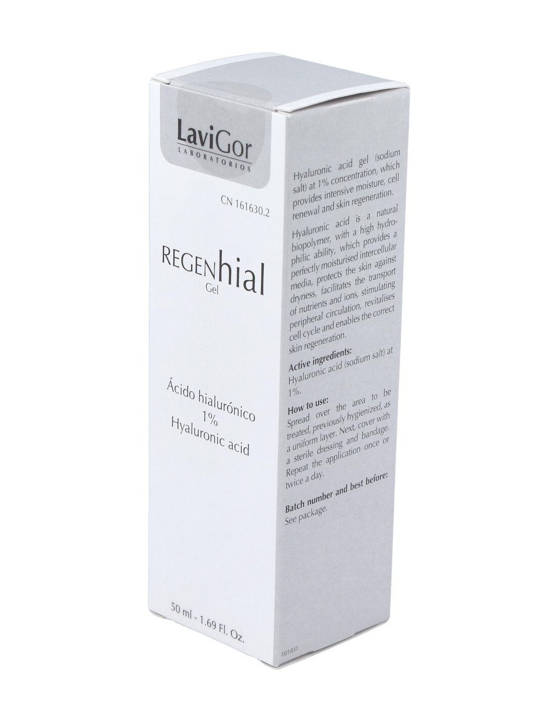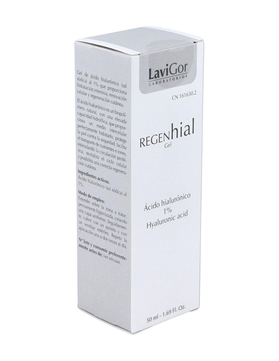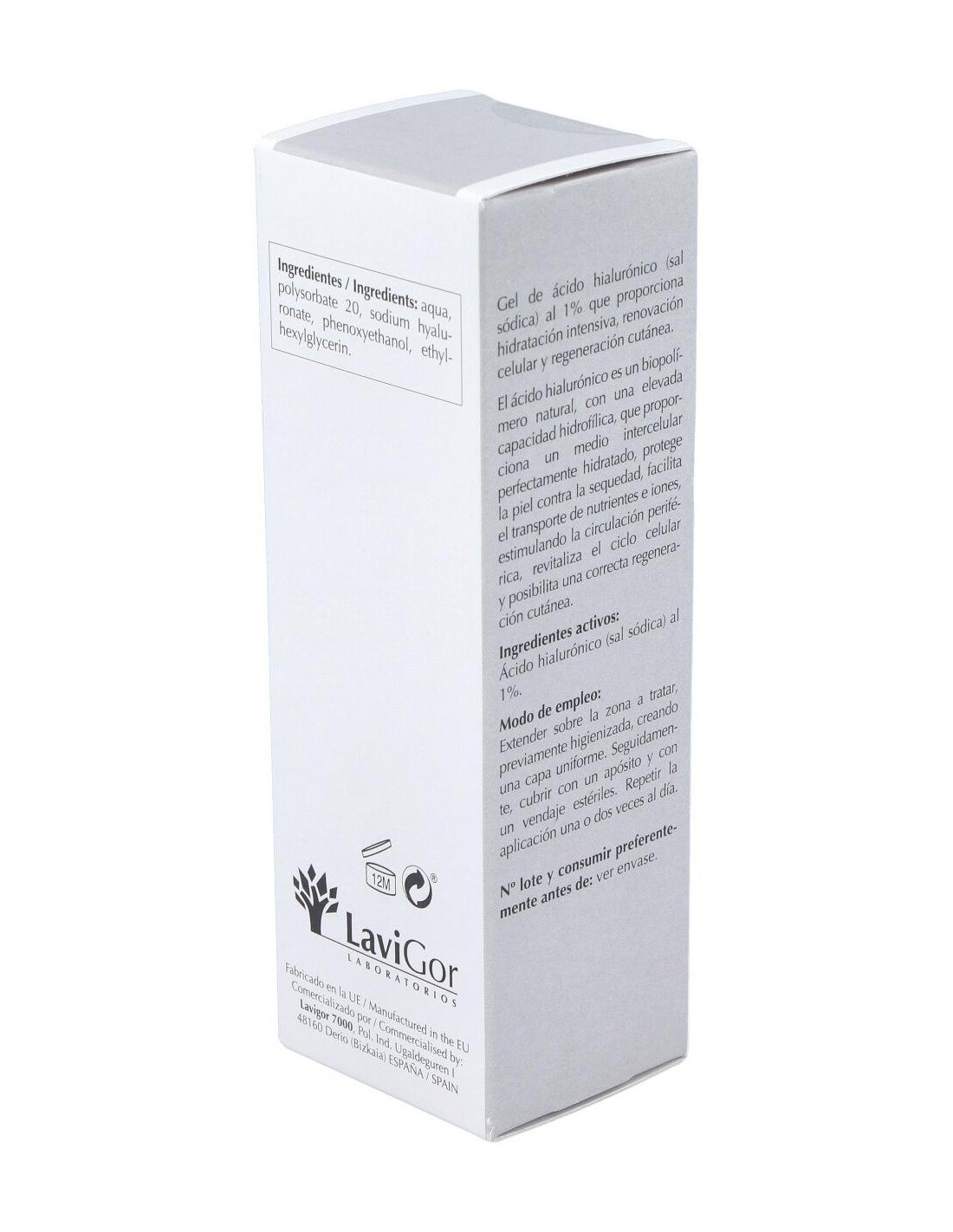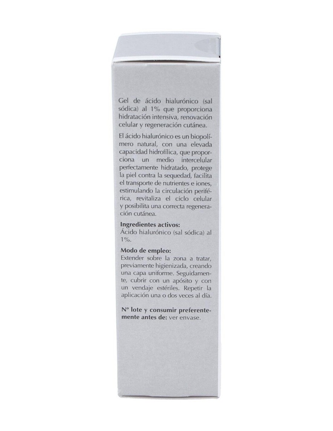 Gel de ácido hialurónico al 1% que proporciona hidratación intensiva, renovación celular y regeneración cutánea. El ácido hialurónico es un biopolímero natural, con una elevada capacidad hidrofílica, que proporciona un medio intercelular perfectamente hidratado, protege la piel contra la sequedad, facilita el transporte de nutrientes e iones, estimulando la circulación periférica, revitaliza el ciclo celular y posibilita una correcta regeneración cutánea.