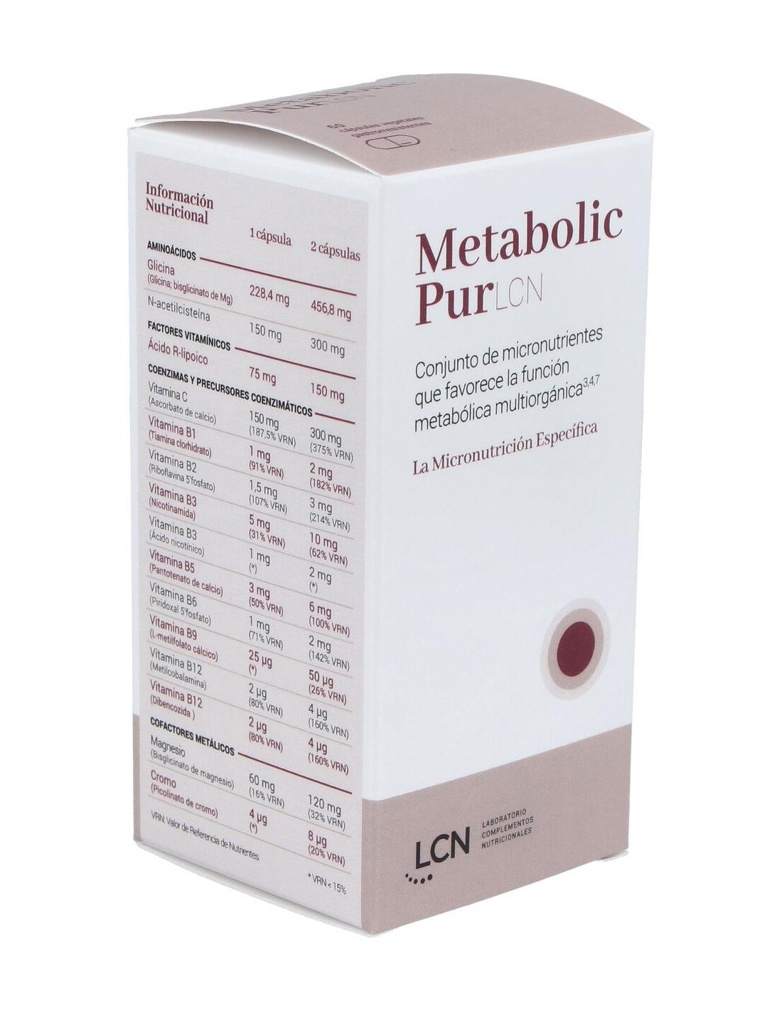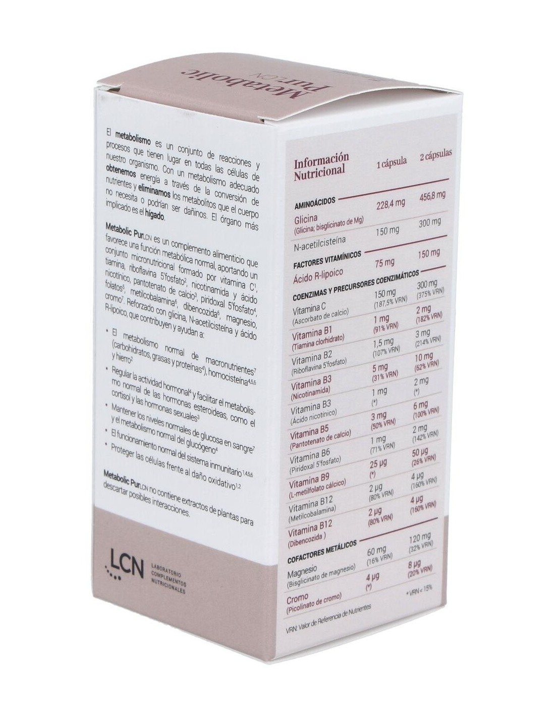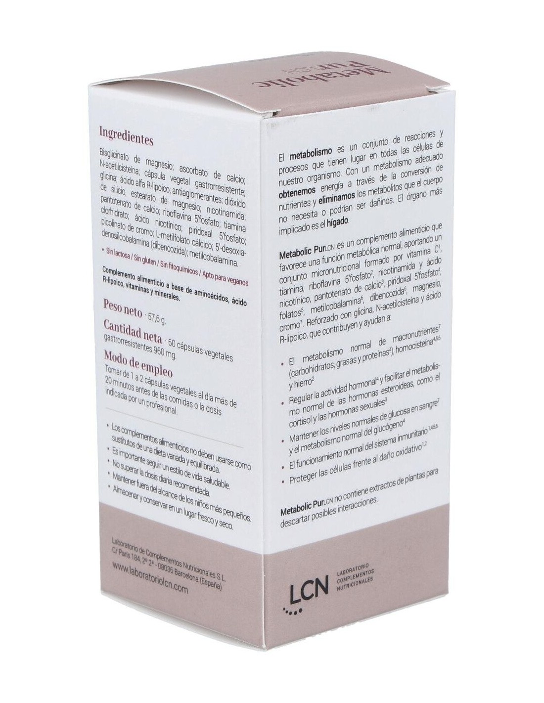 Conjunto de micronutrientes que favorece la función metabólica multiorgánica. El metabolismo es un conjunto de reacciones y procesos que tienen lugar en todas las células de nuestro organismo. Con un metabolismo adecuado obtenemos energía a través de la conversión de los nutrientes y eliminamos los metabolitos que el cuerpo no necesita o podrían ser dañinos, como los tóxicos ambientales y los procedentes de los alimentos. Los órganos encargados de eliminar los desechos son el hígado, riñón, intestino, pulmón y la piel, siendo el más importante el primero. Metabolic PurLCN favorece una función metabólica normal, aportando un conjunto micronutricional formado por vitamina C, tiamina, riboflavina 5fosfato, nicotinamida, ácido nicotínico, pantotenato de calcio, piridoxal 5fosfato, folatos, metilcobalamina, dibencozida, magnesio, cromo. Reforzado con glicina, N-acetilcisteína y ácido R-lipoico, que contribuyen y ayudan al metabolismo de macronutrientes (carbohidratos, grasas y proteínas6), homocisteína y hierro. Contribuye a regular la actividad hormonal y facilitar el metabolismo de las hormonas esteroideas, como el cortisol y las hormonas sexuales y a mantener los niveles normales de glucosa en sangre y el metabolismo normal del glucógeno. El funcionamiento normal del sistema inmunitario. Proteger las células frente al daño oxidativo. El funcionamiento normal del sistema nervioso. El mantenimiento de las mucosas en condiciones normales. Envase de 60 cápsulas.