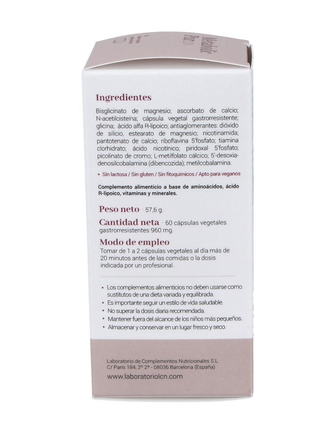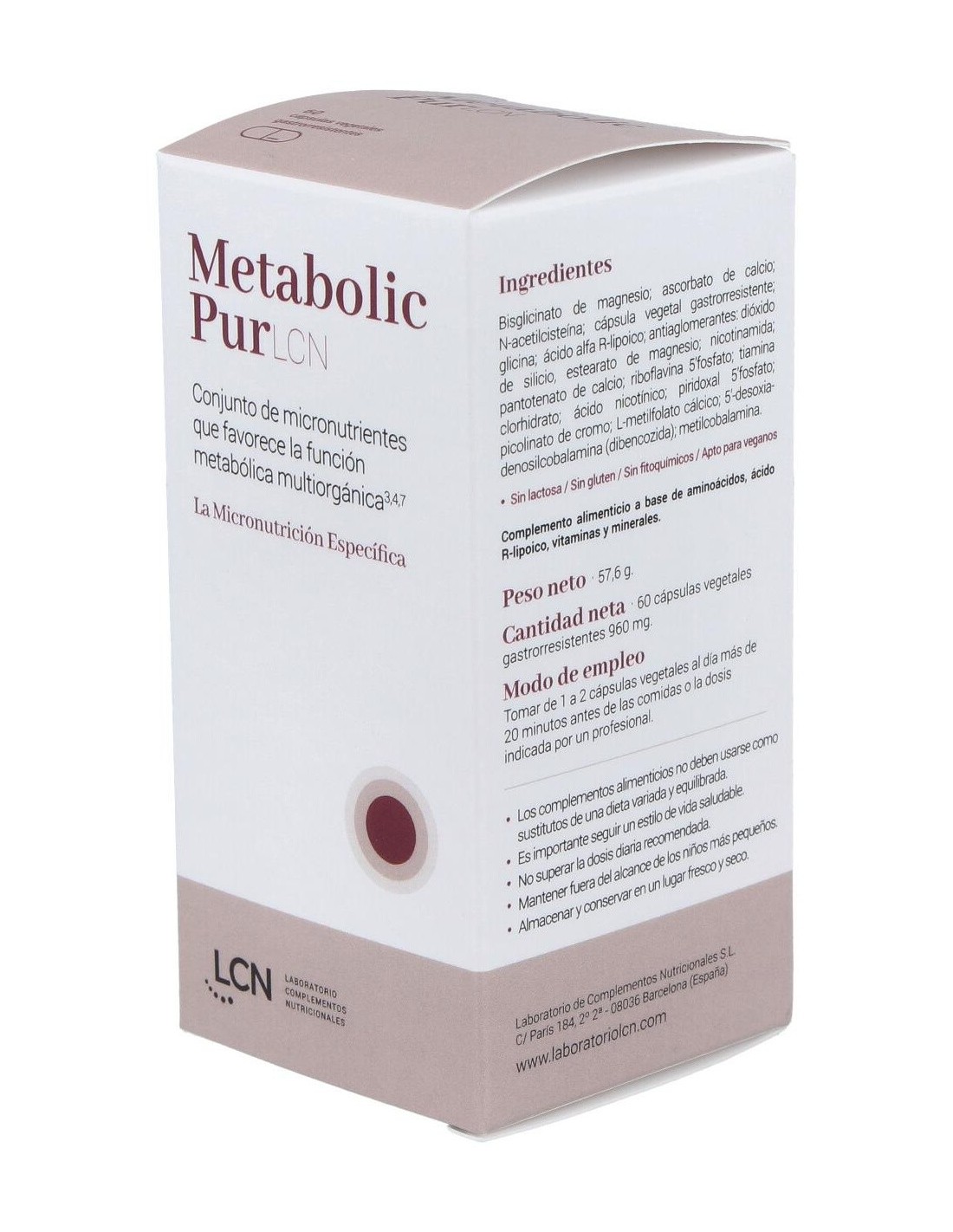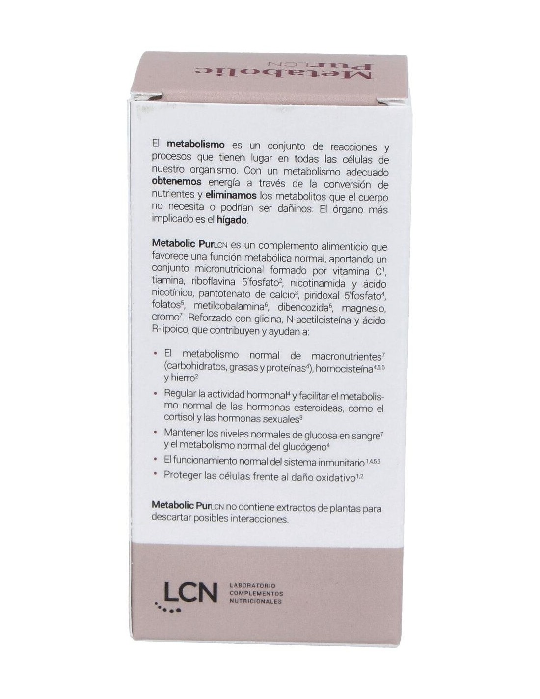 Conjunto de micronutrientes que favorece la función metabólica multiorgánica. El metabolismo es un conjunto de reacciones y procesos que tienen lugar en todas las células de nuestro organismo. Con un metabolismo adecuado obtenemos energía a través de la conversión de los nutrientes y eliminamos los metabolitos que el cuerpo no necesita o podrían ser dañinos, como los tóxicos ambientales y los procedentes de los alimentos. Los órganos encargados de eliminar los desechos son el hígado, riñón, intestino, pulmón y la piel, siendo el más importante el primero. Metabolic PurLCN favorece una función metabólica normal, aportando un conjunto micronutricional formado por vitamina C, tiamina, riboflavina 5fosfato, nicotinamida, ácido nicotínico, pantotenato de calcio, piridoxal 5fosfato, folatos, metilcobalamina, dibencozida, magnesio, cromo. Reforzado con glicina, N-acetilcisteína y ácido R-lipoico, que contribuyen y ayudan al metabolismo de macronutrientes (carbohidratos, grasas y proteínas6), homocisteína y hierro. Contribuye a regular la actividad hormonal y facilitar el metabolismo de las hormonas esteroideas, como el cortisol y las hormonas sexuales y a mantener los niveles normales de glucosa en sangre y el metabolismo normal del glucógeno. El funcionamiento normal del sistema inmunitario. Proteger las células frente al daño oxidativo. El funcionamiento normal del sistema nervioso. El mantenimiento de las mucosas en condiciones normales. Envase de 60 cápsulas.