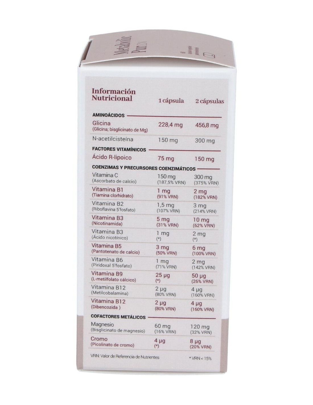 Composición activa por cápsula: 228,36 mg de L-glicina (L-glicina; bisglicinato de magnesio). 150 mg de N-acetilcisteina. 75 mg de Ácido R-Lipoico. 150 mg de ascorbato de calcio (vitamina C). 1 mg de tiamina clorhidrato (vitamina B1). 1,5 mg de riboflavina 5´fosfato (vitamina B2). 5 mg de nicotinamida (vitamina B3). 1 mg de ácido nicotínoico (vitmaina B3). 3 mg de pantotenato de calcio (vitamina B5). 1 mg de piridoxal 5fosfato (vitamina B6). 25 mcg de L-metilfolato cálcico (vitamina B9). 2 mcg de metilcobalamina (vitamina B12). 2 mcg de dibencozida (vitamina B12). 60 mg de bisglicinato de magnesio (magnesio). 4 mcg de picolinato de cromo (cromo).