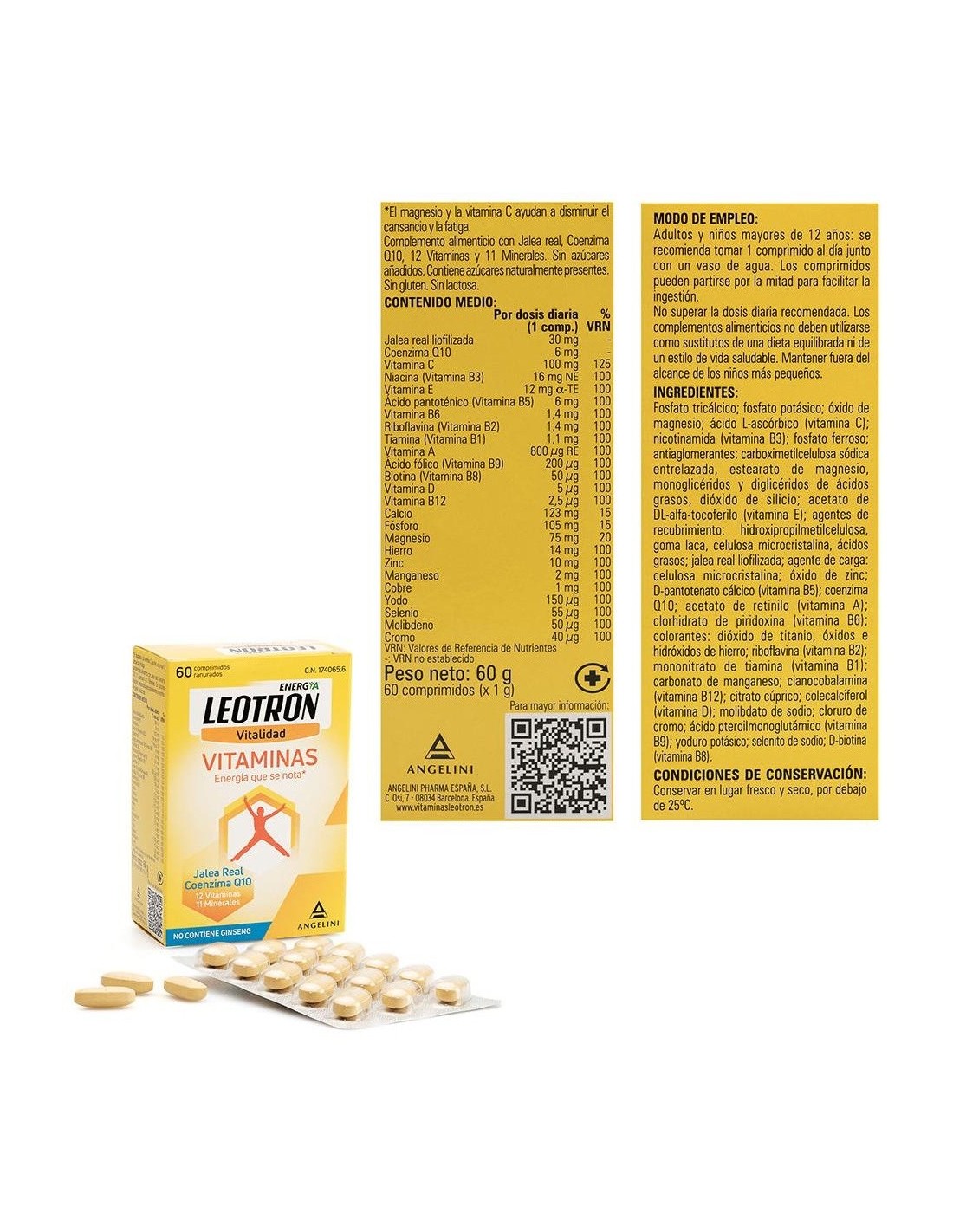 Por 1 comprimido:\ Jalea Real liofilizada (30mg), Coenzima Q10 (6mg), Vitamina C (100mg), Vitamina B3 (16mg), Vitamina E (12mg), Vitamina B5 (6mg), Vitamina B6 (1,4mg), Vitamina B2 (1,4mg), Vitamina B1 (1,1mg), Vitamina A (800µg), Ácido fólico (200µg), Vitamina B8 (50µg), Vitamina D (5µg), Vitamina B12 (2,5µg), Calcio (123mg), Fósforo (105mg), Magnesio (75mg), Hierro (14mg), Zinc (10mg), Manganeso (2mg), Cobre (1mg), Yodo (150µg), Selenio (55µg), Molibdeno (50µg), Cromo (40µg)