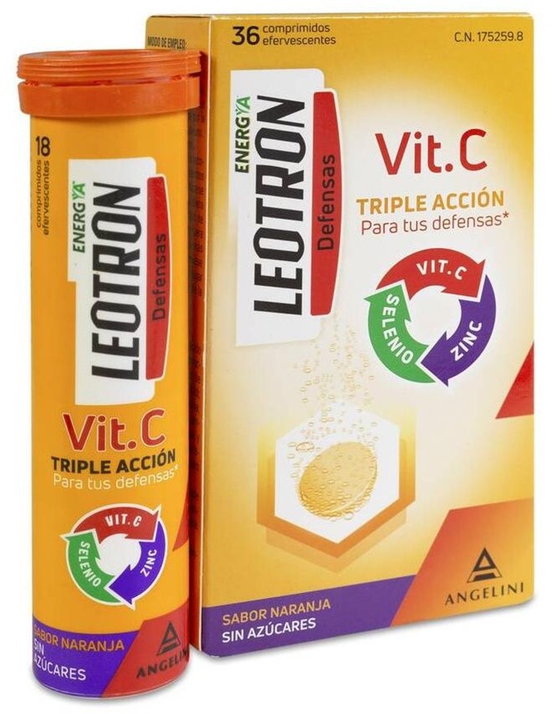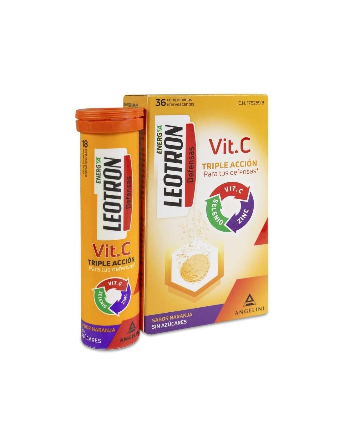 Comprimidos efervescentes de agradable sabor a naranja y sin azúcares con triple acción para las defensas: La vitamina C, el zinc y el selenio contribuyen al funcionamiento normal del sistema inmunitario y a la protección de las células frente al daño oxidativo. Para adultos y niños a partir de 12 años.