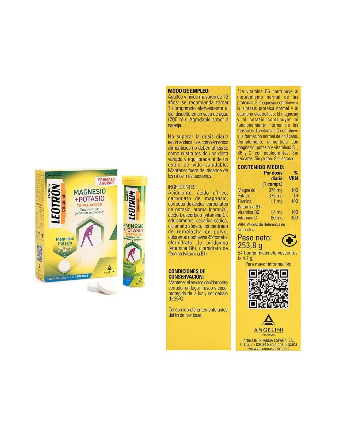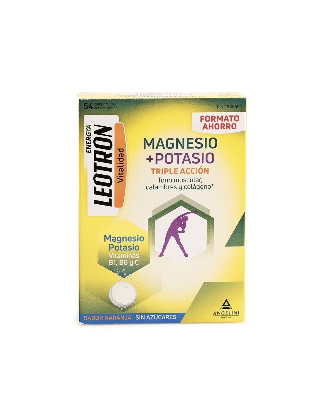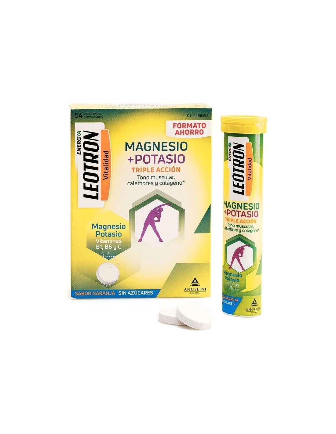 Comprimidos efervescentes de sabor naranja y sin azúcares con triple acción. El magnesio y el potasio contribuyen al funcionamiento normal de los músculos. El magnesio ayuda a la síntesis proteica normal y al equilibrio electrolítico. La vitamina C contribuye a la formación normal de colágeno. La vitamina B6 ayuda al metabolismo normal de las proteínas.