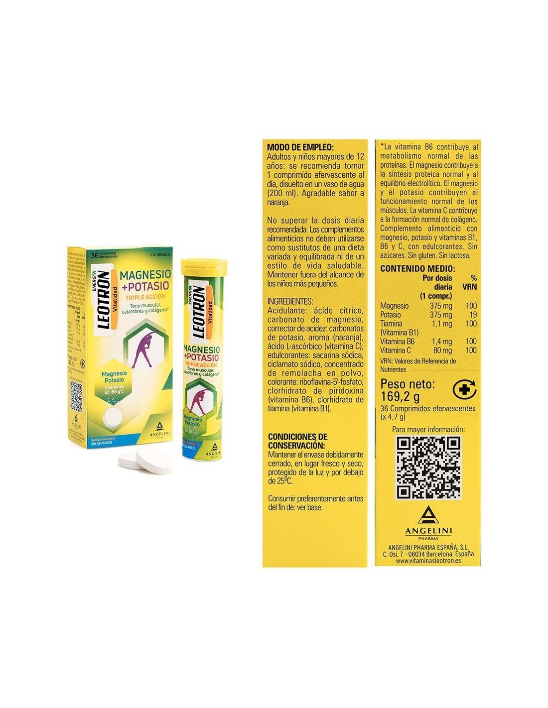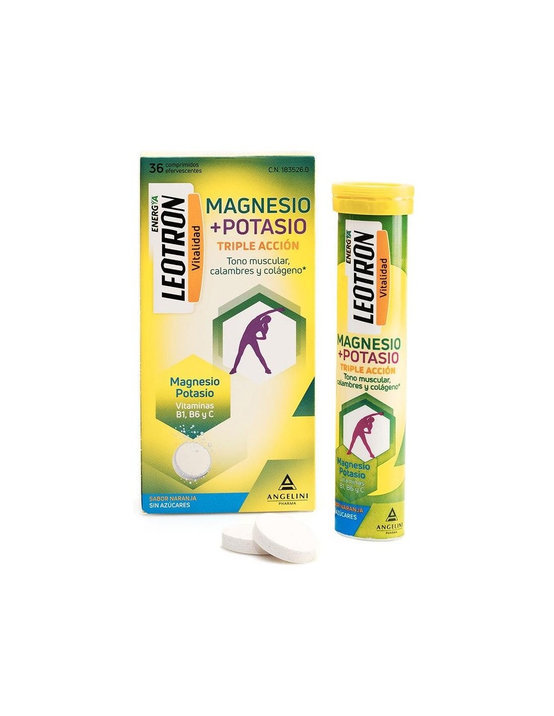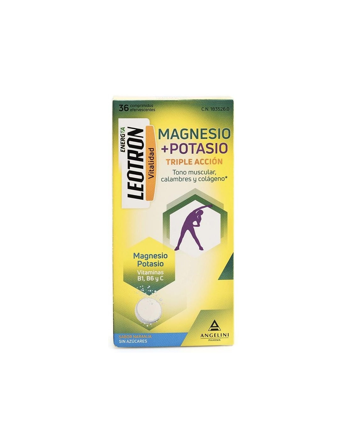 Comprimidos efervescentes de sabor naranja y sin azúcares con triple acción. El magnesio y el potasio contribuyen al funcionamiento normal de los músculos. El magnesio ayuda a la síntesis proteica normal y al equilibrio electrolítico. La vitamina C contribuye a la formación normal de colágeno. La vitamina B6 ayuda al metabolismo normal de las proteínas.