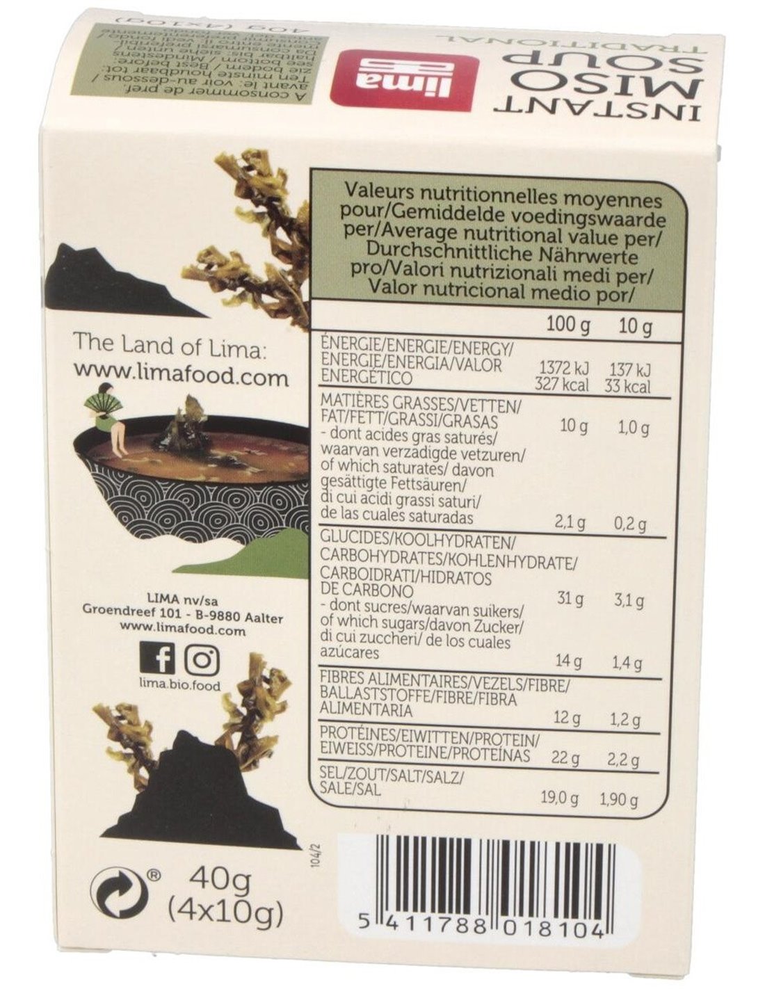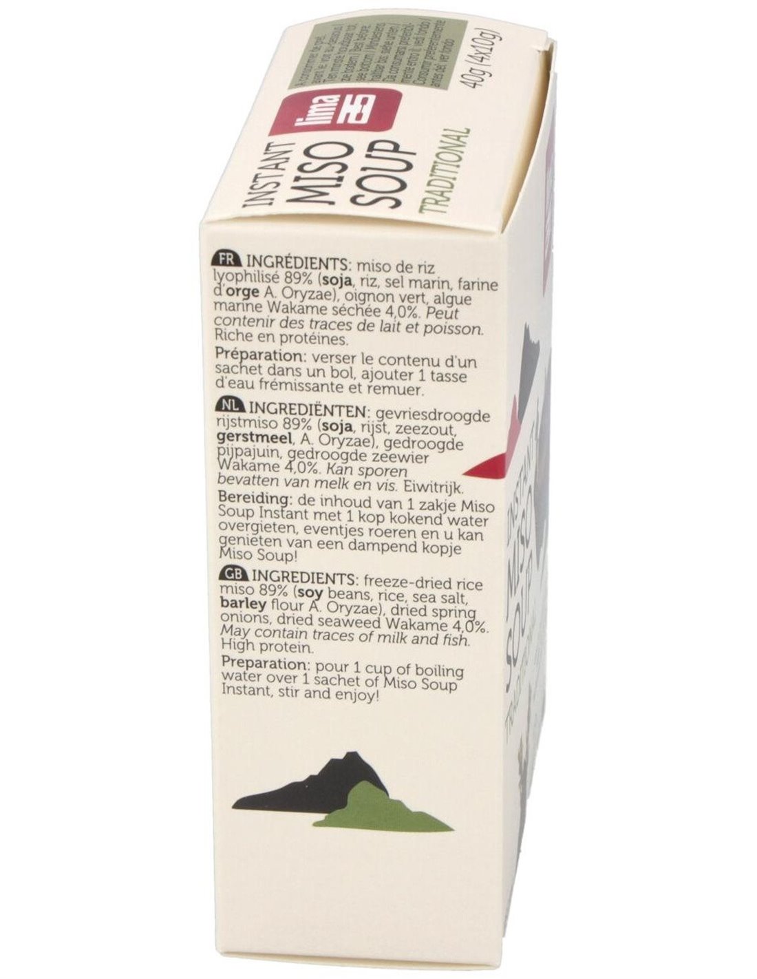 Ingredientes:Miso de arroz liofilizado 89% (soja, arroz, CEBADA, sal marina, A. Oryzae), cebolletas secas, alga wakame 4%.Valor nutricional por 100 gr