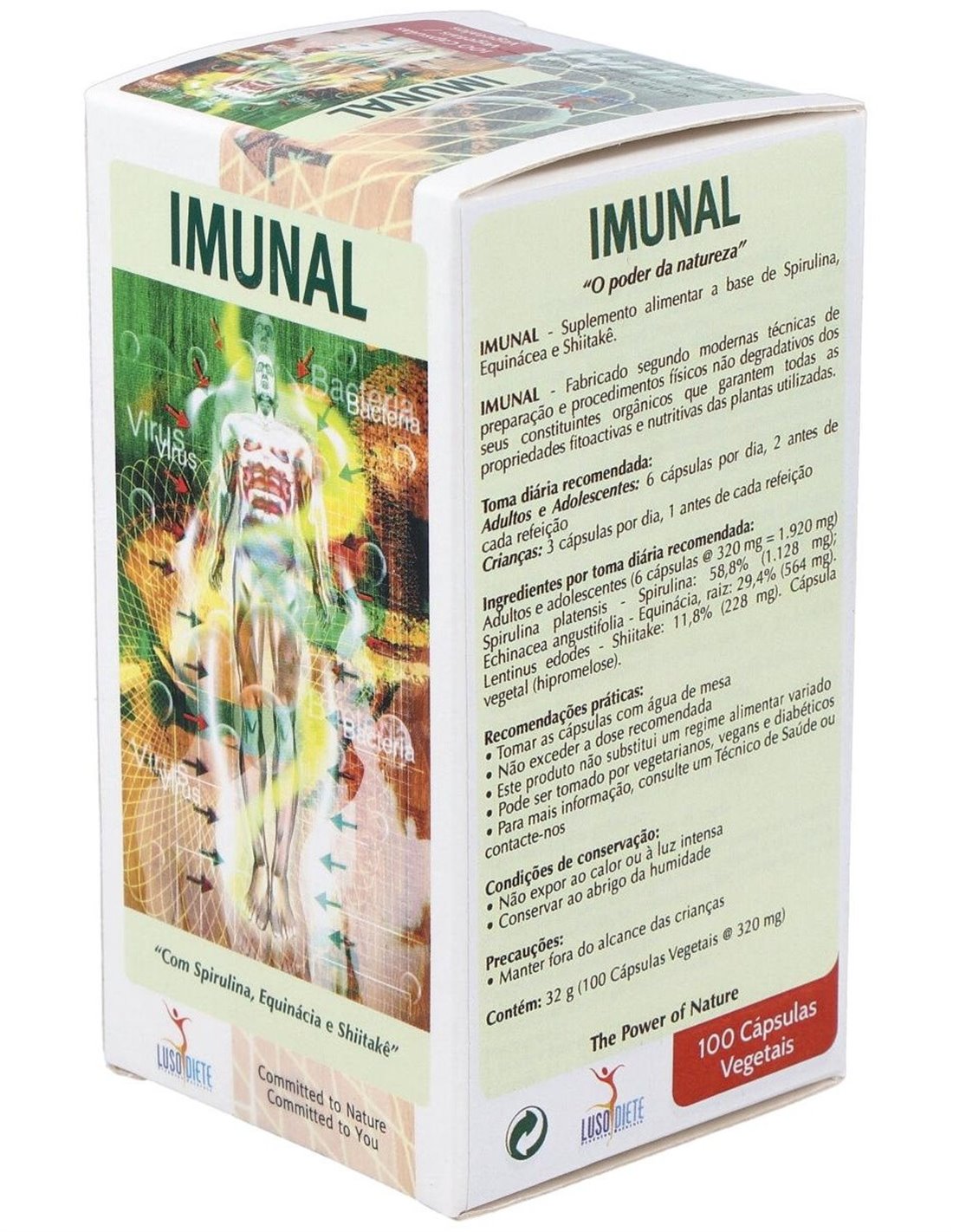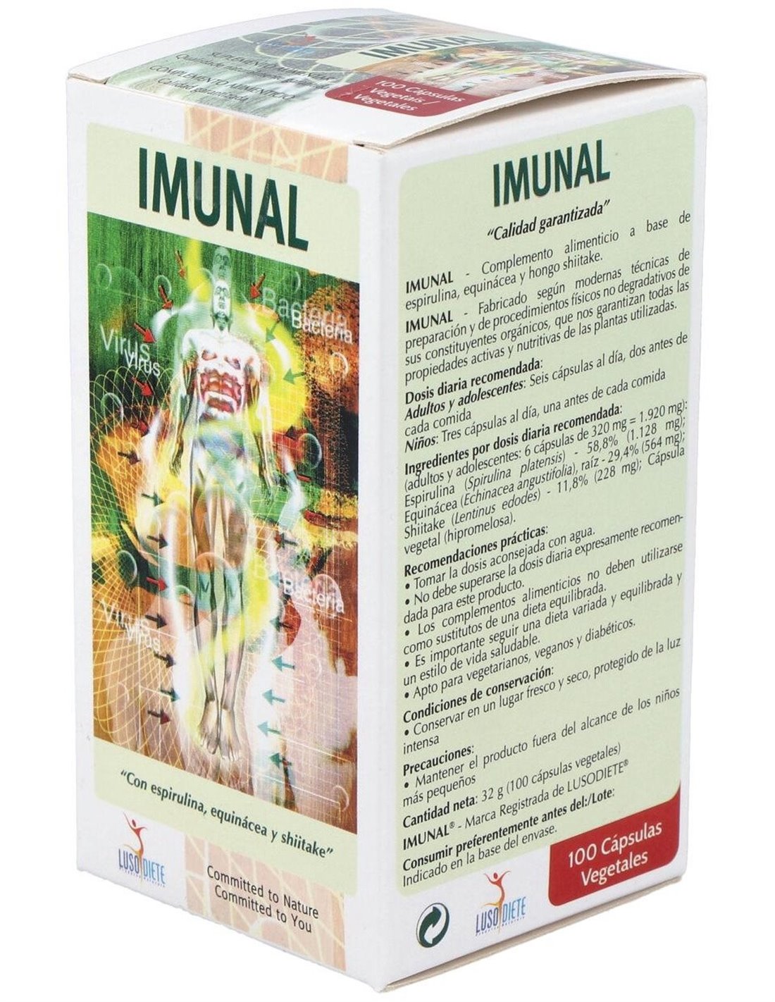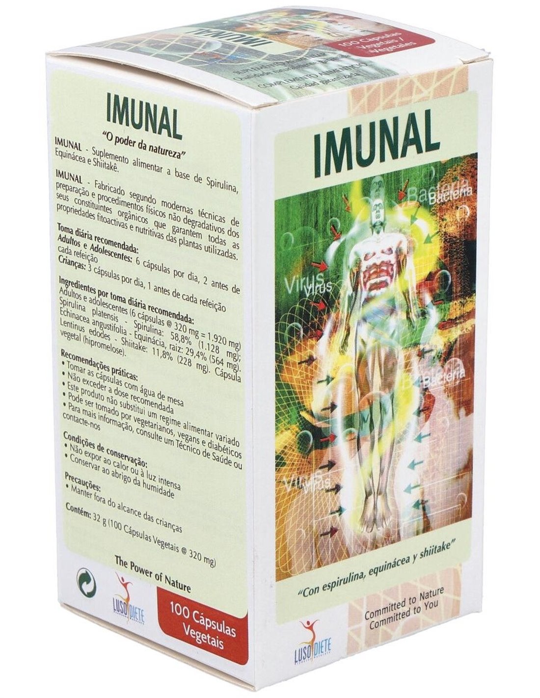 Imunal de Lusodiete es un complemento alimenticio es rico en proteínas, aminoácidos y ácidos grasos esenciales como el ácido linolénico y y- linolénico (precursor de la vit F.), betacaroteno (un poderoso antioxidante y precursor de la vitamina A), vitaminas (vit. E, vit. B1, vit B2, vit. PP, vit. D, vit. C, vit. B12, vit. K), minerales y oligoelementos (calcio, fósforo, magnesio, hierro, zinc, cobre, manganeso, sodio, potasio y selenio), ficocianina, equinacósido y más de treinta enzimas y polisacáridos diferentes, entre ellos los lentinanos.La espirulina, biomasa obtenida a partir de microalgas obtenida por procesos no degradativos, es rica en aminoácidos esenciales, sales minerales y oligoelementos como selenio y calcio (contiene alrededor de 26 veces más calcio que la leche); es capaz de promover la producción de nuevas células y regenerar la flora intestinal, especialmente los lactobacilos y las bifidobacterias. La raíz de la equinácea es rica en equinacósidos y polisacáridos. El shiitake, es rico en polisacáridos (lentinanos), aminoácidos esenciales y eritadenina (derivado de adenosina).Composición activa por 6 cápsulas: