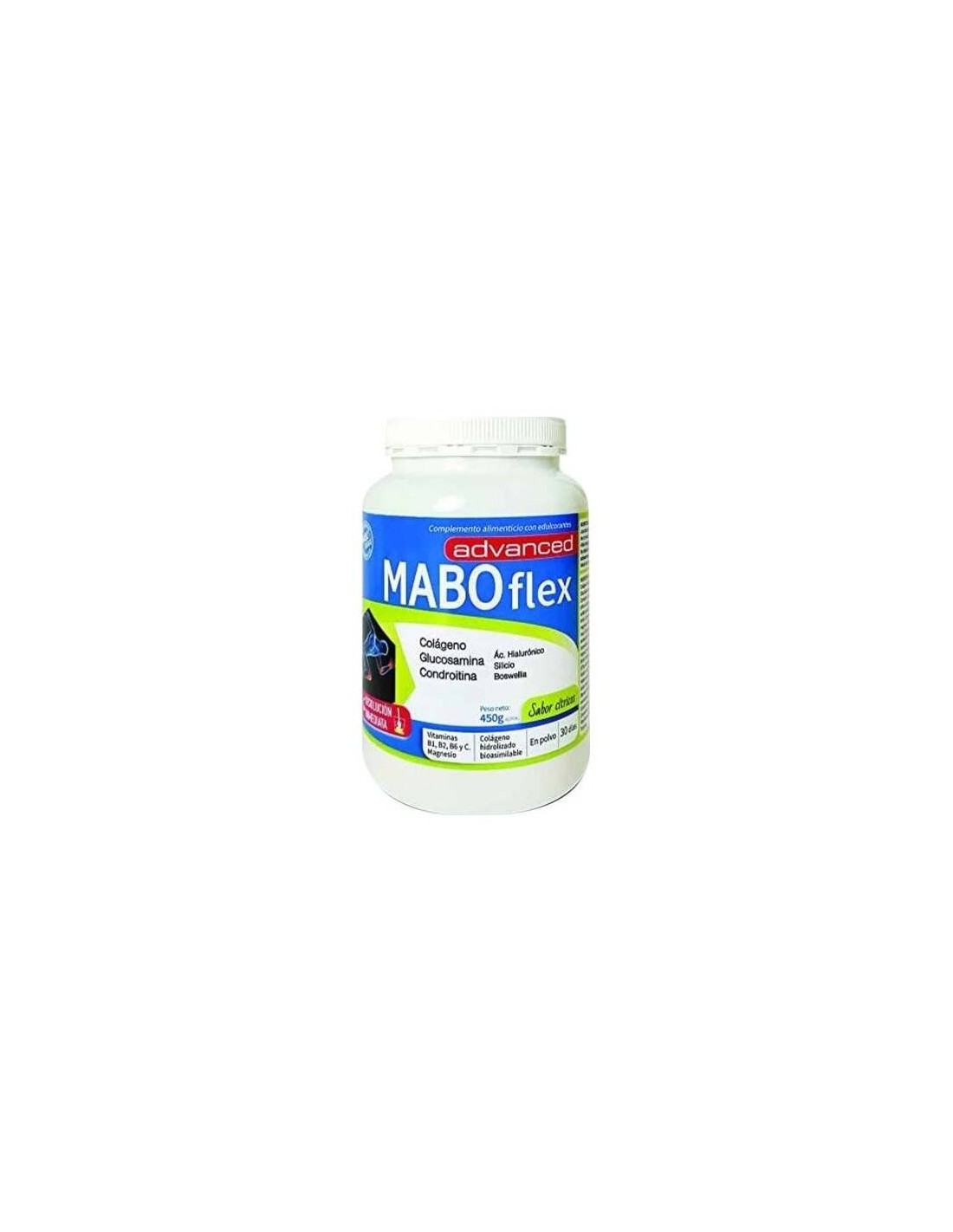 MABOflex advanced es un complemento alimenticio con colágeno hidrolizado bioasimilable, ácido hialurónico, magnesio y vitaminas B1, B2, B6 y C., y que además incorpora en su fórmula glucosamina, condroitin sulfato, silicio y Boswellia Serrata, componentes sinérgicosde ayuda en caso de fatiga muscular y articular. De disolución inmediata. Sabor a cítricos.
