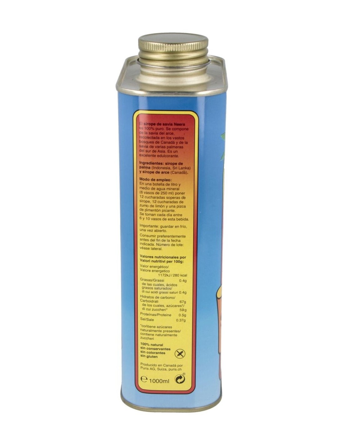 El sirope de savia es la base para realizar la cura de savia y zumo de limón. La fórmula del sirope de savia es un mezcla equilibrada de minerales y azúcares, por lo que se siguen aportando al organismo los nutrientes básicos para su funcionamiento. Se puede realizar una cura de desintoxicación completa, durante 7 a 10 días o un semi-ayuno hasta 30 días. Ingredientes:Sirope de palma (Indonesia, Sri Lanka) y sirope de arce (Canadá). Modo de empleo:En una botella de litro y medio se ponen 12 cucharadas soperas de sirope de savia, 12 cucharadas de limón y una pizca de cayena picante. Se toman cada día entre una y dos botellas del preparado. Presentación:Envase metálico de 1 litro.Recomendaciones y advertencias:No contiene conservantes, colorantes ni gluten. Mas información de la Cura de Ayuno