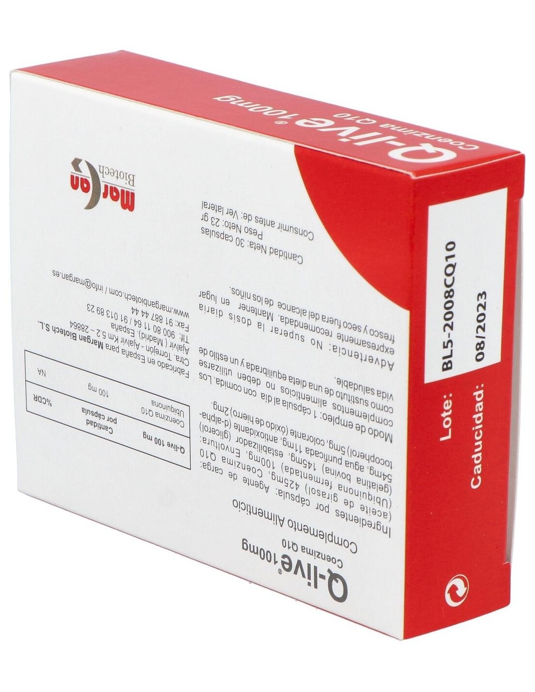 Ingredientes:Agente de carga:(aceite de girasol) 425 mg, Coenzima Q10 (Ubiquinona fermentada) 100 mg, Envoltura: (gelatina bovina) 145 mg, estabilizador (glicerol) 54 mg, agua purificada 11 mg, antioxidante (d-alphatocopherol) 5 mg, colorante (óxido de hierro) 2 mg. Modo de empleo:Tomar 1 cápsula al día con una comida. Presentación:Envase de 30 cápsulas.