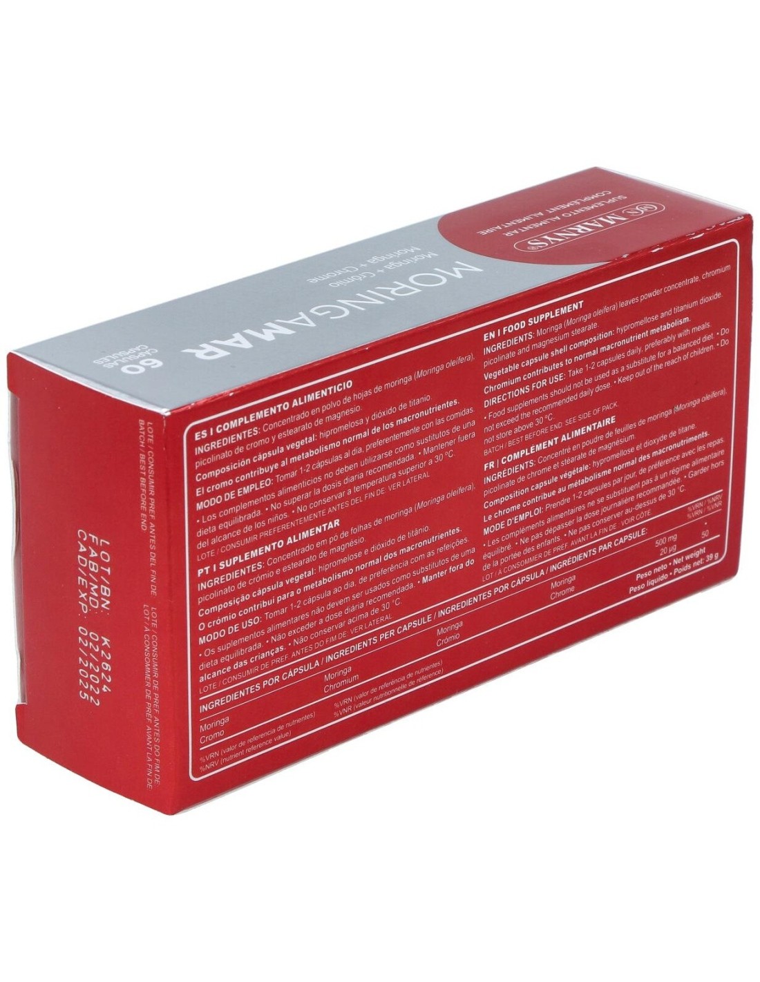 - Contiene extracto de moringa, reconocido por su aporte en nutrientes esenciales que contribuyen a una dieta equilibrada.