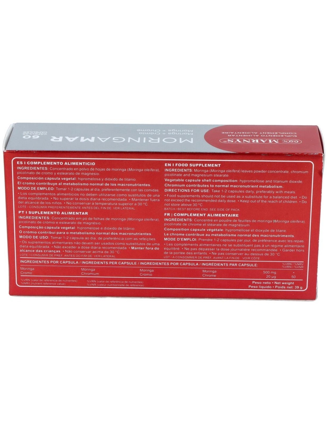 Moringamar 60Cap. de Marnys es un complemento alimenticio diseñado para personas que buscan apoyar su bienestar diario mediante ingredientes naturales. Su formulación está pensada para integrarse fácilmente en rutinas de cuidado personal enfocadas en mantener un equilibrio saludable.
